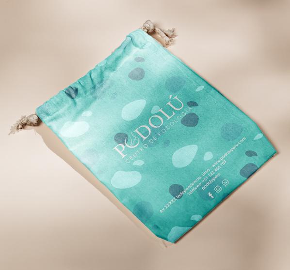 Diseño de bolsas de tela reutilizables, como parte del merchandisign de la marca Podolú, para entregar productos como medicamentos, cremas, etc; teniendo dos tipos de presentaciones, celeste corporativo y blanco con detalles en colores.