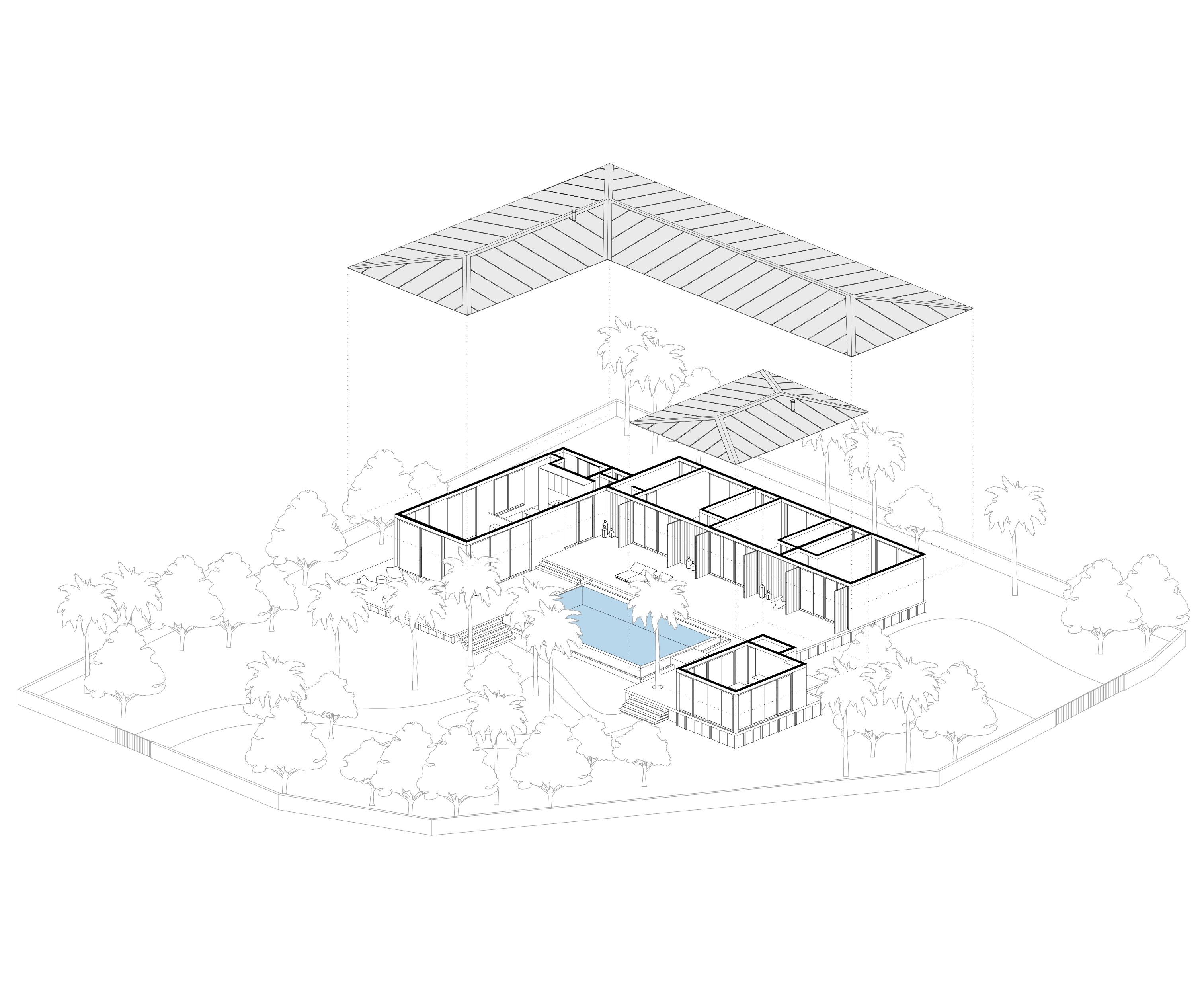 Located in the woods near a paradisiacal beach in the Peninsula of Maraú, northeast coast of Brazil, this project is vacation one-story house for a family but also serves as a business of short-term rentals, which was the main reason for all of the rooms of the house being accessed independently through a wooden deck that surrounds the pool. Each bedroom has its own bathroom and there is a separated barbecue area to be enjoyed by the guests. The building structure is mixed type and the roof has a soft inclination with long eaves that are combined with the high ceiling and crossed ventilation that allows the interior to be fresh in the hot temperature of the region.
