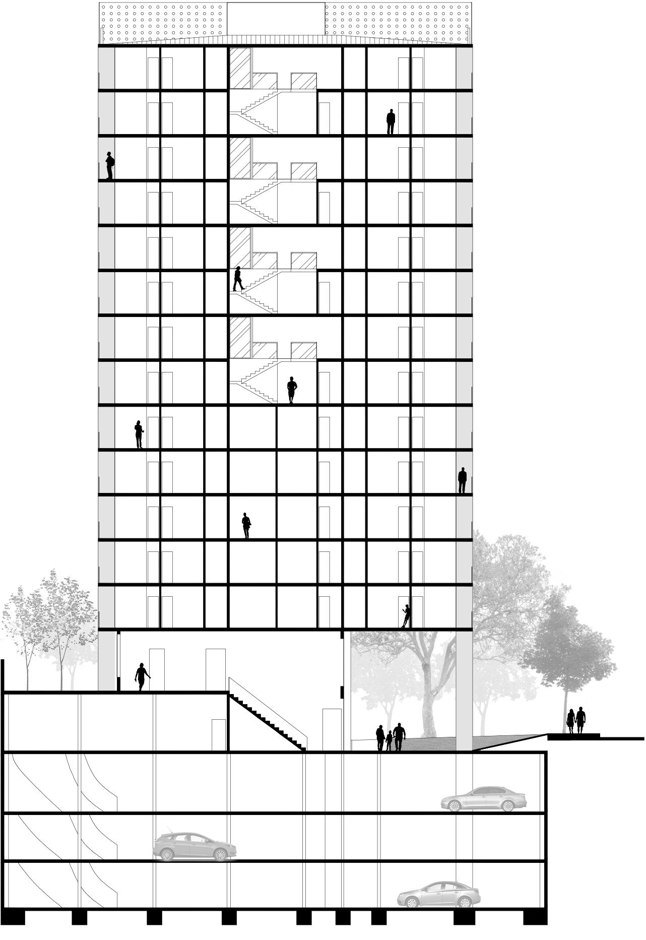 The project for a vertical building with a variety of apartment typologies, a commercial area and an inviting public space.