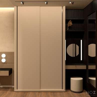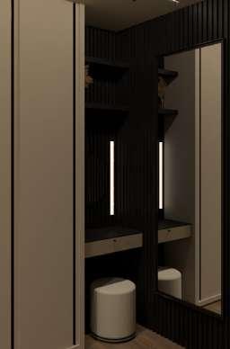 Projeto arquitetônico de interiores. Aproveitando a infraestrutura entregue pela construtora, optou-se por integrar o quarto com o closet para criar amplitude nos ambientes e não compartimentá-los. Os materias de acabamentos se conectam e criam um espaço único, pessoal e confortável.
