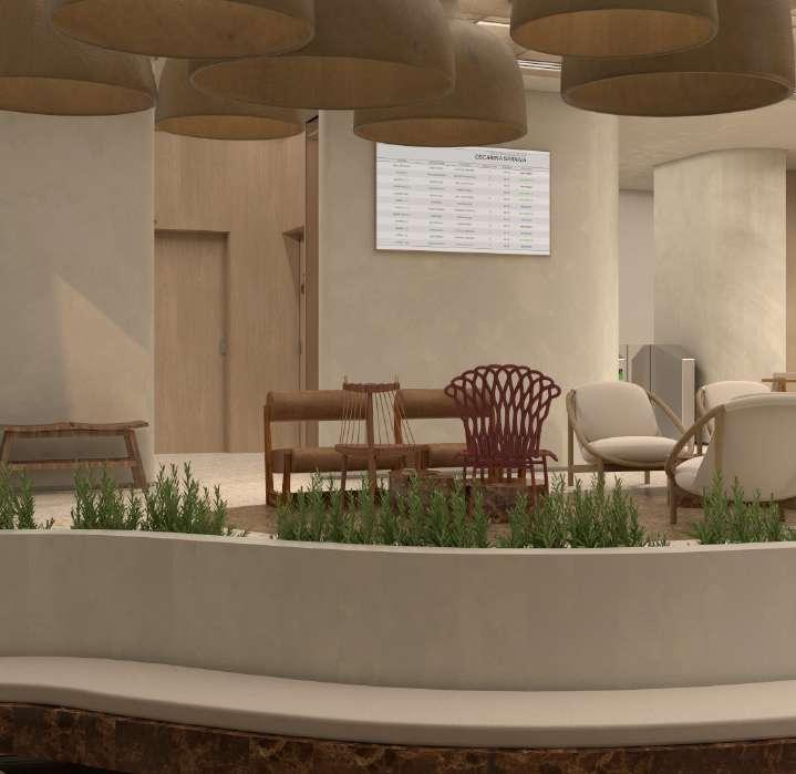 Na recepção, dividir o espaço de espera em dois níveis foi uma estratégia adotada para deixar o ângulo de visão do usuário que está adentrando livre e retirar a sensação de espaço muito cheio e com fila de espera longa, melhorando sua experiência. As formas simples e sinuosas, indicam o sentido de circulação das pessoas e, com a diferenciação entre os materiais, demarcam as áreas de estar e de circulação. O forro foi pensado para dar a sensação de ambiente externo e, em consonância com as vegetações, trazer um ar de quintal. Todas os mobiliários e peças decorativas são de designers e artesãos brasileiros e, em sua grande maioria, contemporâneos.