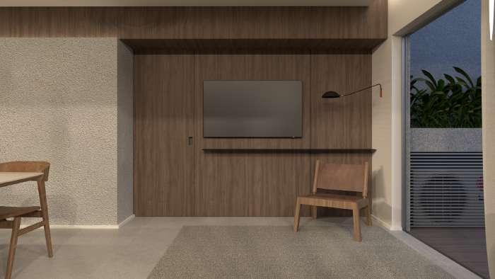 Projeto arquitetônico de interiores. Para a casa de um casal jovem, recém casado e que gosta de ceber, pensou-se em um ambiente que transmitesse leveza, mas também aconchego, e possibilitasse a total integração entre os usuários dos diferentes espaços de estar que essa sala conjugada com varanda gourmet possibilitou. A presença de texturas e cores que se repetem ao longo dos diferentes ambientes foram pensadas de forma proposital e pontual, conctando e ampliando os espaços.