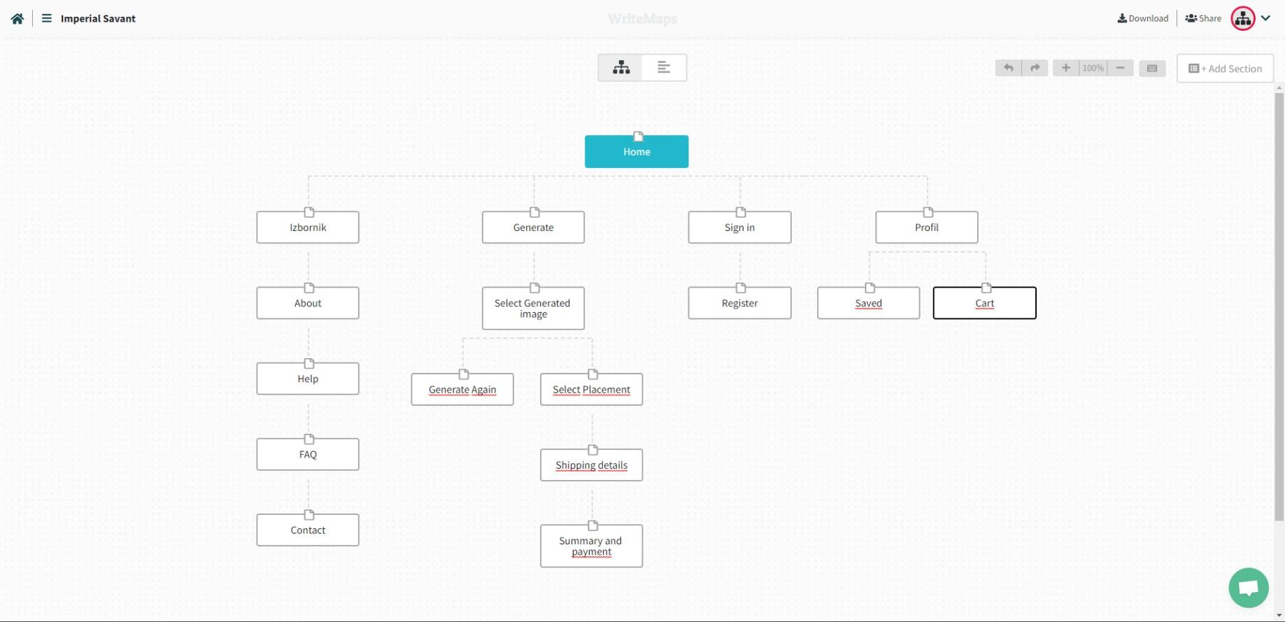 Slika: Mapa web stranica projekta izrađena pomoću https://writemaps.com/