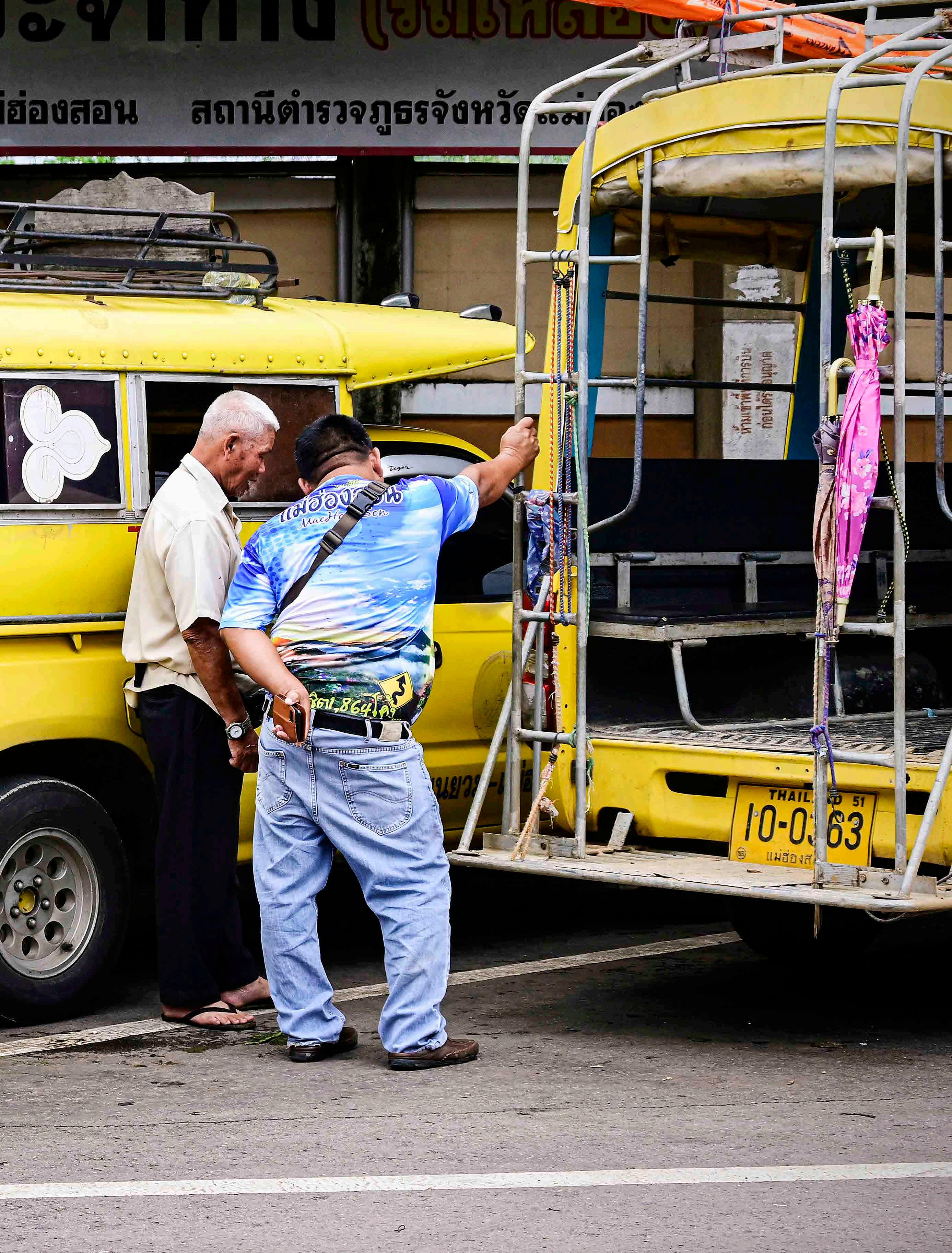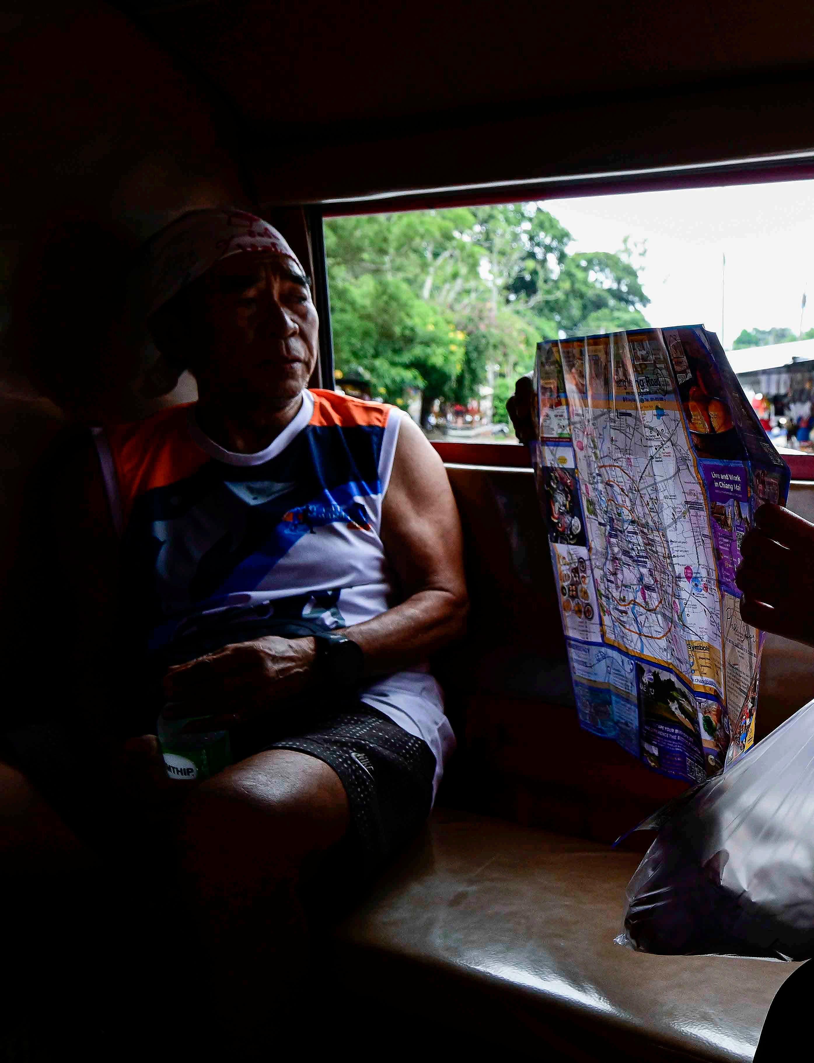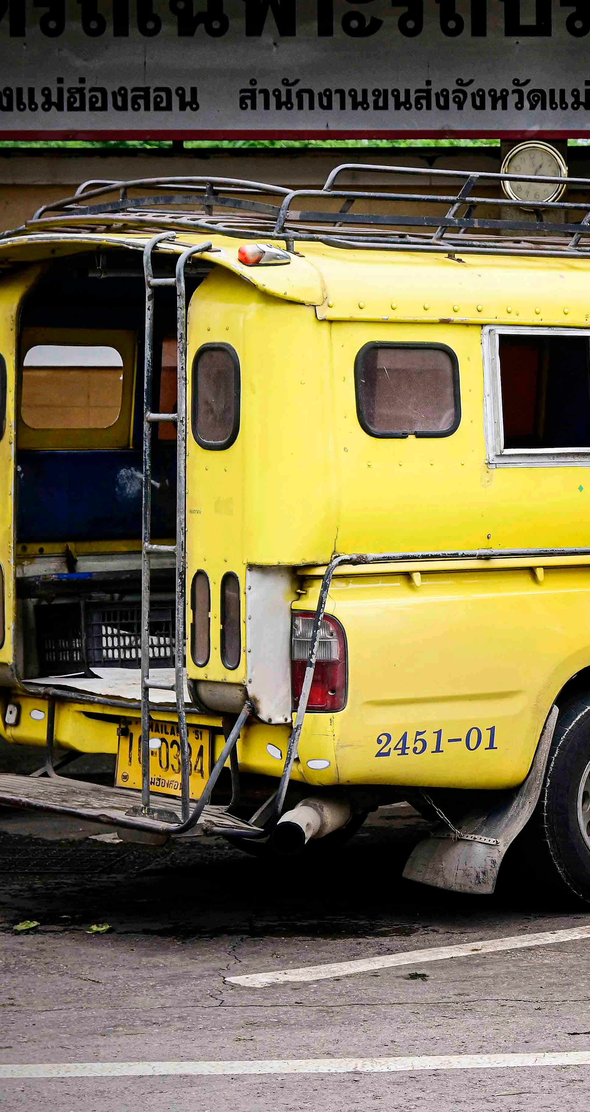No norte da Tailândia não há serviços formais de transporte público como ônibus de linha ou trens. O trajeto pelas estradas apertadas e sinuosas é feito a bordo de caminhonetes com caçambas adaptadas para o transporte de passageiros, os songthaews