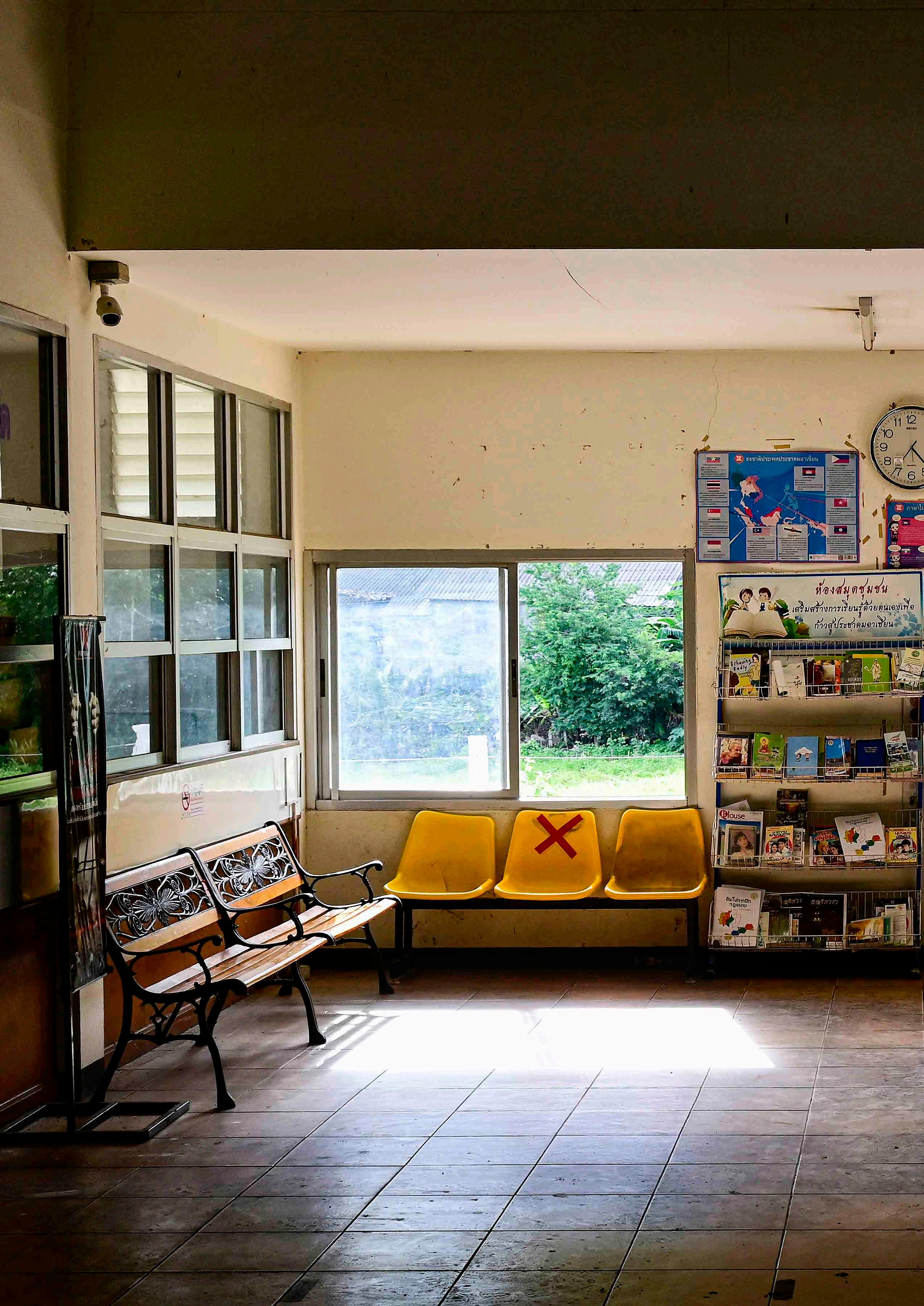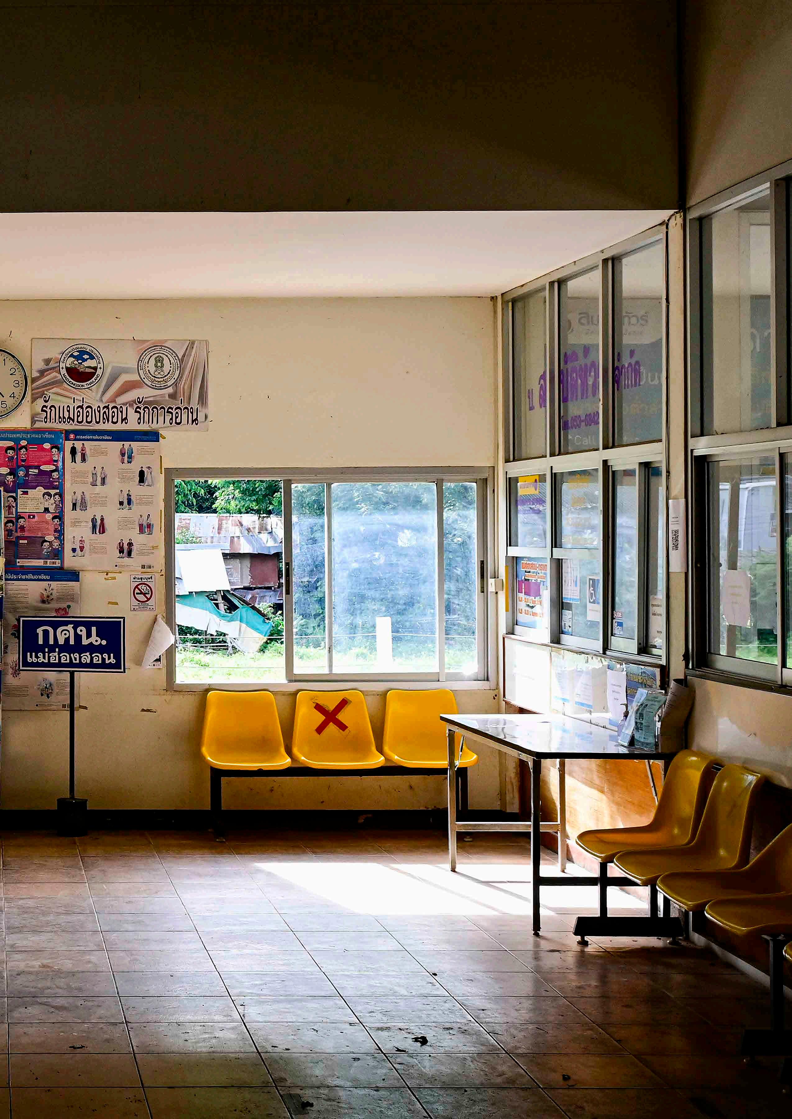 Um dos vários salões de espera por onde passamos nas rodoviárias asiáticas. Aqui, as cadeiras marcadas com “X” sinalizando ainda resquícios das ações preventivas da pandemia de COVID-19.