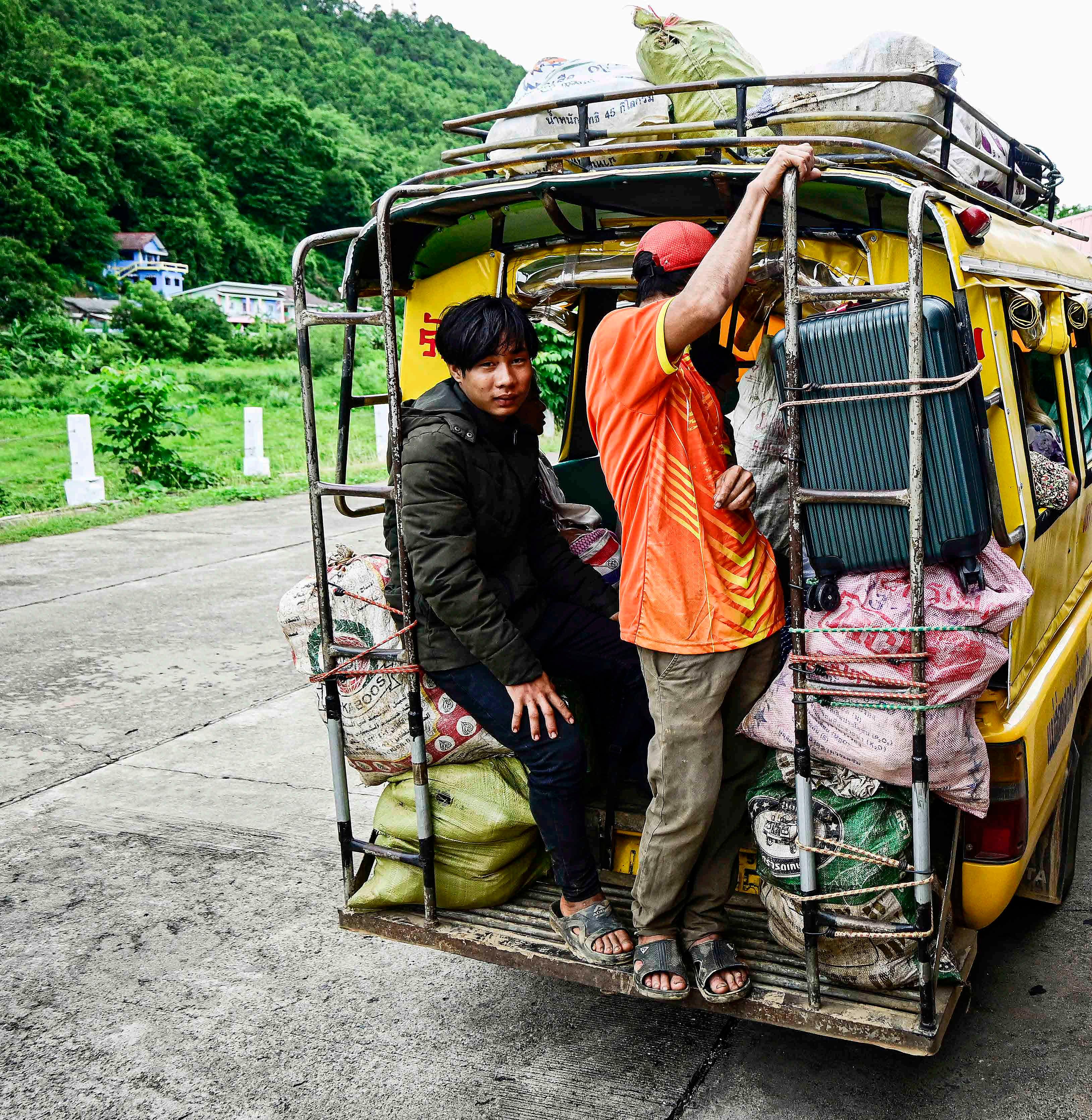 O songthaew carregado de pessoas, bagagens e produtos do campo chega em Mae Hong Son, partindo de Ban Rak Thai, no norte da Tailândia.