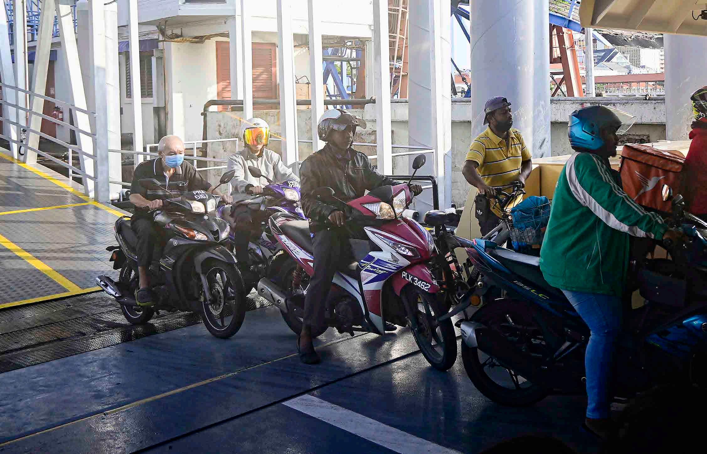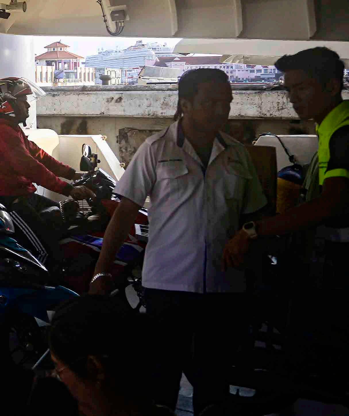 O ferry que conecta a península malaia à ilha de Penang é uma maneira rápida e barata de fazer a travessia. Não apenas pedestres, mas também carros e motos sobem ma bordo.