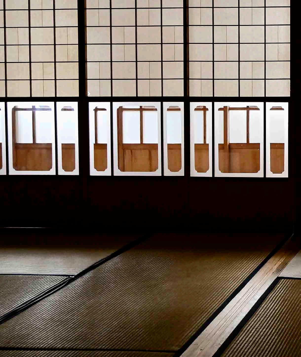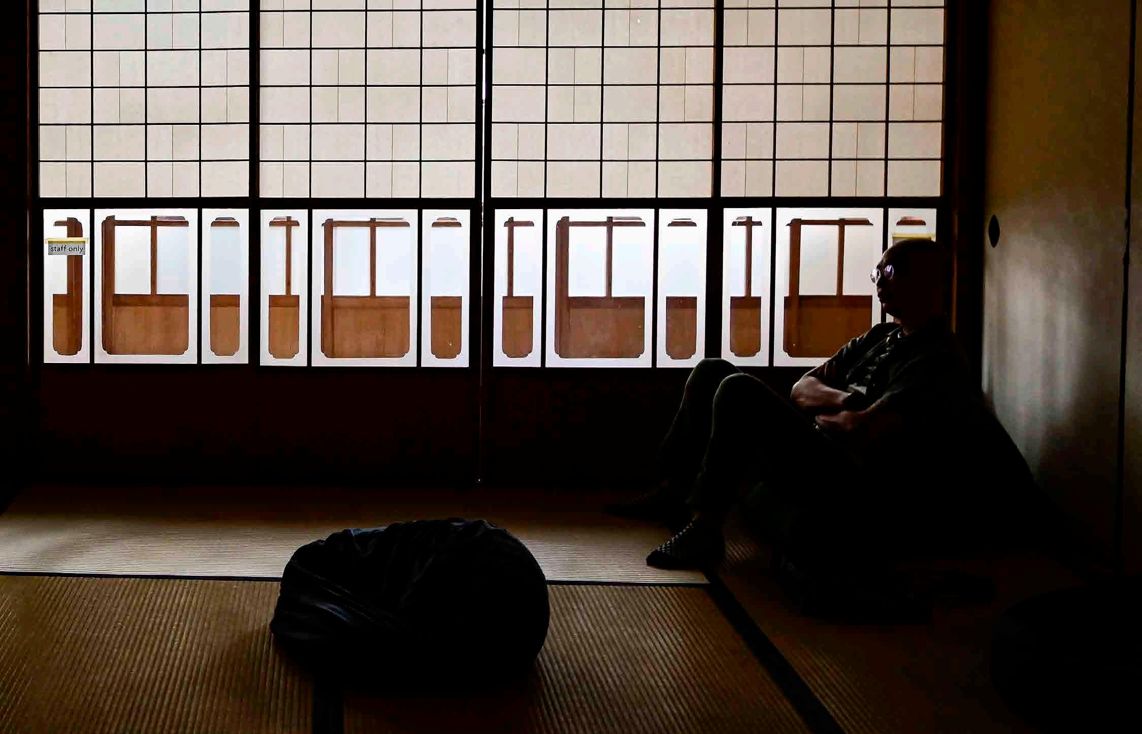 Mesmo uma sala de projeção de vídeo tem temas tipicamente japoneses neste museu de Kyoto.
