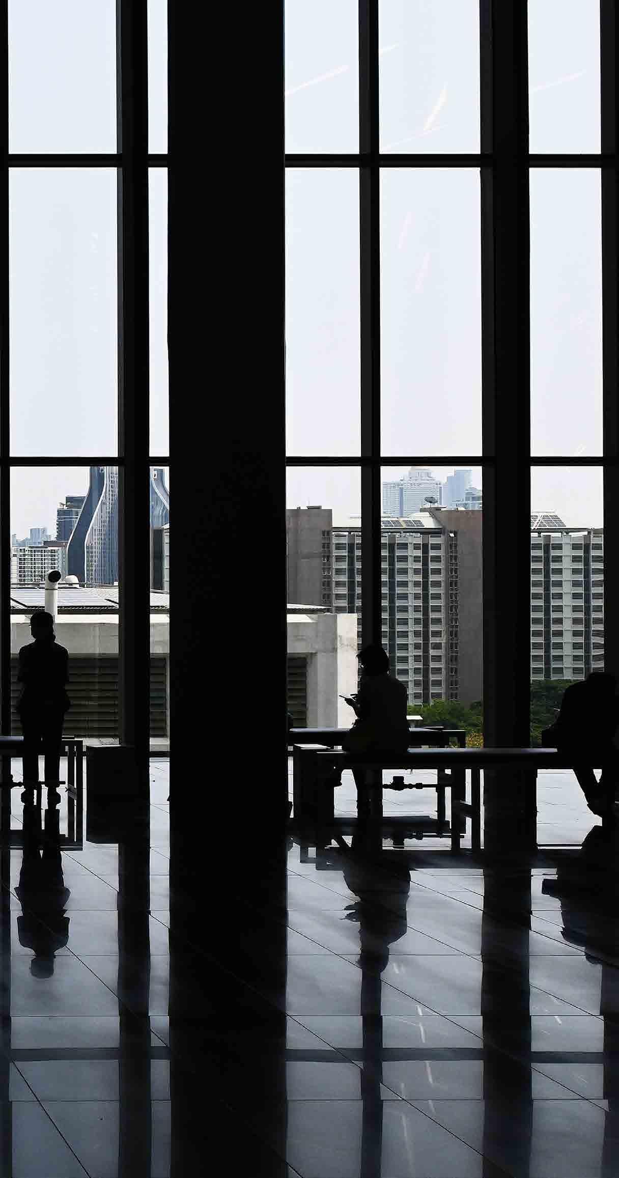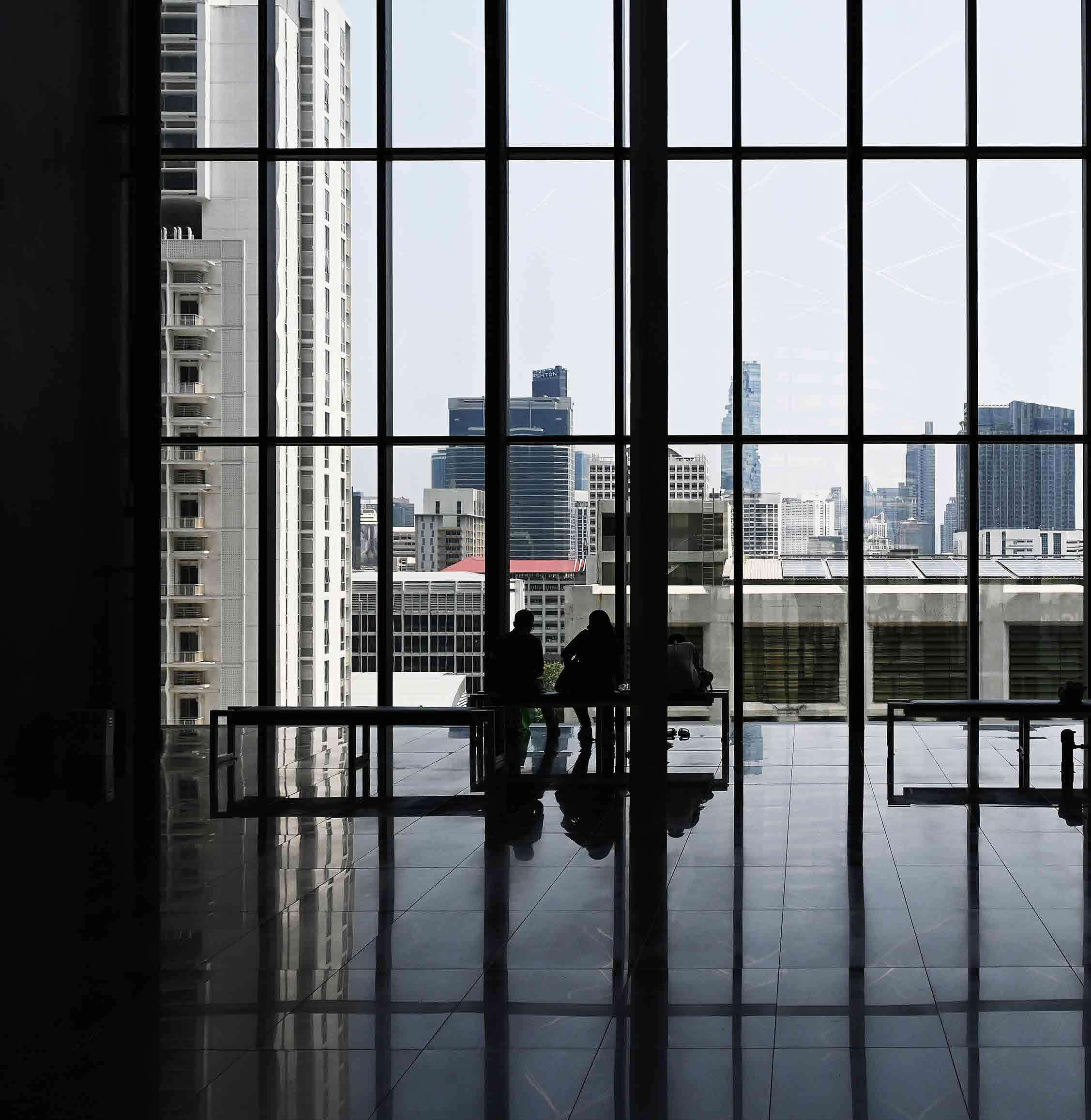 Do amplo salão no alto da torre do edifício Siamscape, em Siam, Bangkok, é possível ver o mar-de-prédios modernos.