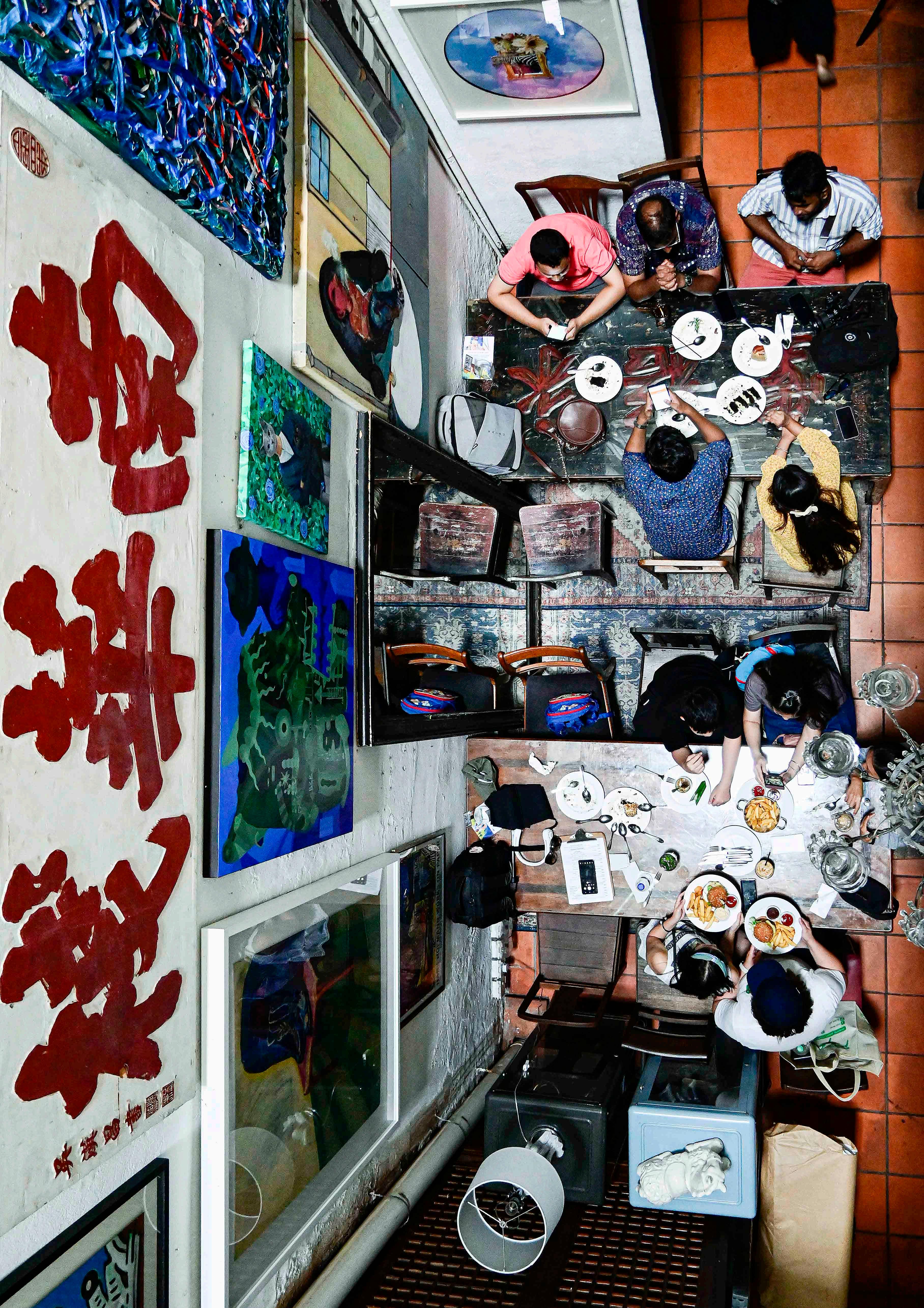 Acima, área dos restaurantes chiques do shopping Icon Siam, em Bangkok. À direita, bar / restaurante em Georgetown com decoração mista entre quadros modernos e elementos tradicionais chineses.