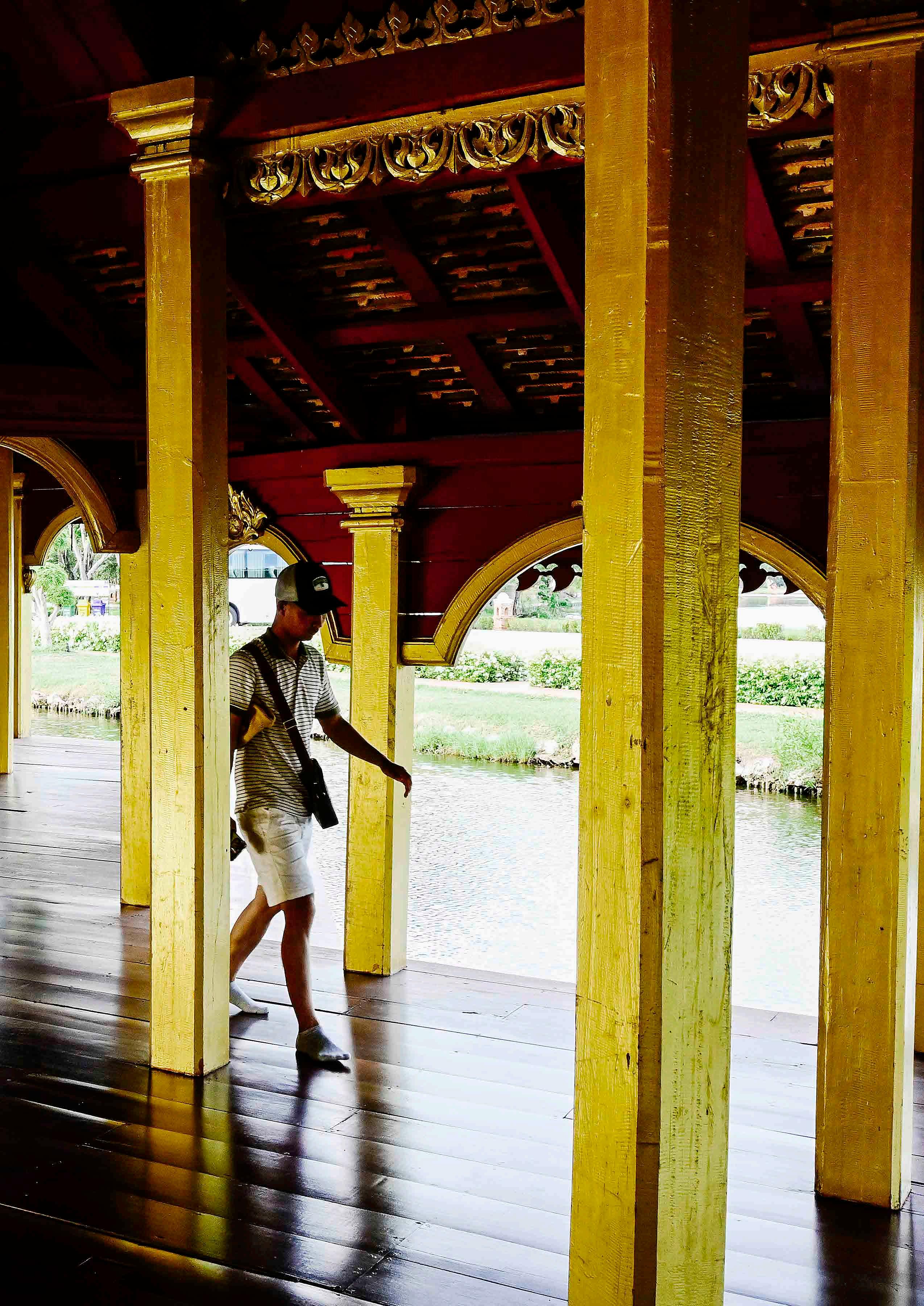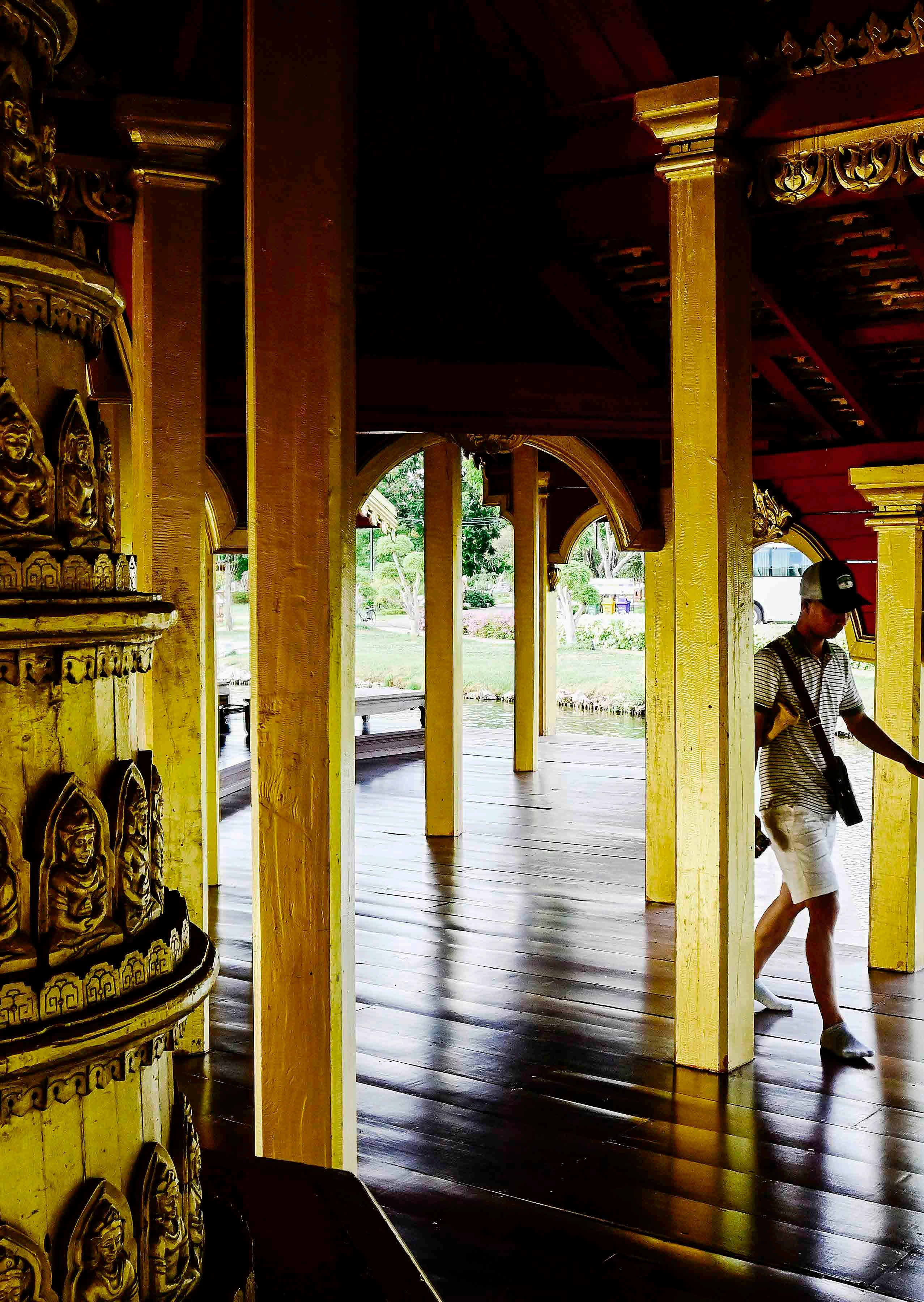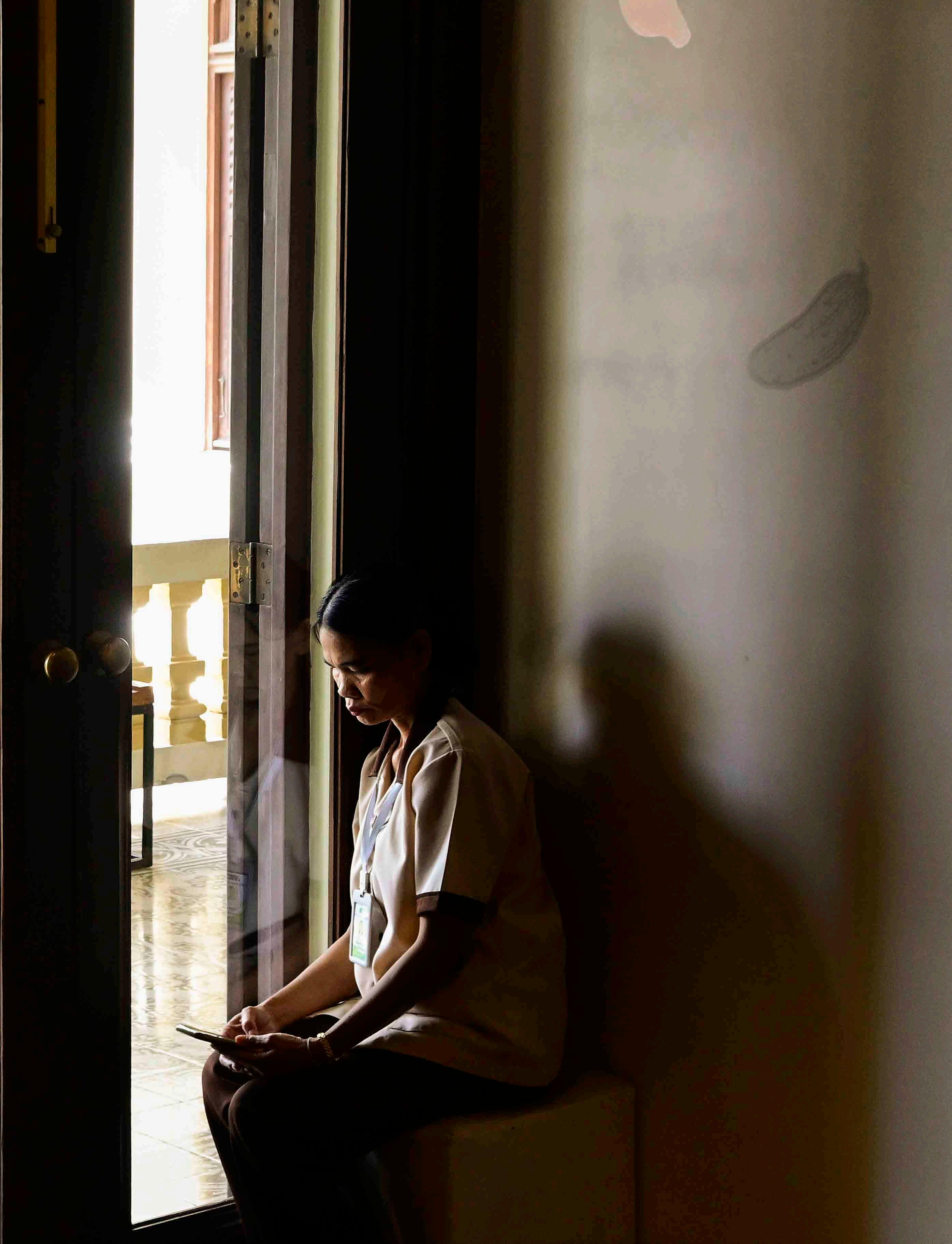 Neste momento, a partir de uma das salas do Museum of Siam, no centro de Bangkok, enquanto víamos uma exposição interessante sobre o conceito de thainess (ou, quais os elementos que definem a Tailândia e sua cultura) uma bela luz entrou pela porta de vidro, e ao olhar para ela vi esta mulher - uma das monitoras do museu - em um momento pacífico no canto da sala.