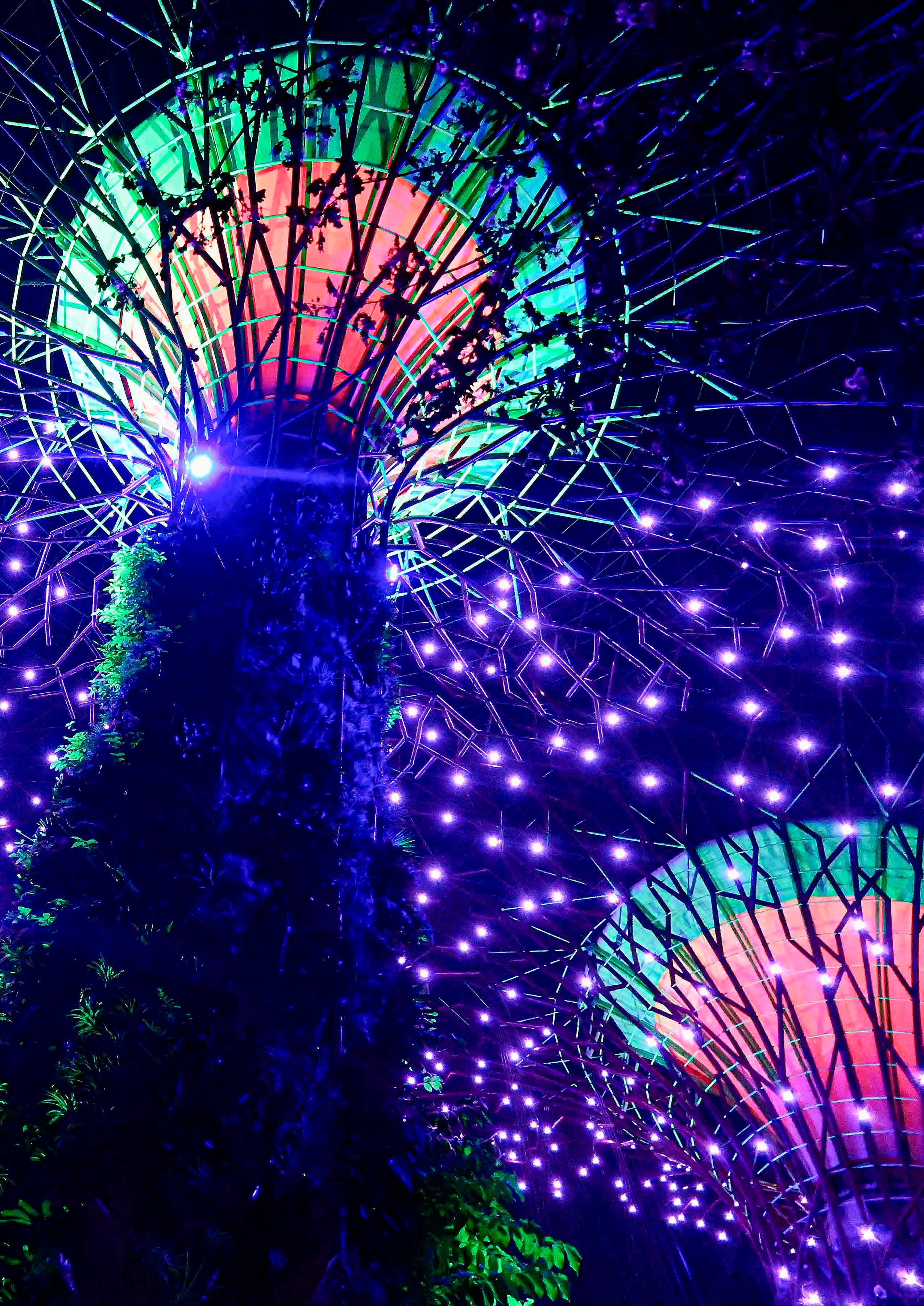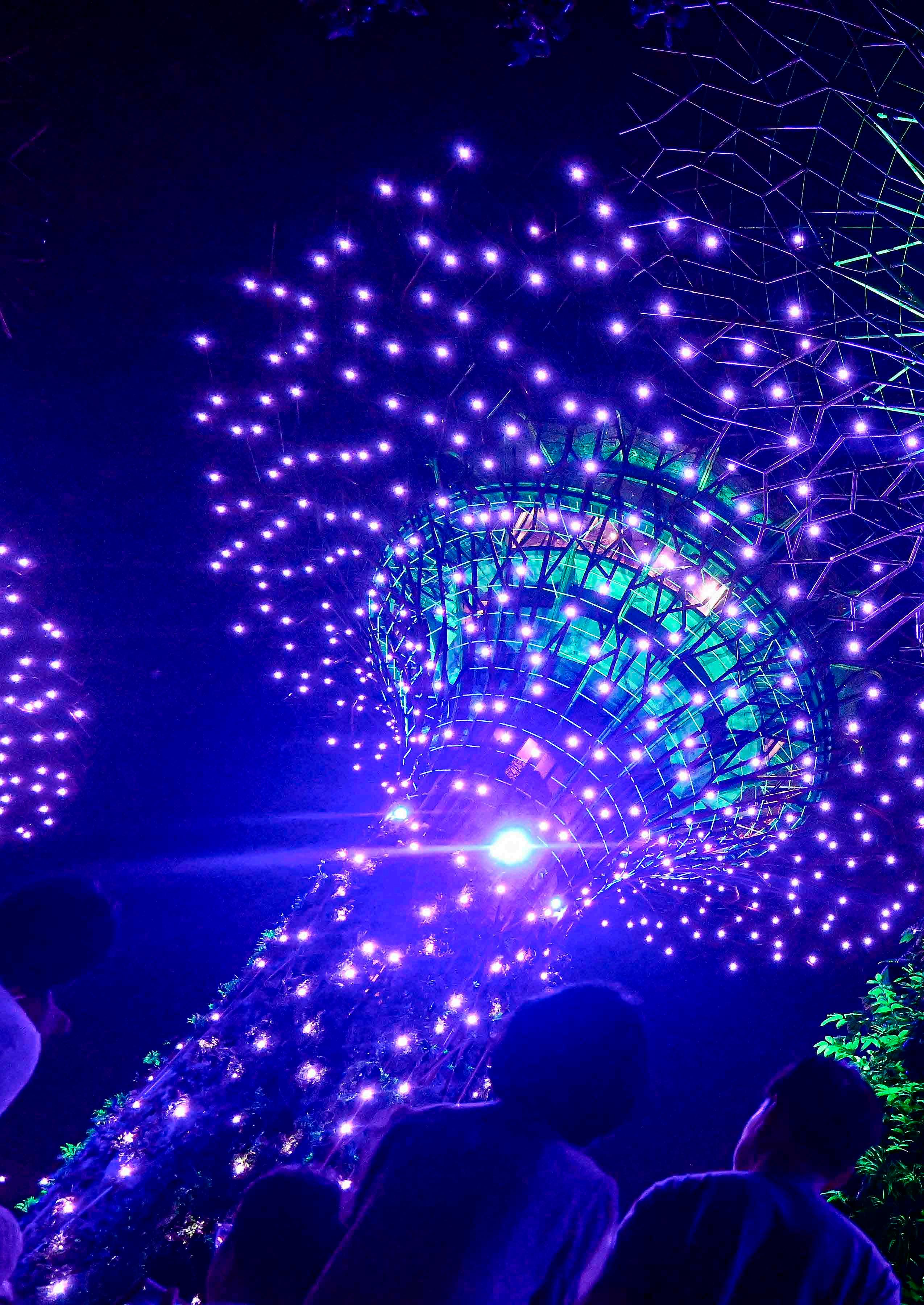 A floresta artificial em meio ao parque Gardens at the Bay em Singapura, já é fantástica por si só. À noite, ganha um espetáculo de luzes e música.