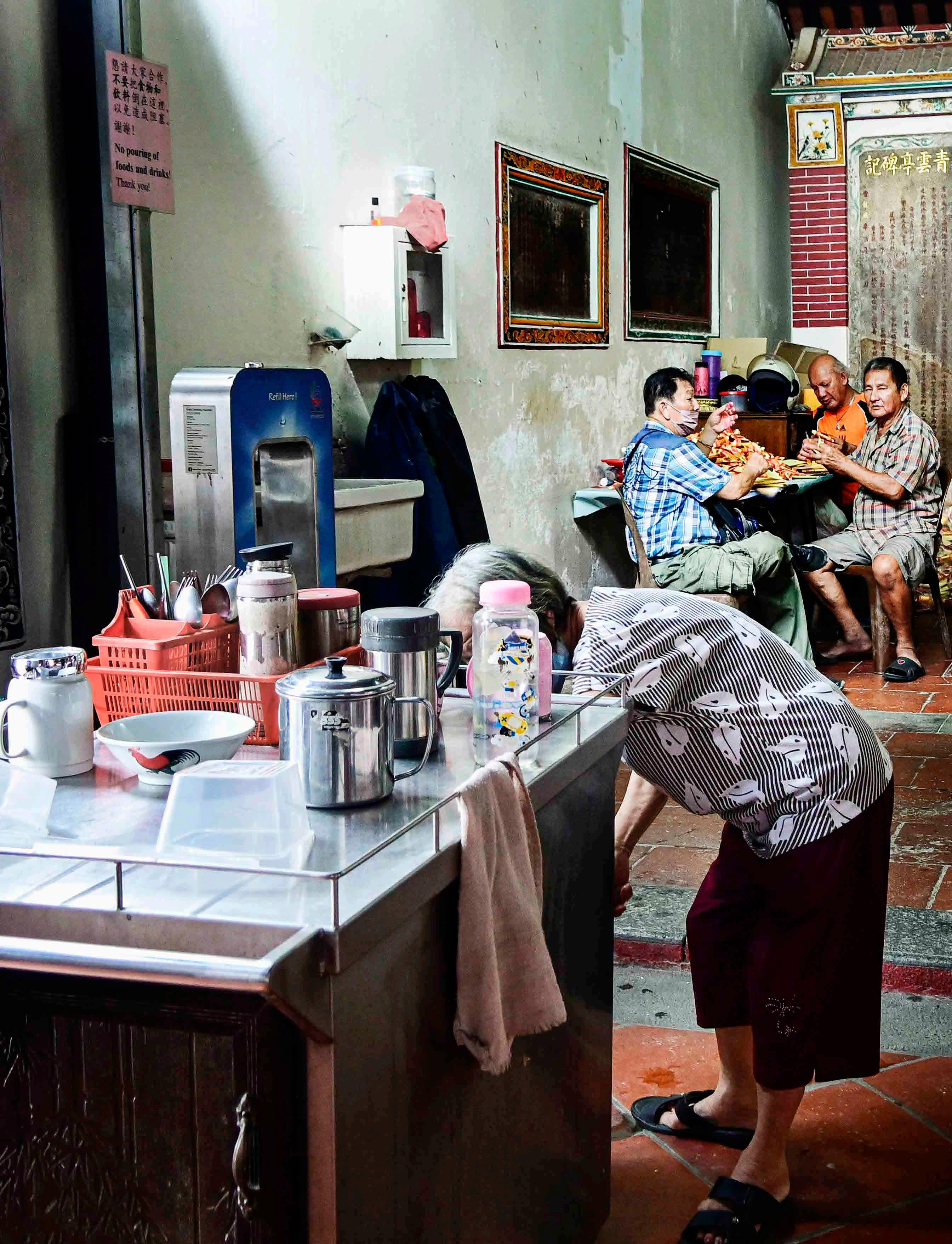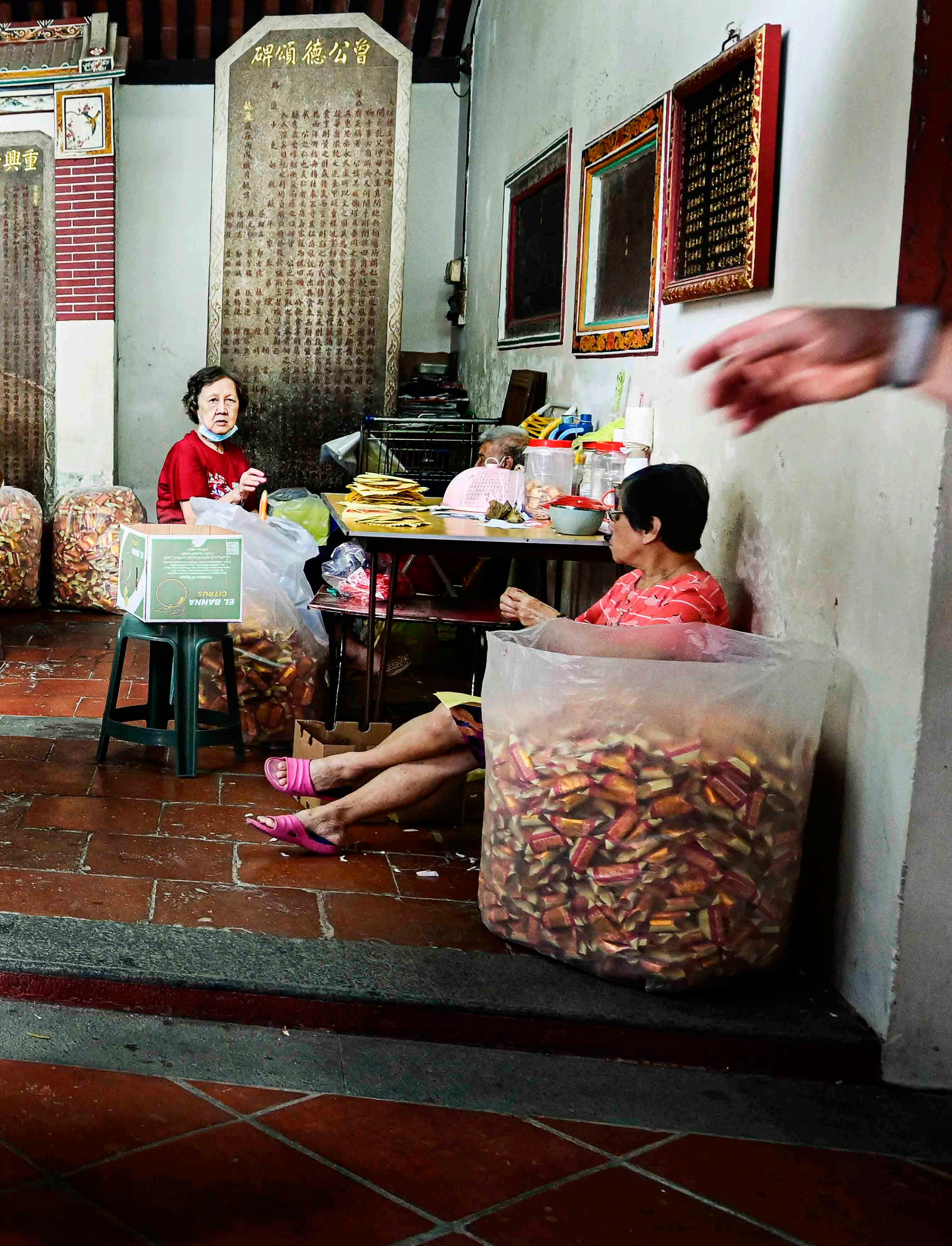 Os templos asiáticos são muito parecidos com as nossas igrejas católicas no sentido que existem áreas comunais dedicadas a atividades além de oração e culto. Neste templo taoísta em Melaka, um grupo prepara a organização do espaço e empacota pequenos docinhos que serão distribuídos em um evento da cidade ao cair da noite.