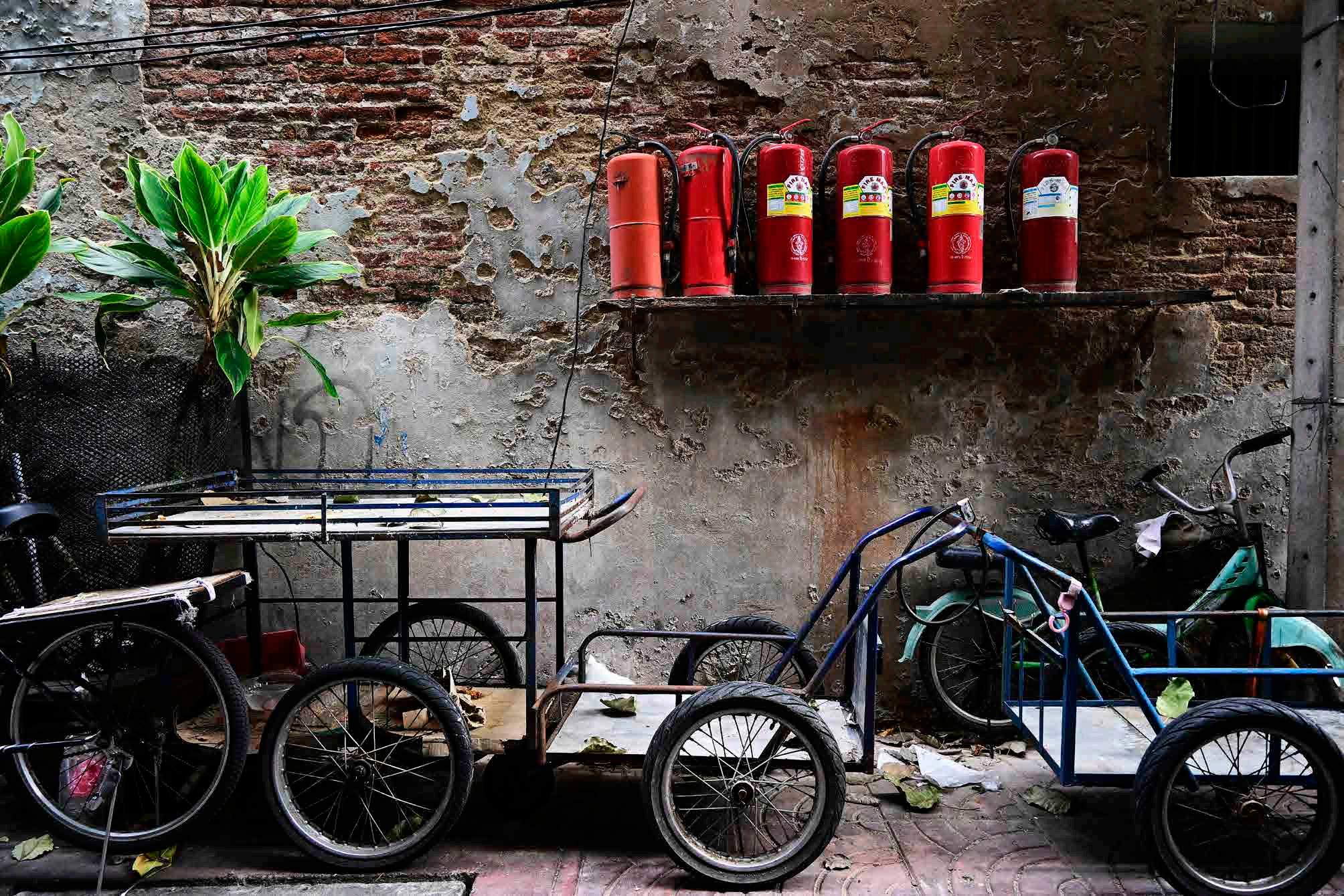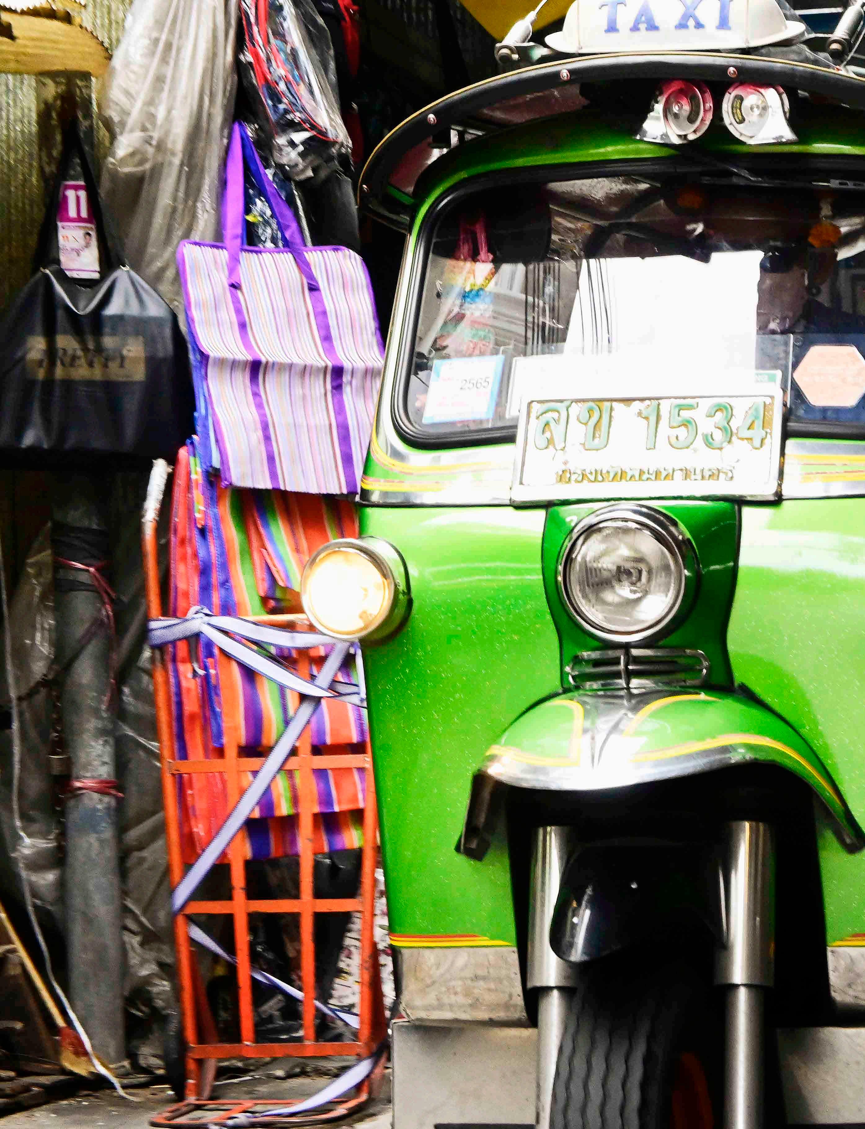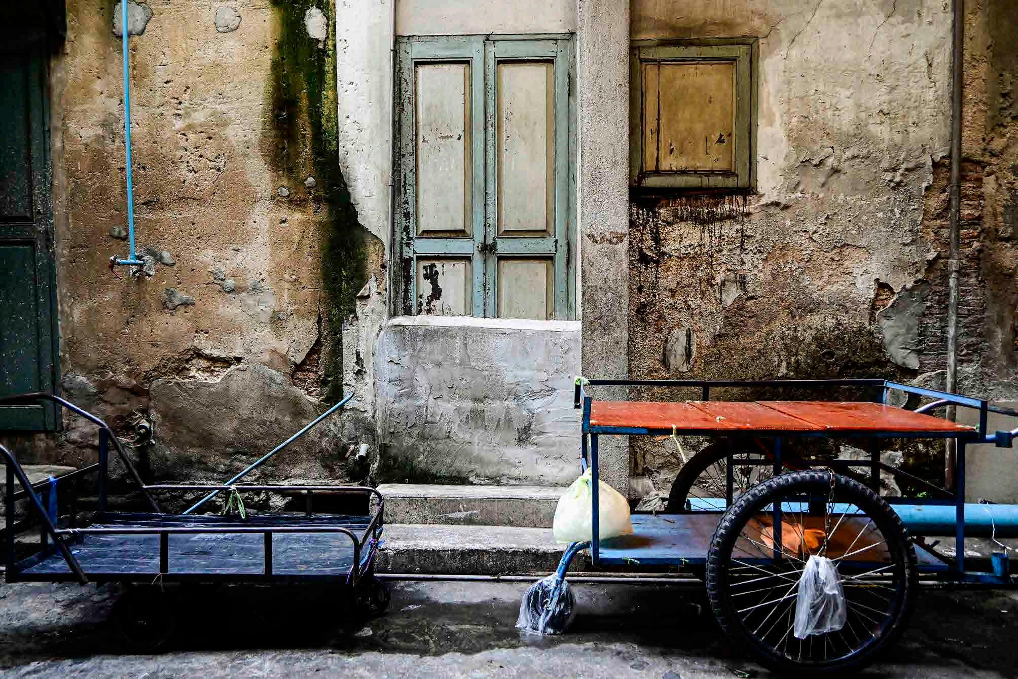 Carros não passam pelas vielas estreitas, mas os tuk-tuks sim. Neste caso, não são turísticos, mas servem como “carros de carga”, veículos motorizados que permitem o transporte rápido de algumas mercadorias.