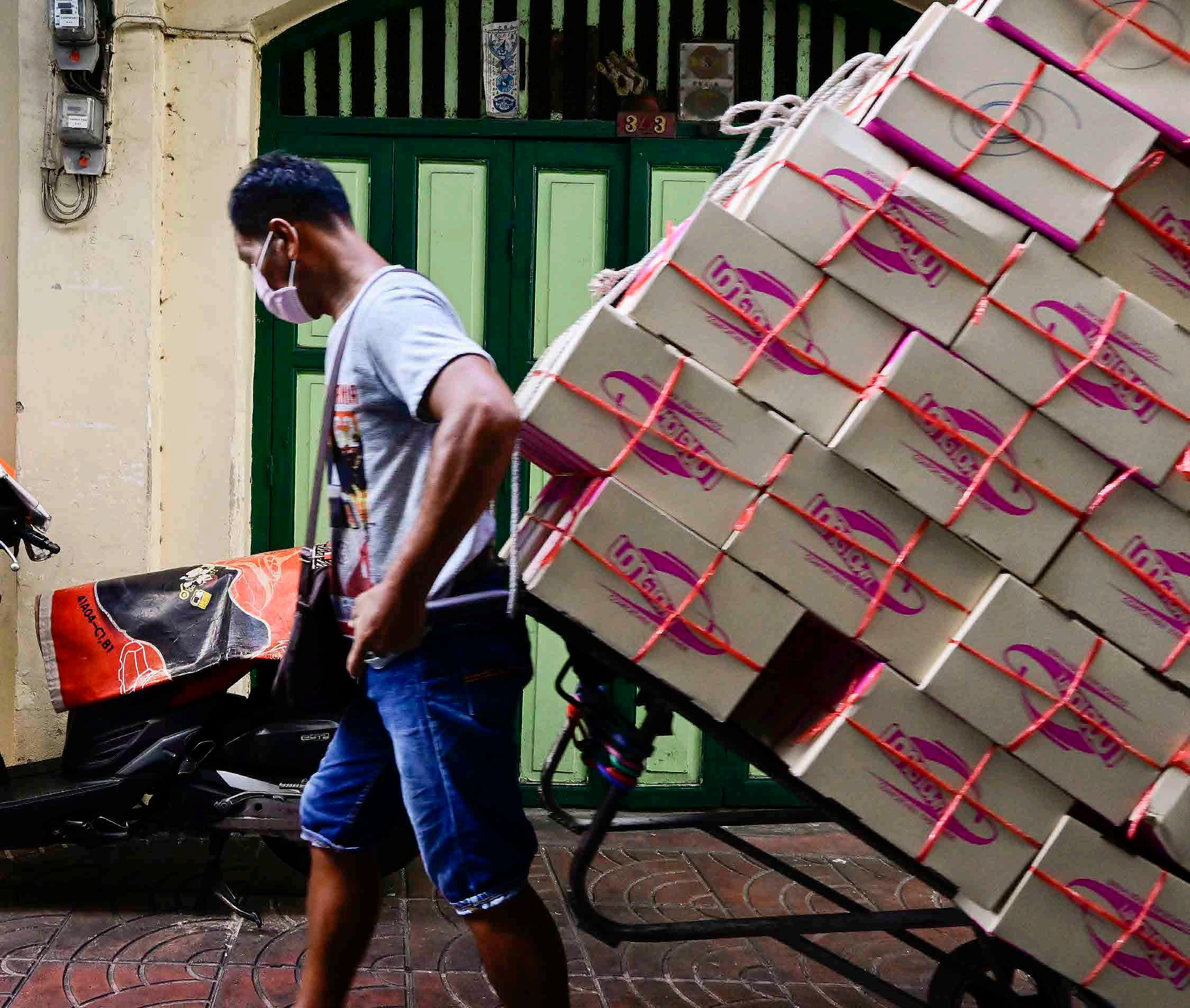 Homem transportando caixas de um depósito até um dos vários mercados locais.