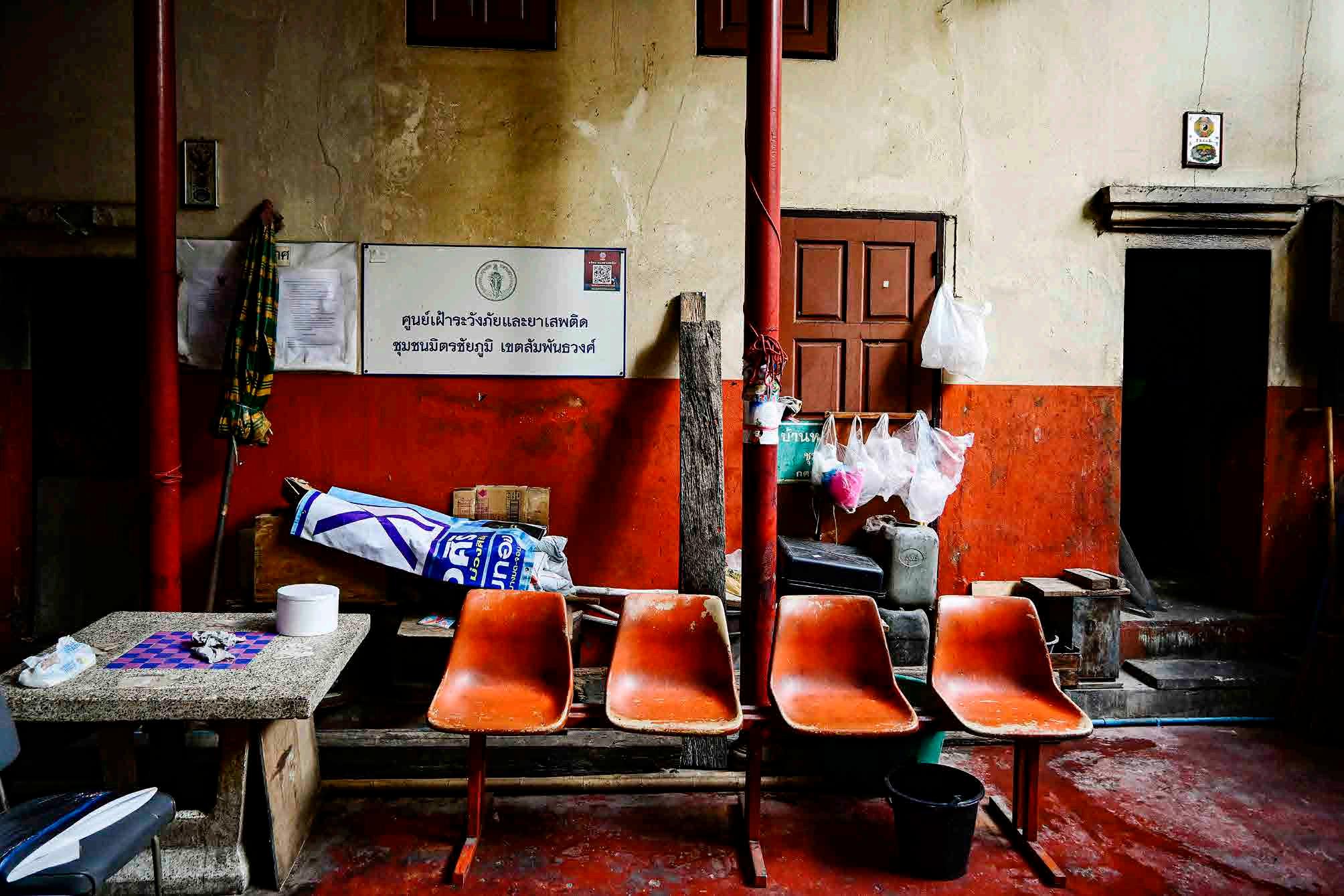Talvez esse já tenha sido um espaço de vivência, mas hoje está cheio de entulho. Na placa se lê “centro de vigilância às drogas da comunidade do distrito de Samphanthawong”.