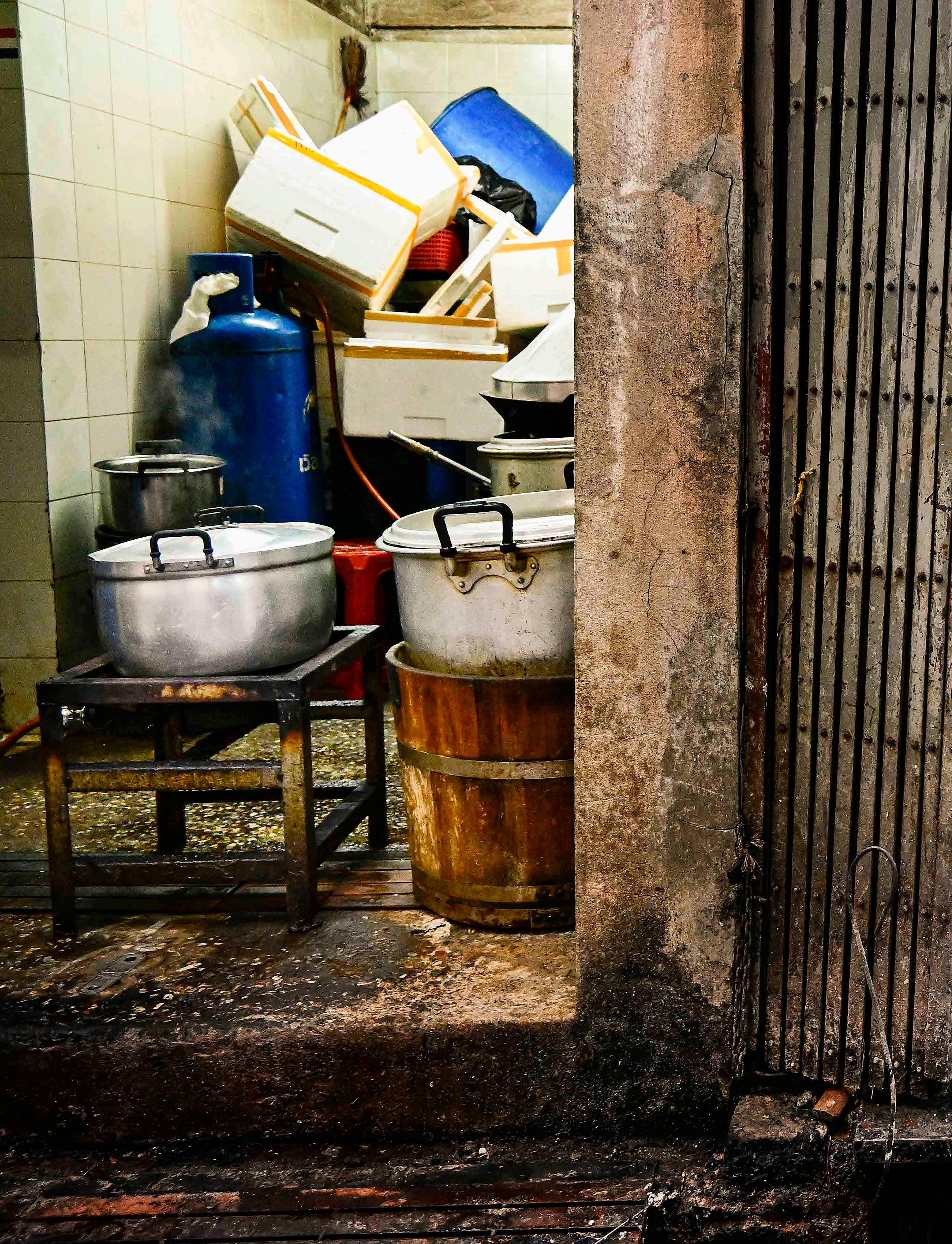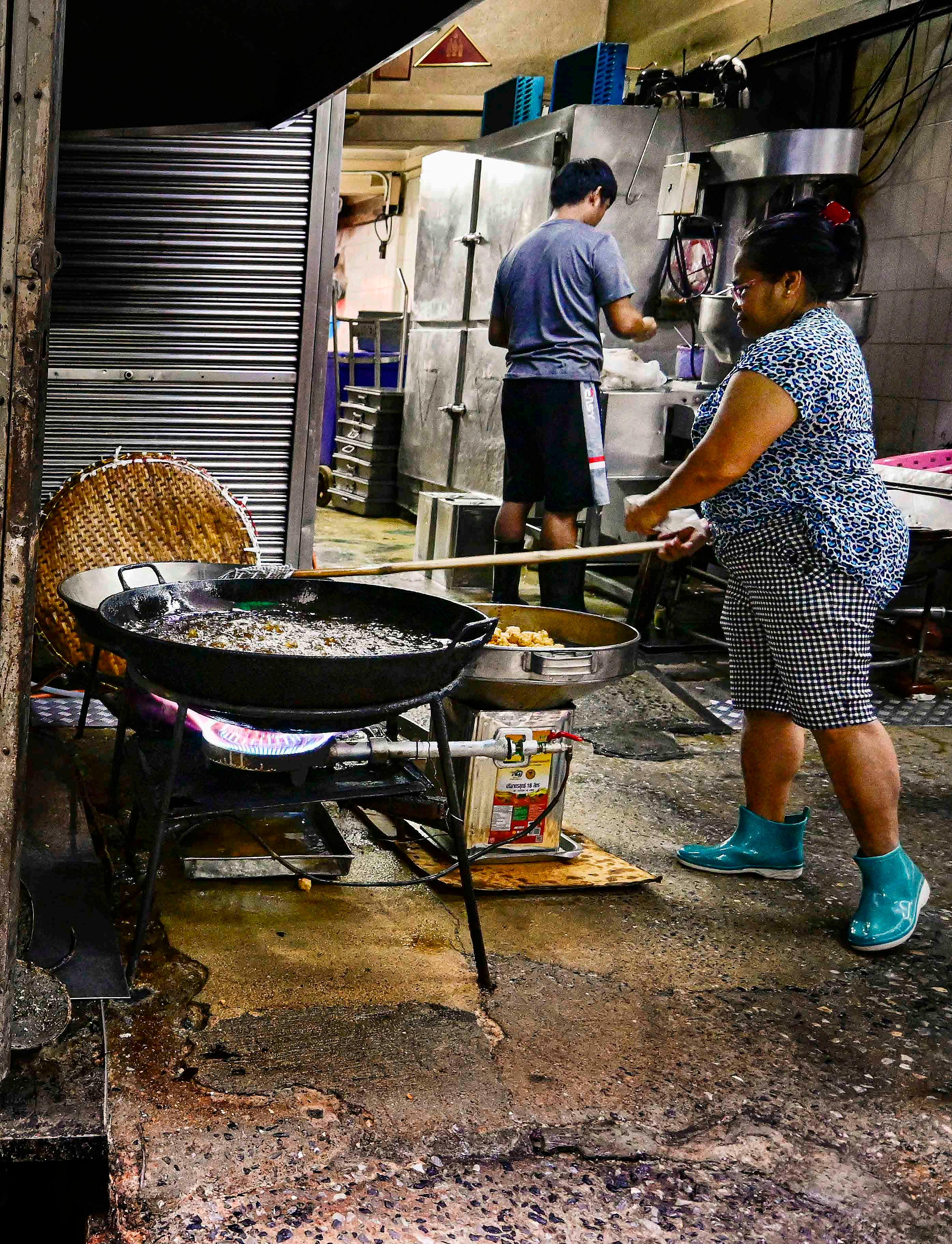 Uma das vielas estreitas vai dar nos fundos de um mercado, onde esta cozinha prepara ativamente dezenas de bolinhos fritos.