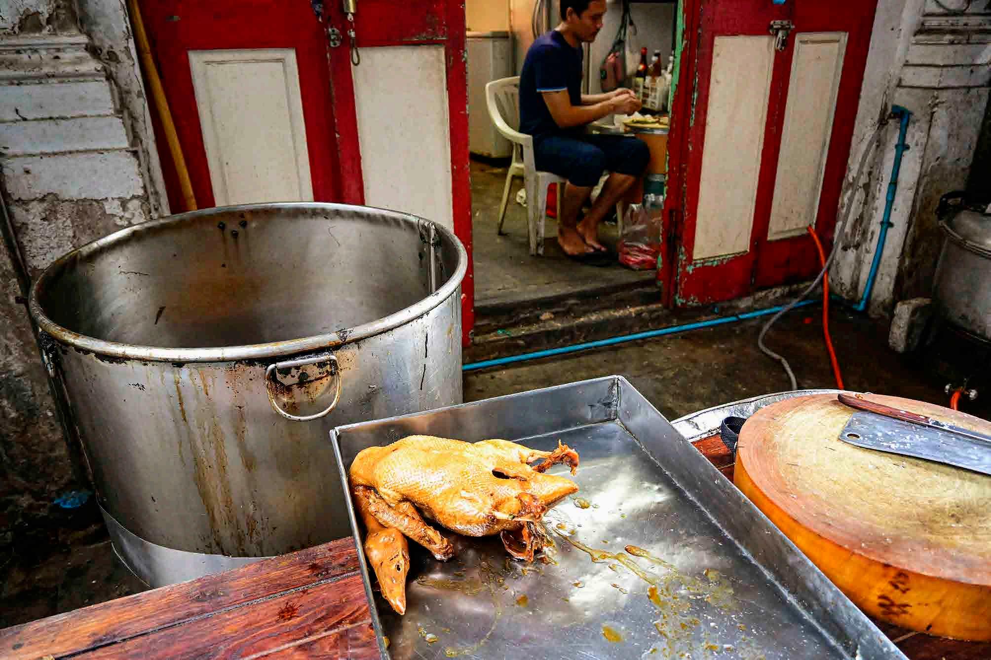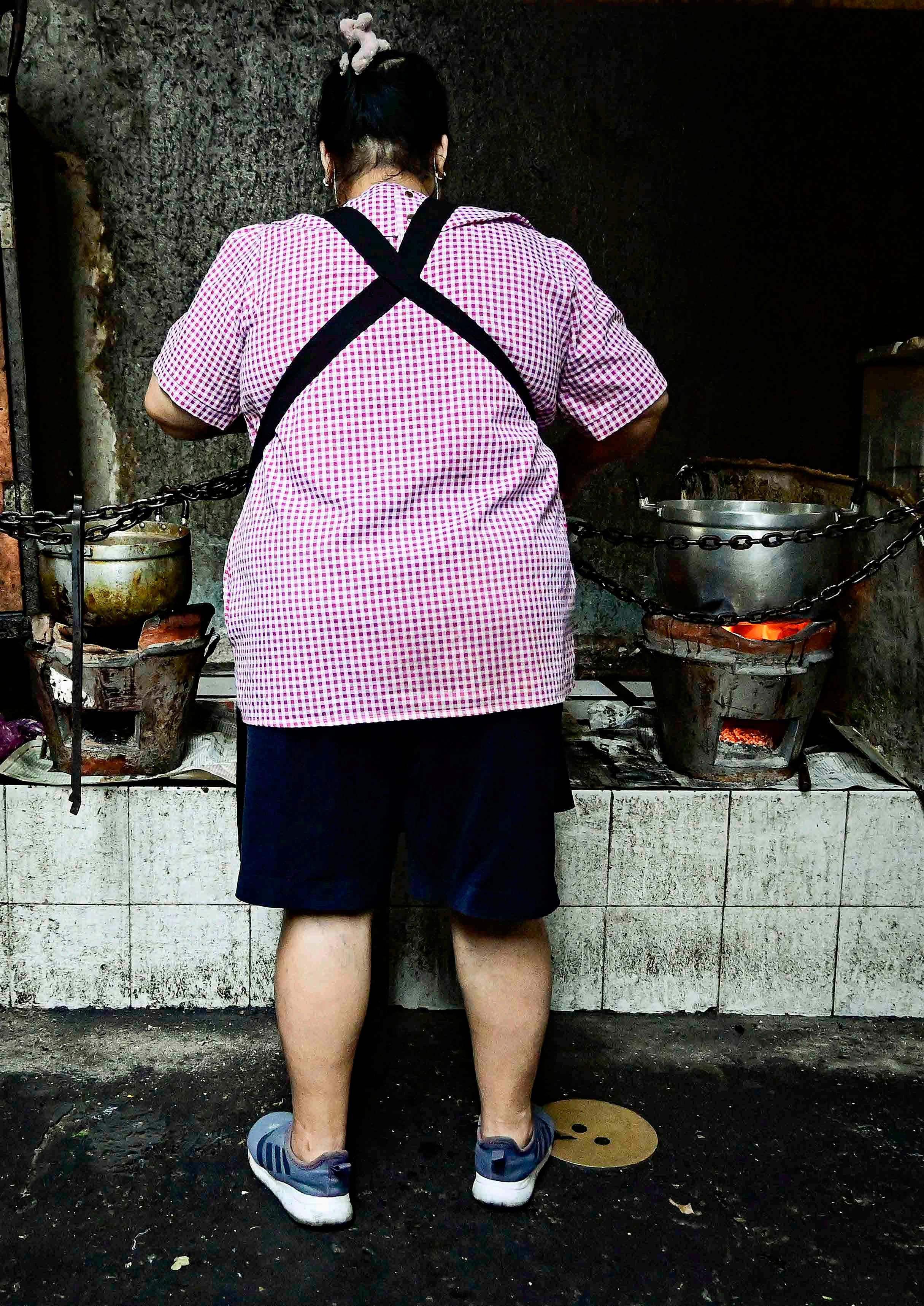Esquerda - mulher cozinhando em uma cozinha improvisada em uma das várias travessas de Samphanthawong.