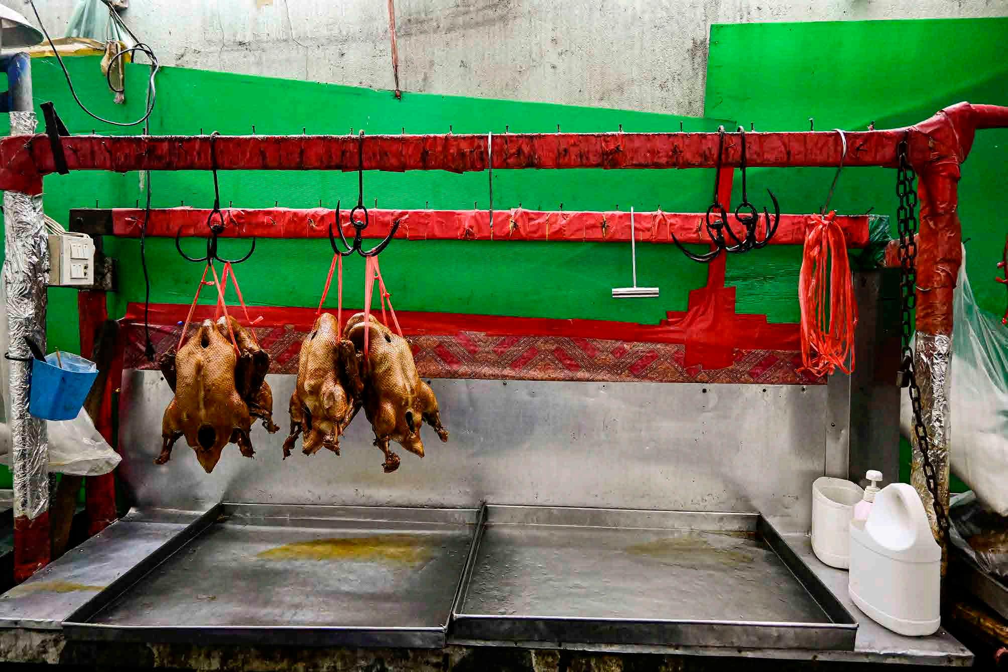Frangos assados esperando para serem vendidos.