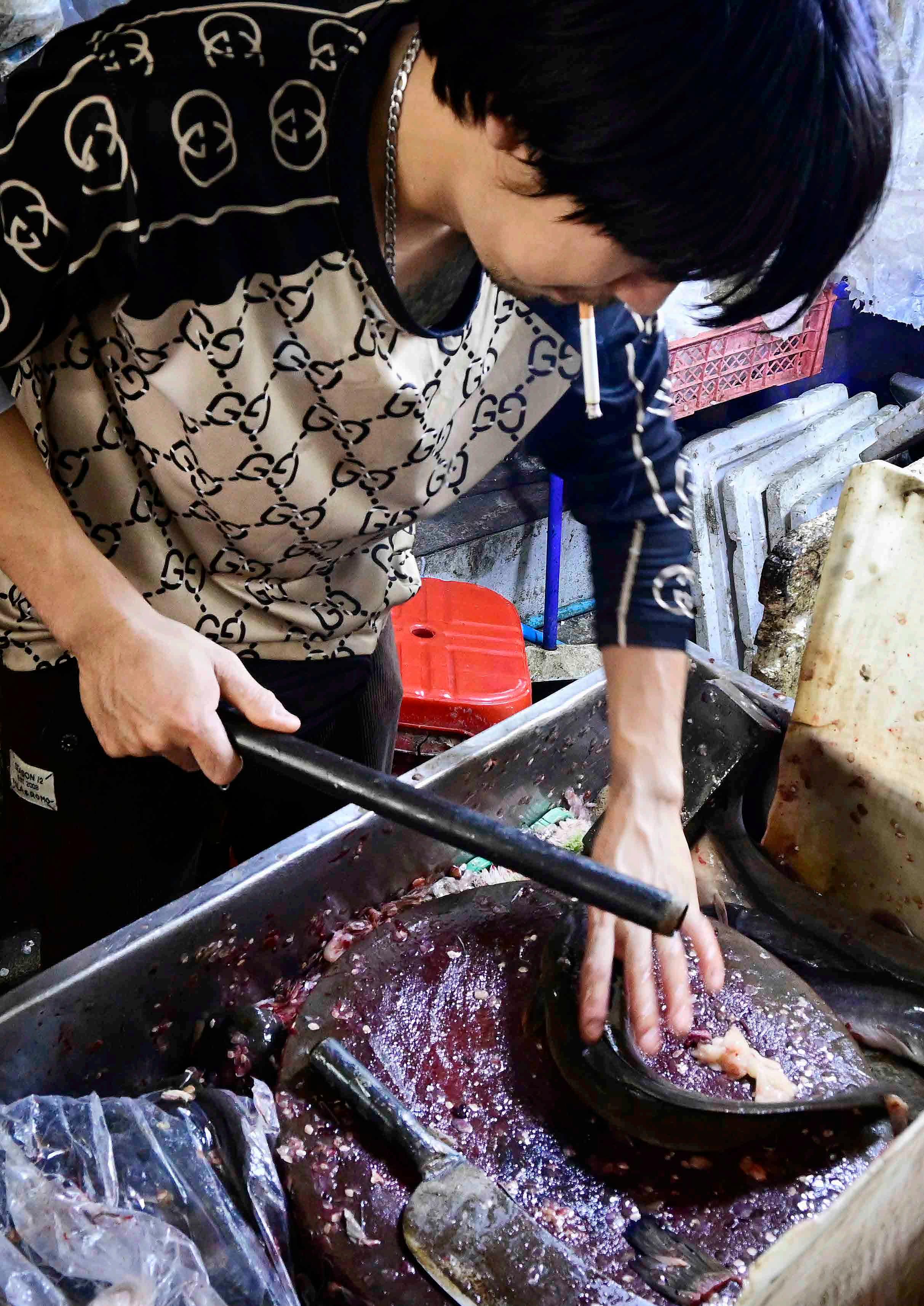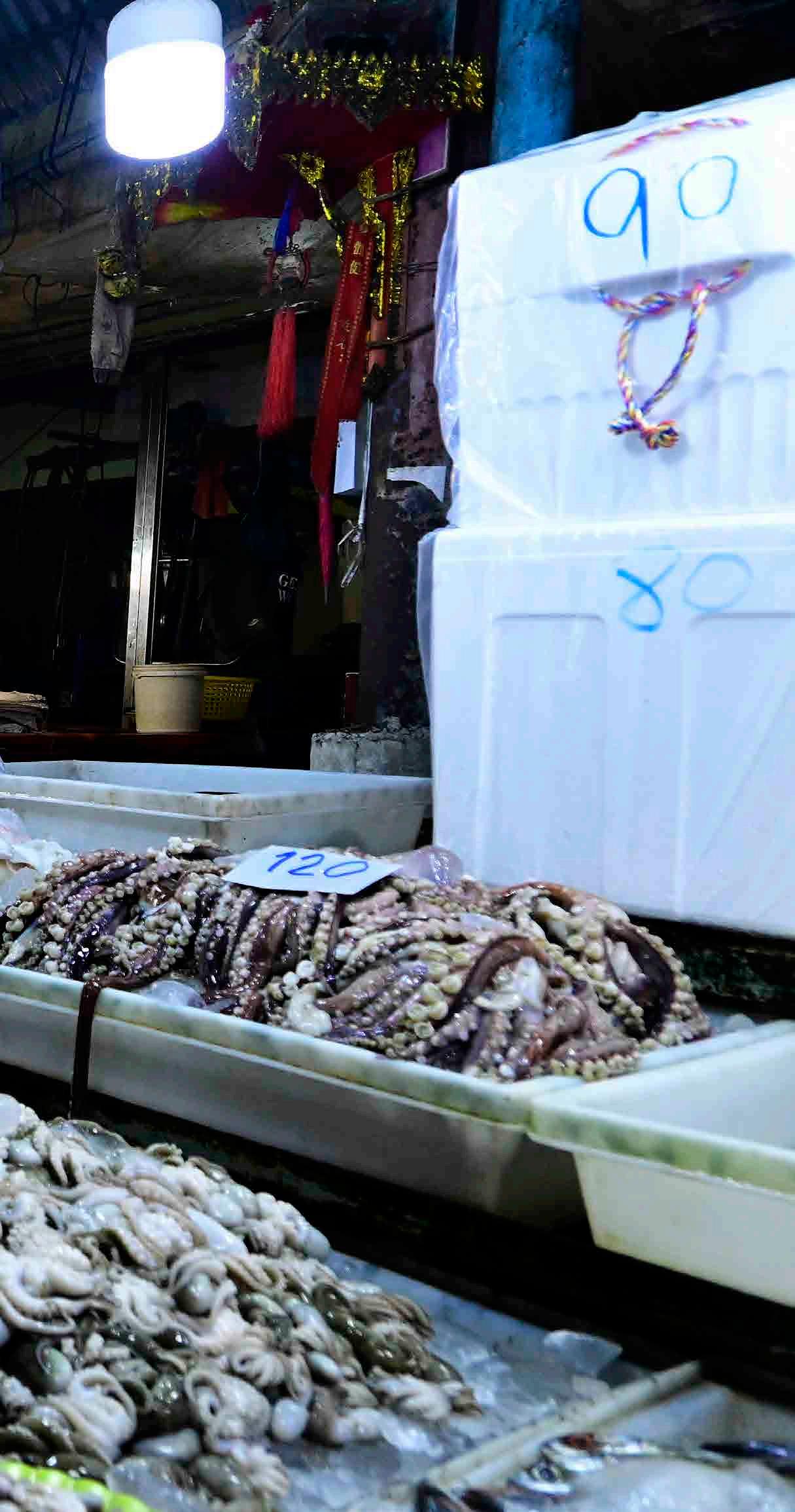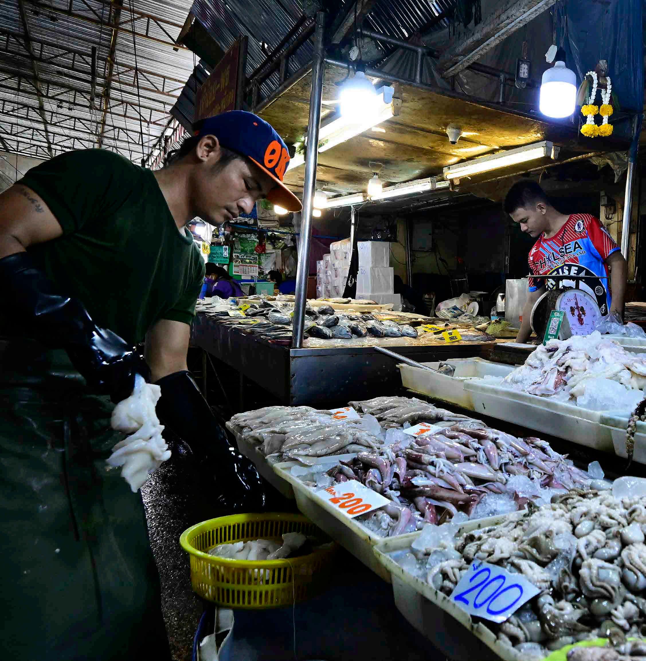Mercadores preparam frutos do mar recém pescados para venda no mercado de Pak Nam, próximo a Bangkok, na Tailândia.