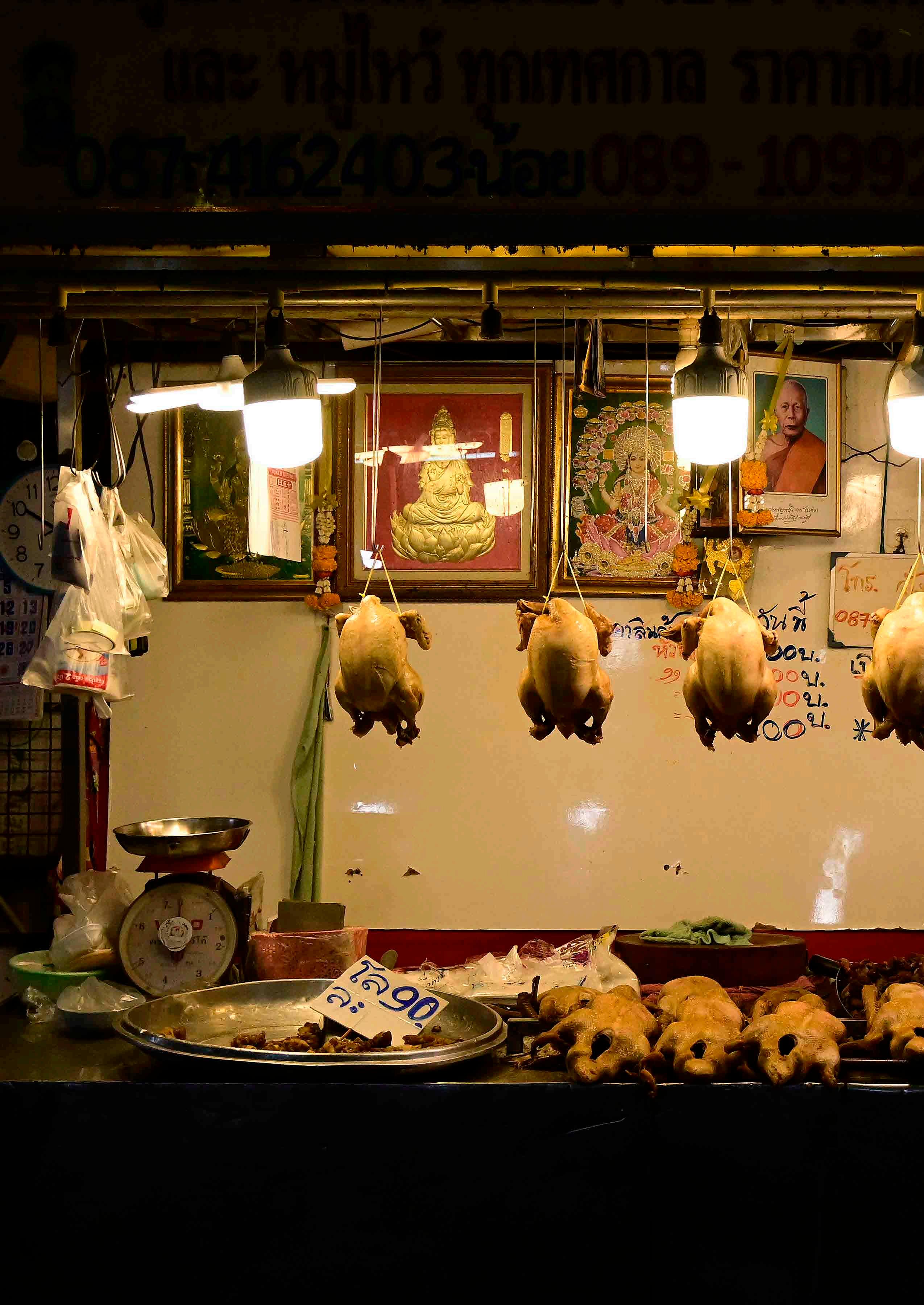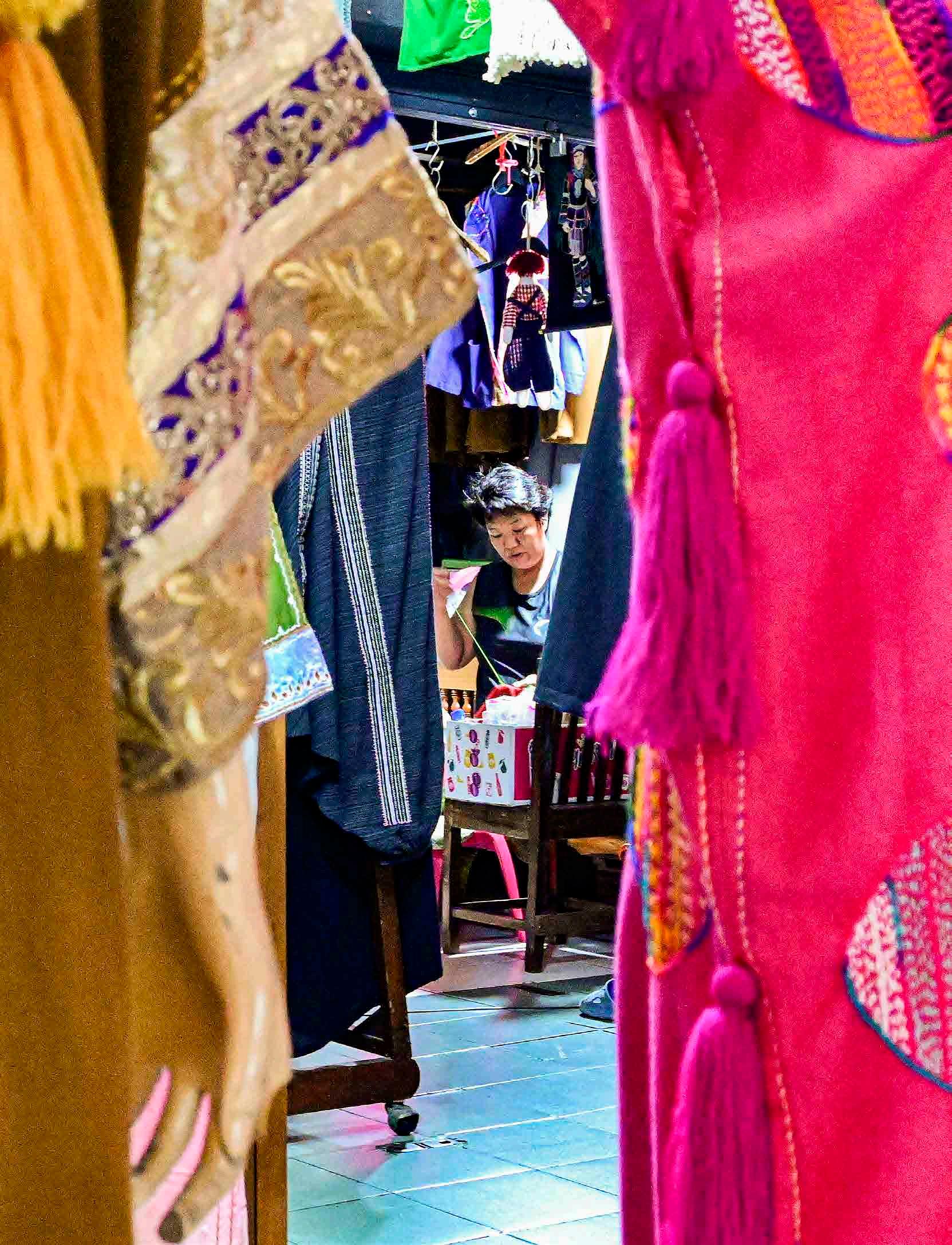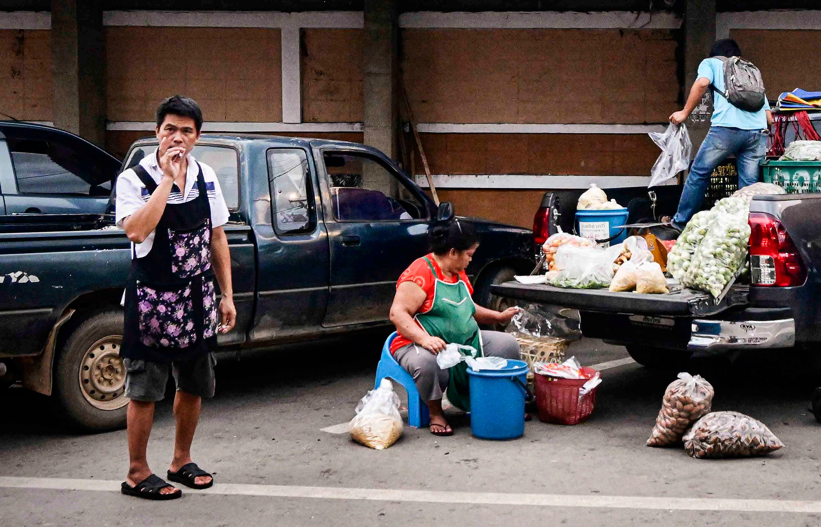 Nos mercados é possível ver a ação de pessoas bastante habilidosas em tarefas aparentemente ordinárias. À esquerda, o mercado de Pak Nam, próximo a Bangkok, é conhecido por vender pescados frescos (dizem, mais que na capital). Um peixeiro pega peixes vivos num tanque e os abate com uma paulada no crânio. Acima, nas redondezas do mercado Warorot, em Chiang Mai, estende-se um bairro chinês com diversos mercados e vendas menores especializados em confecções de roupas de todos os tipos, de tradicionais a modernas. Uma costureira trabalha em uma das dezenas de roupas tradicionais com bordados rebuscados.