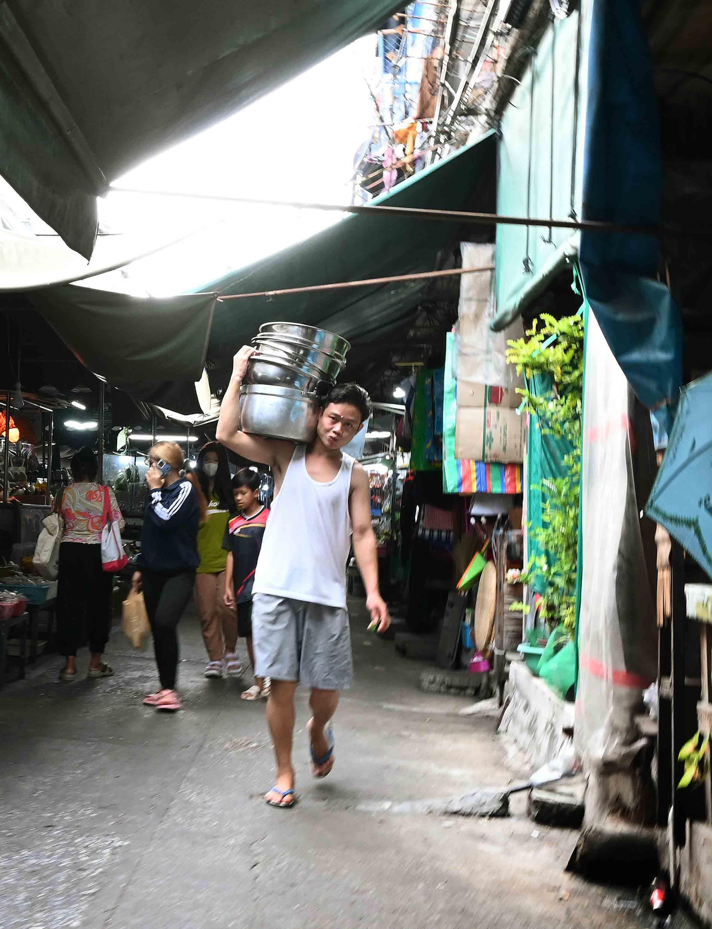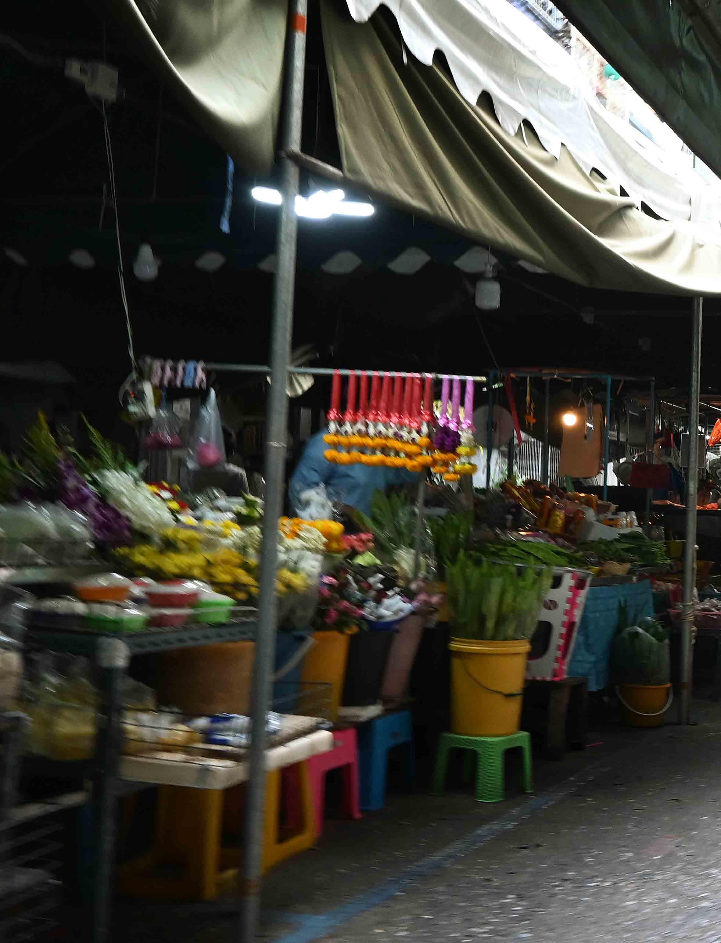Uma cena típica de um mercado diurno local em Bangkok. Mercados têm essa caracetrística muito parecida em todos os lugares, com barracas, tendas e bancadas apinhadas de produtos diversos à venda, com os vendedores enérgicos e apressados passando para lá e para cá, e compradores que circularm atentamente buscando os produtos mais bonitos e frescos.