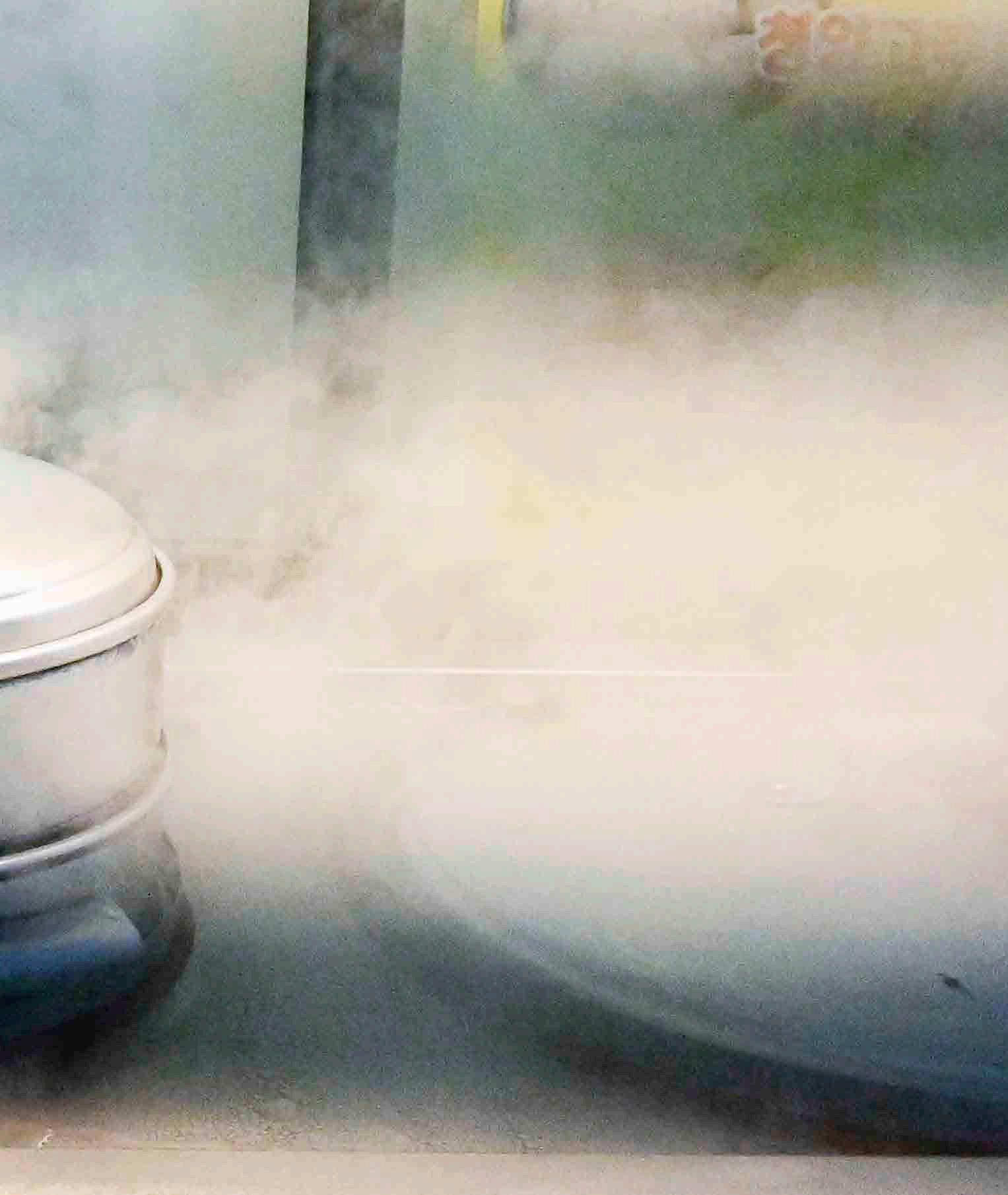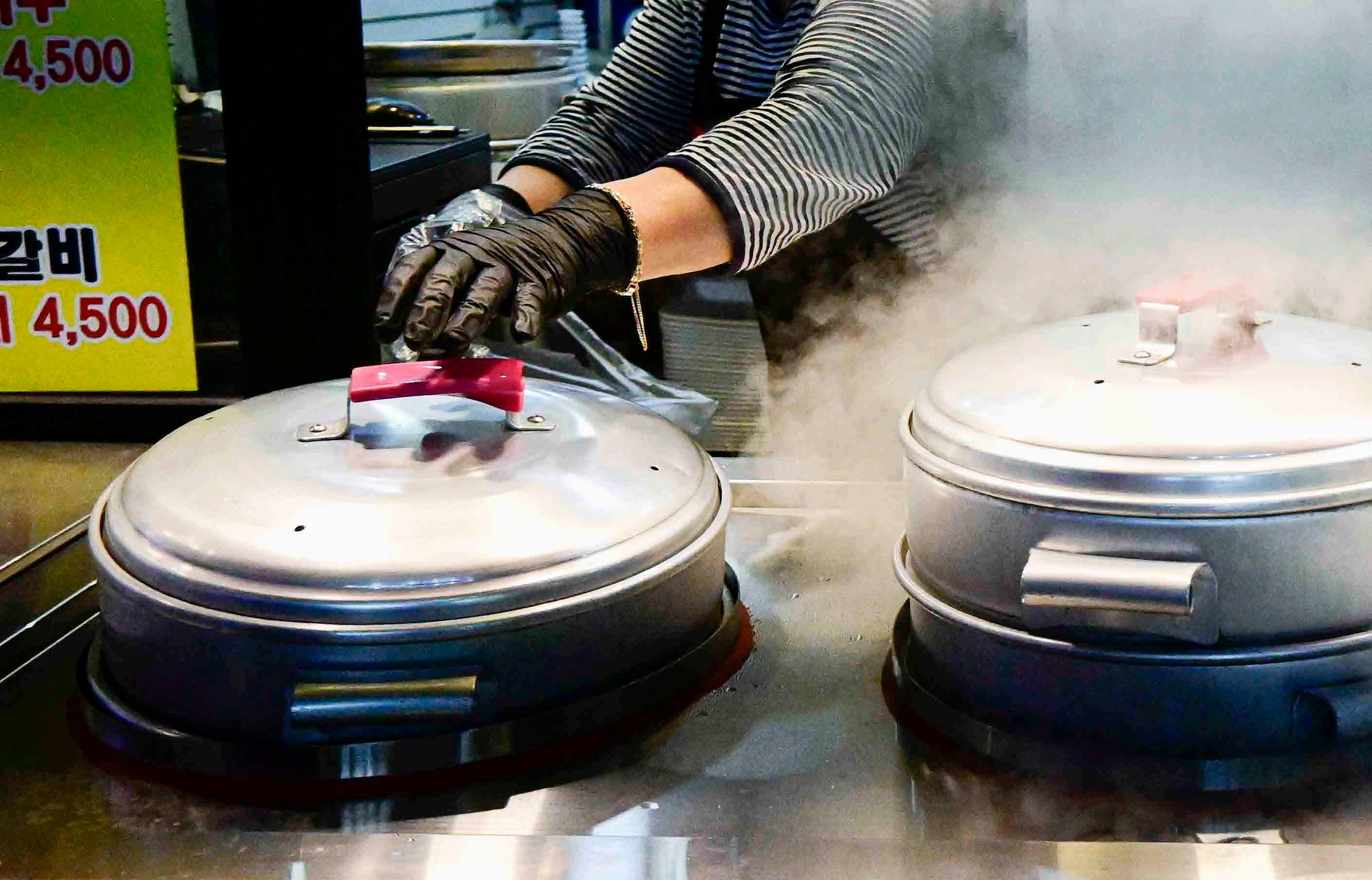Vapores intensos saindo das panelas de preparação de bolinhos cozidos em Seoul, Coreia.