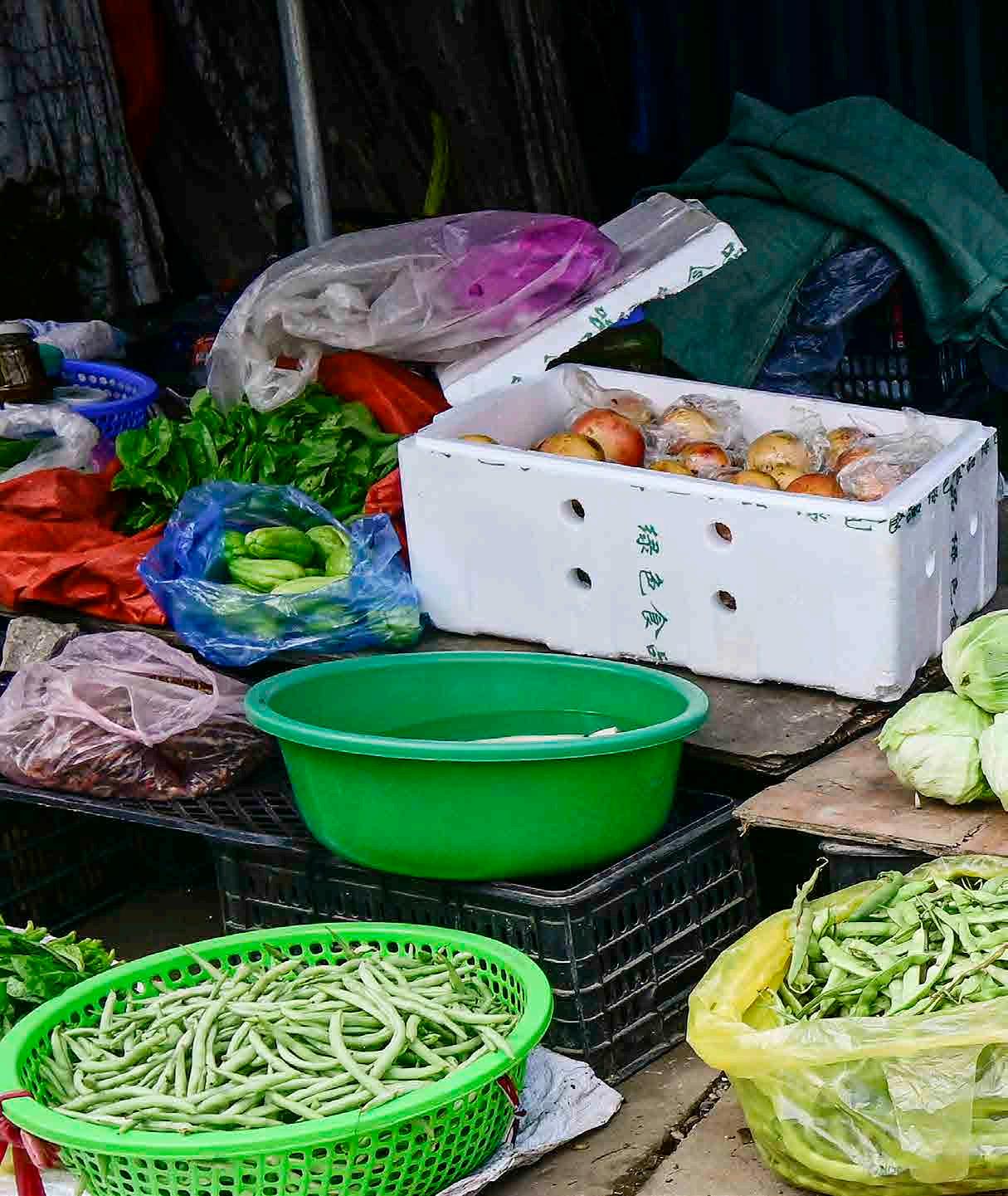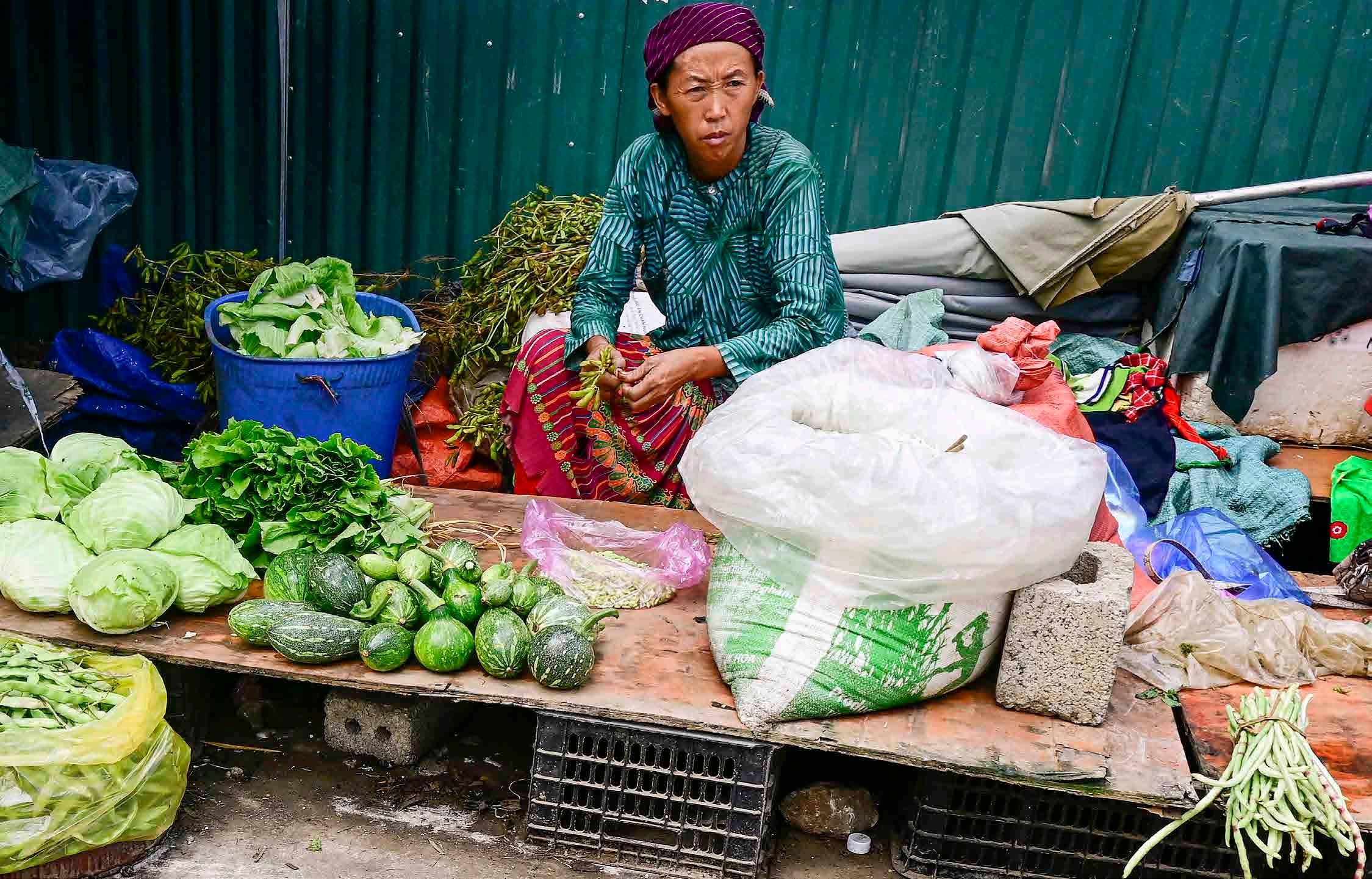 Venda de produtos vegetais diversos. Mercado municipal de Dong Van.