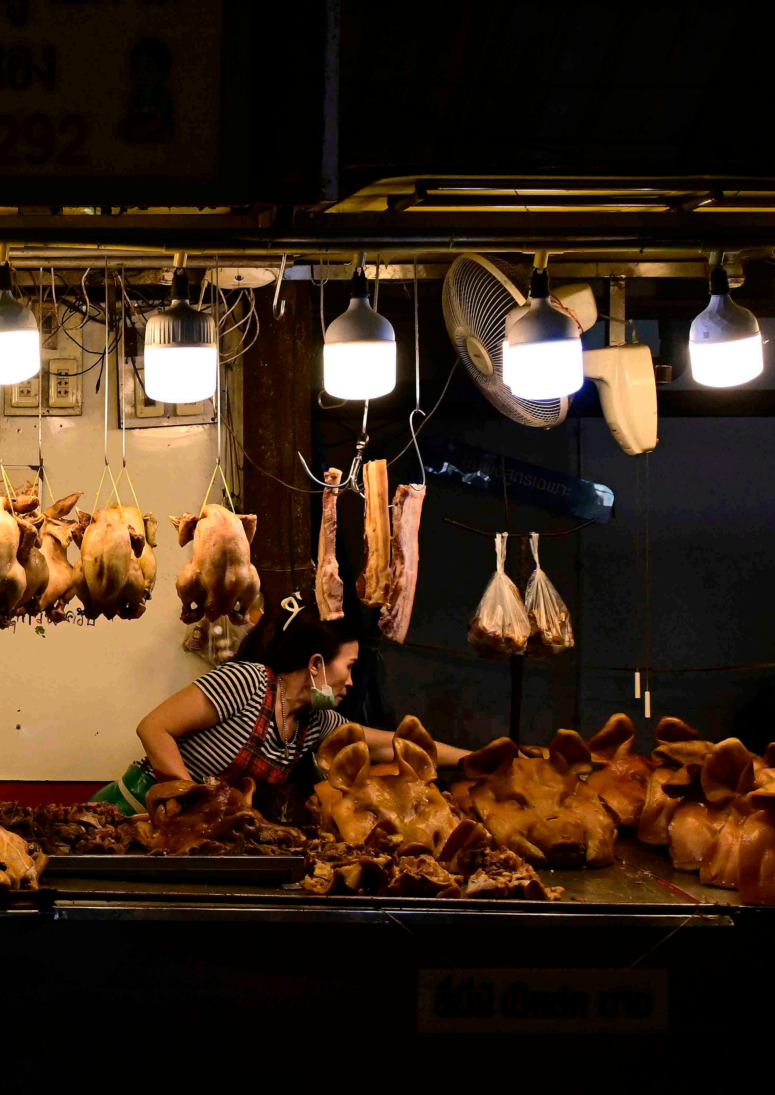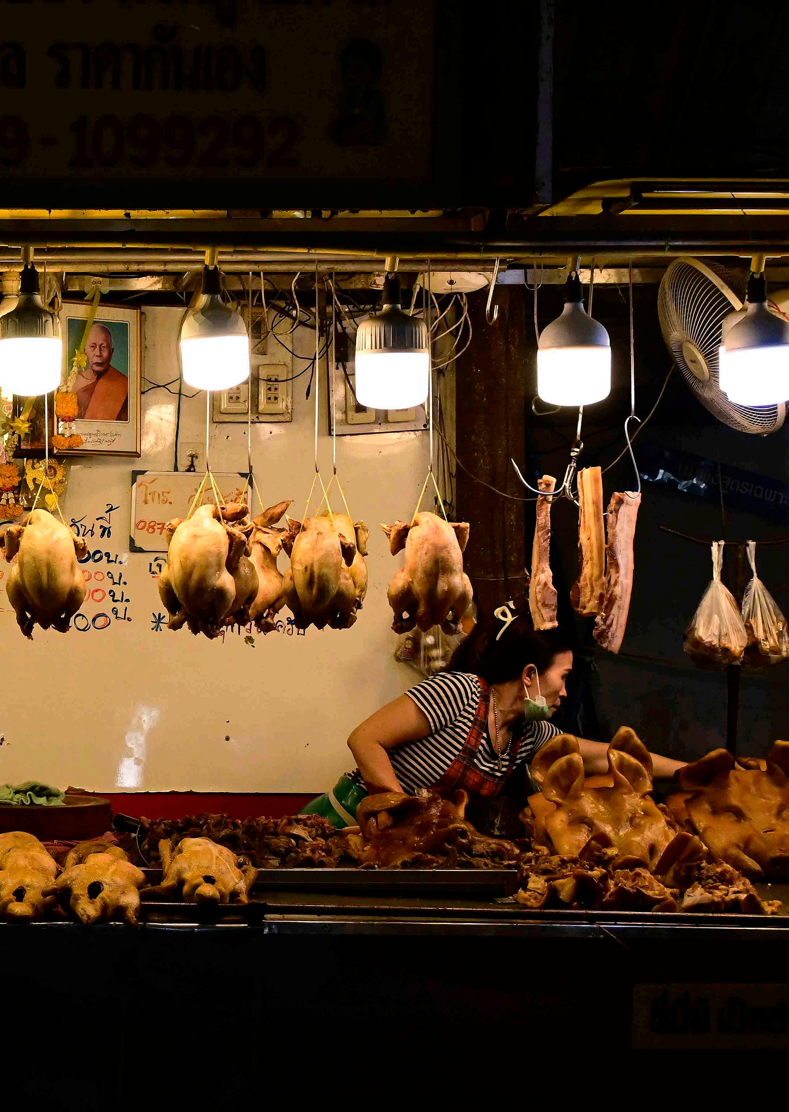 Mulher organiza os produtos no balcão de uma tenda do açougue do mercado de Pak Nam, Tailândia.