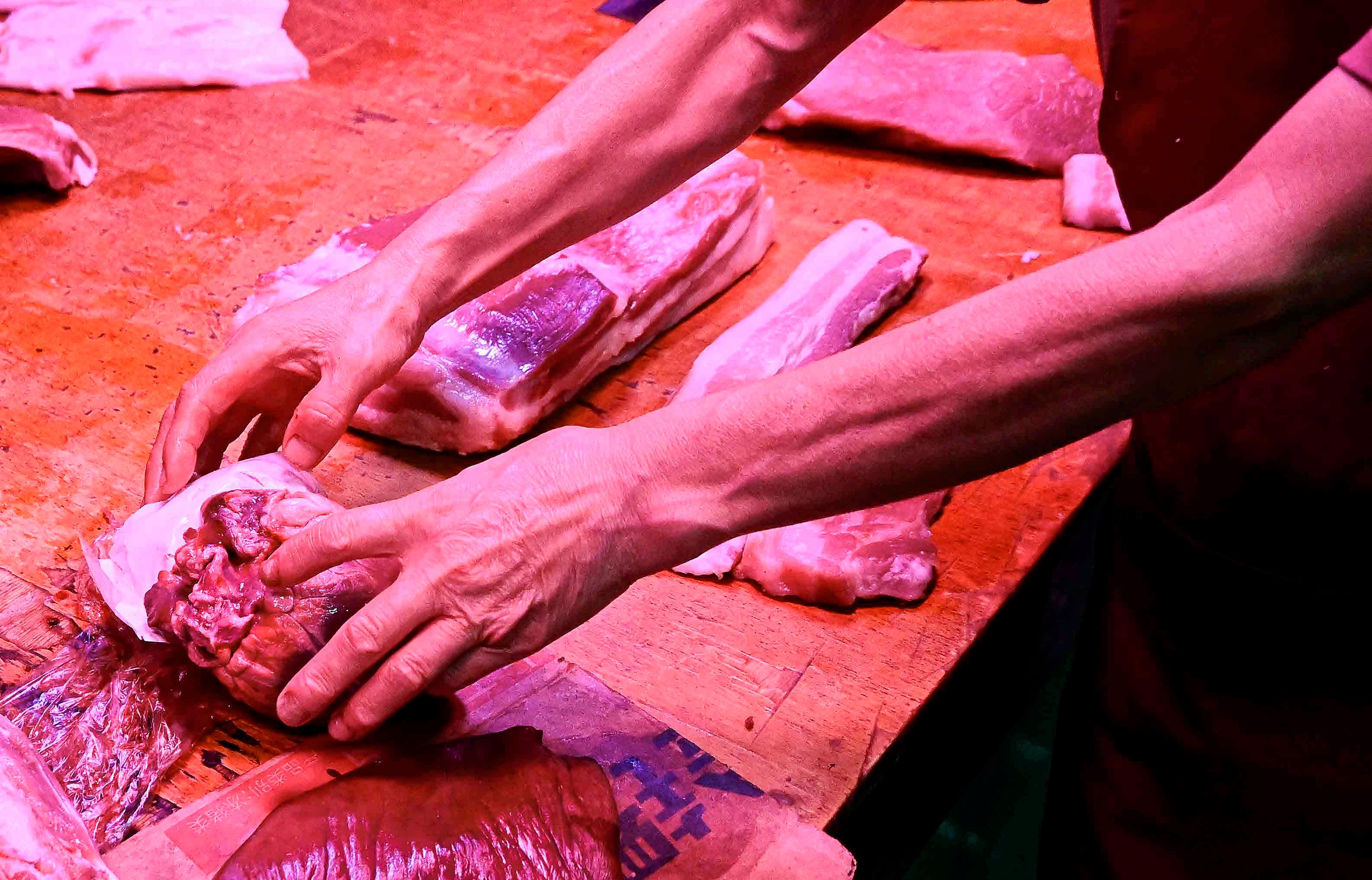 Açougueira maneja pedaços de carne em um mercado no centro de Hanzhou, China.