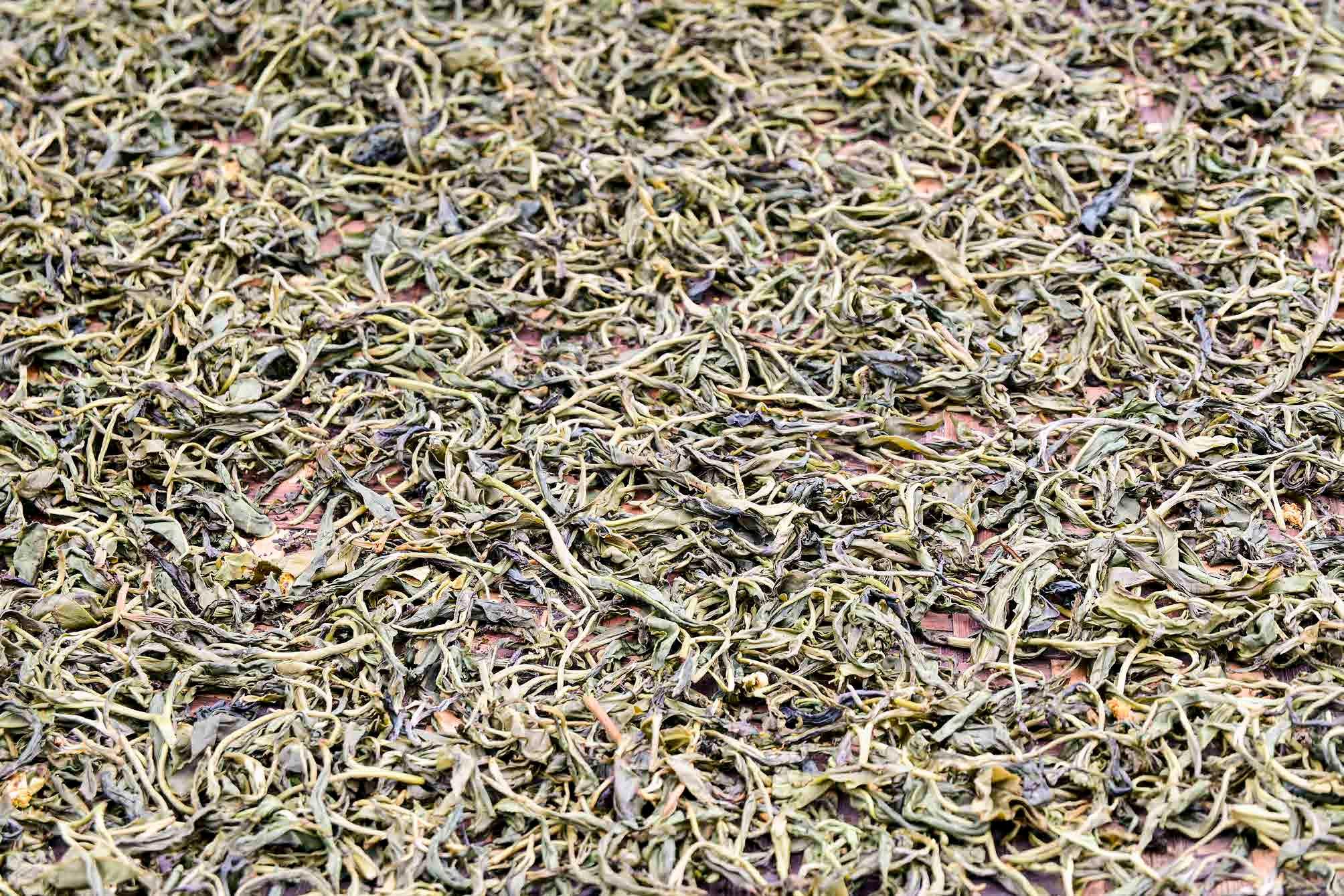 Folhas de chá após secagem. Ban Rak Thai, Tailândia.
