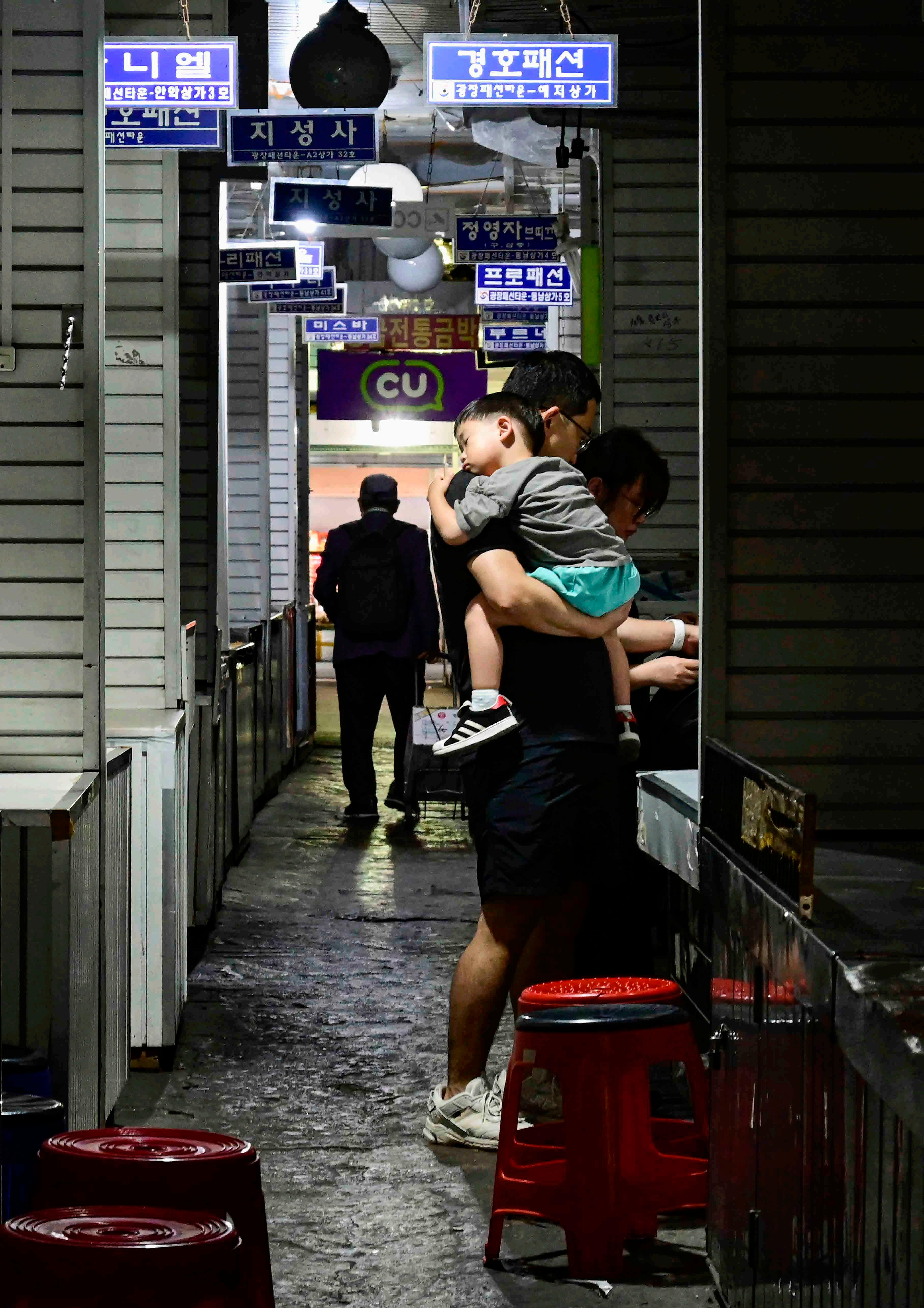 Alguns bastidores de grandes mercados. Acima, mulher organiza e cataloga os produtos de dezenas de caixas de roupas no mercado central de Hanoi. À direita, uma família aproveita o espaço pouco movimentado neste corredor para fazer uma pausa durante o passeio pelo Gwangjang Market de Seoul.