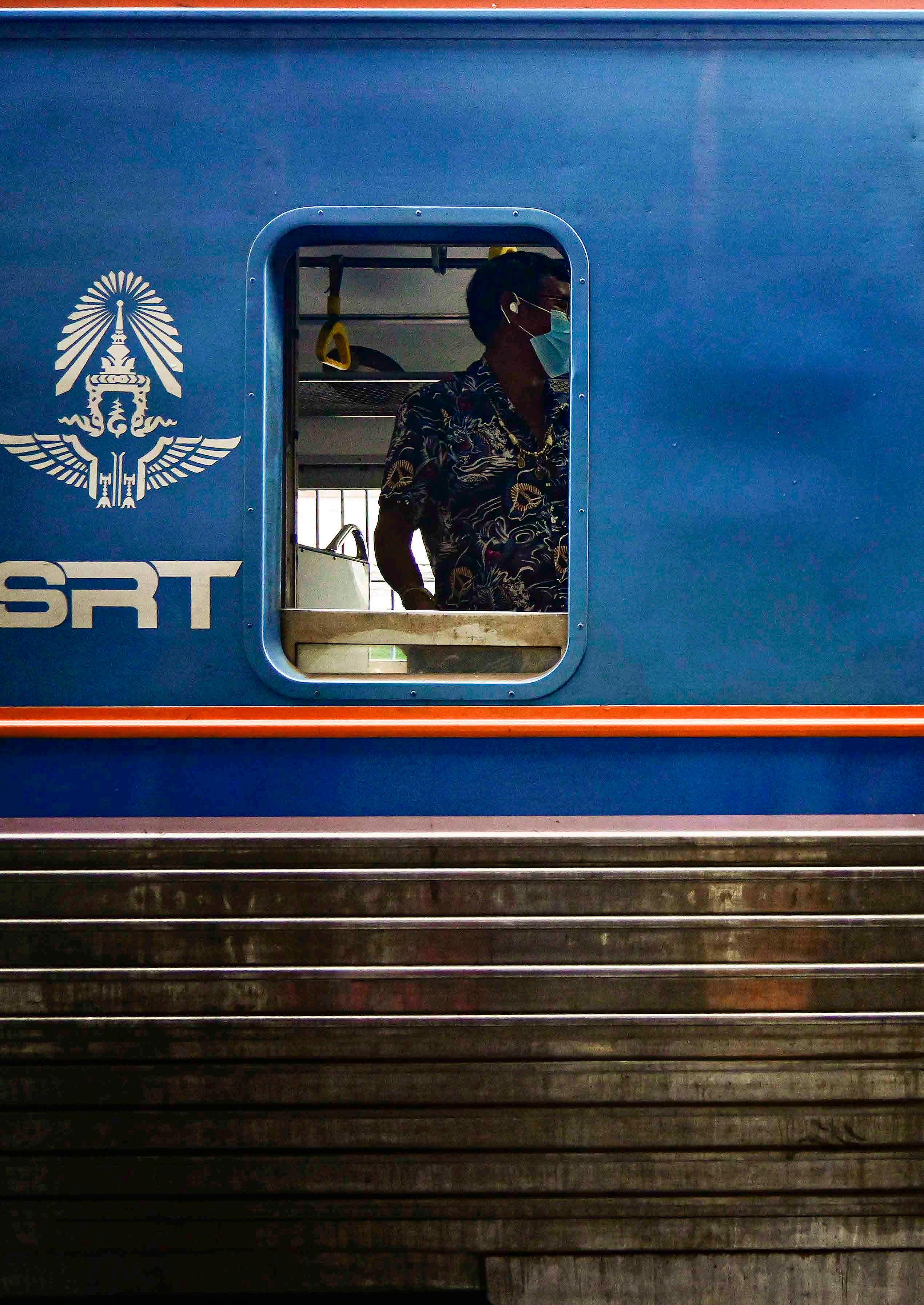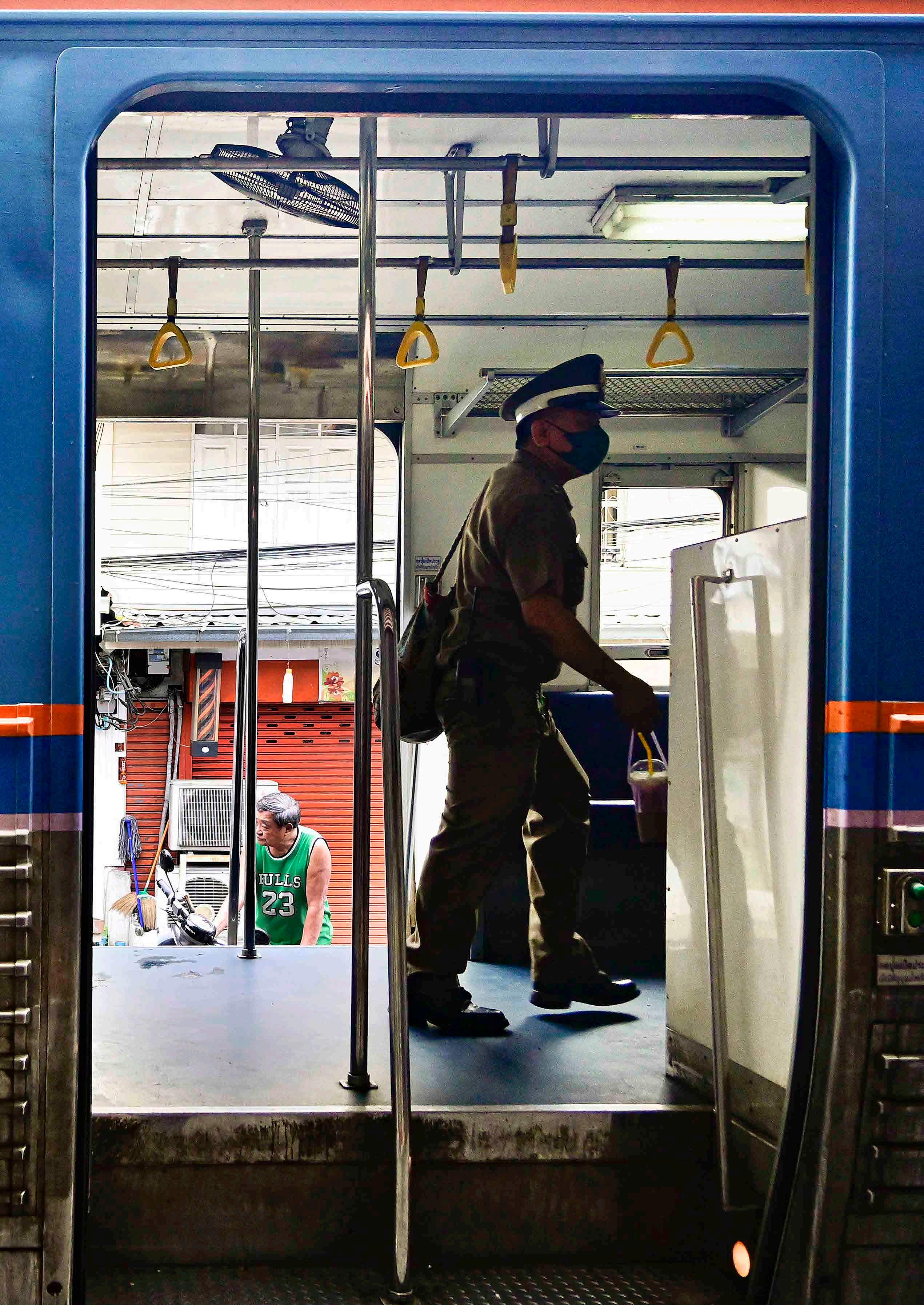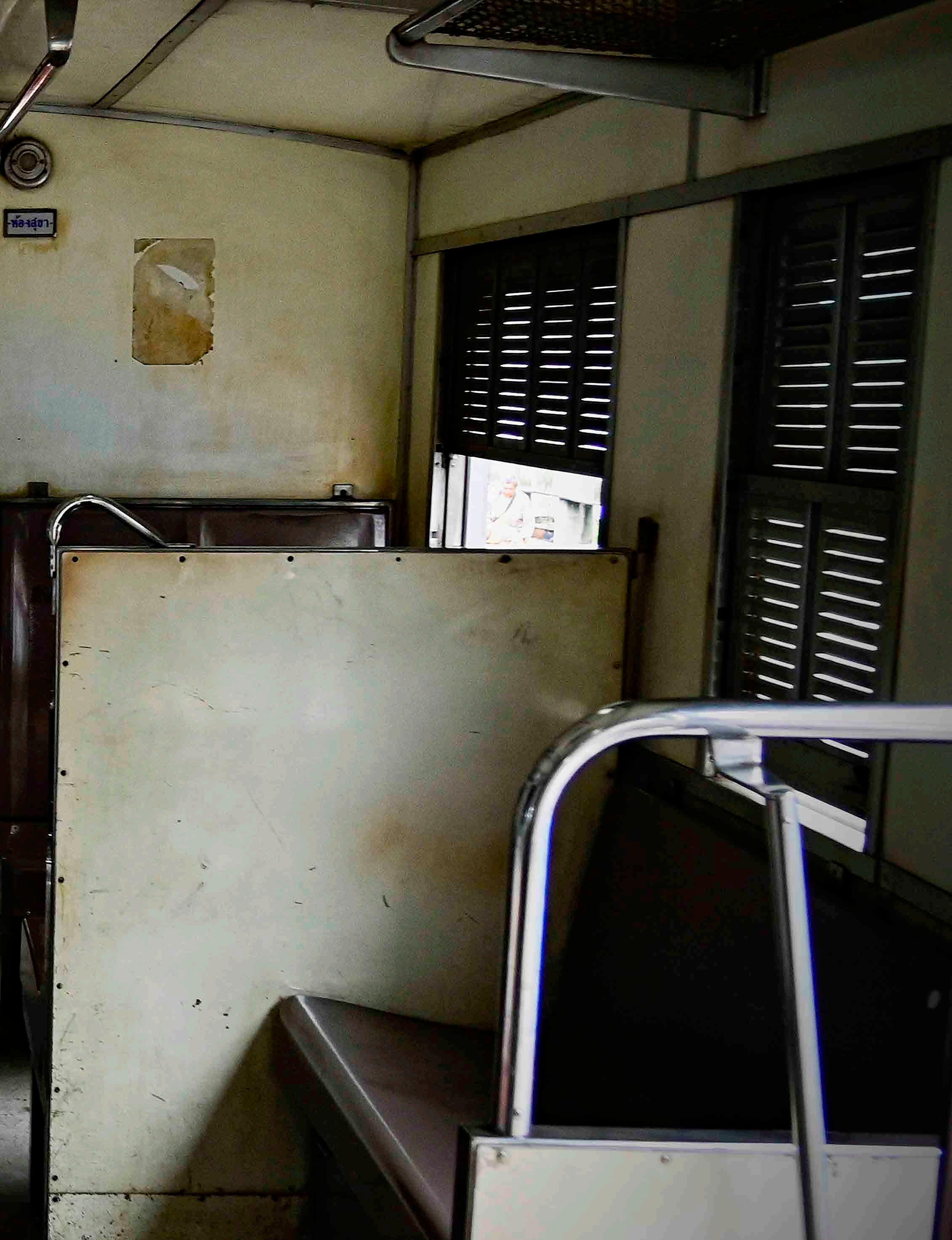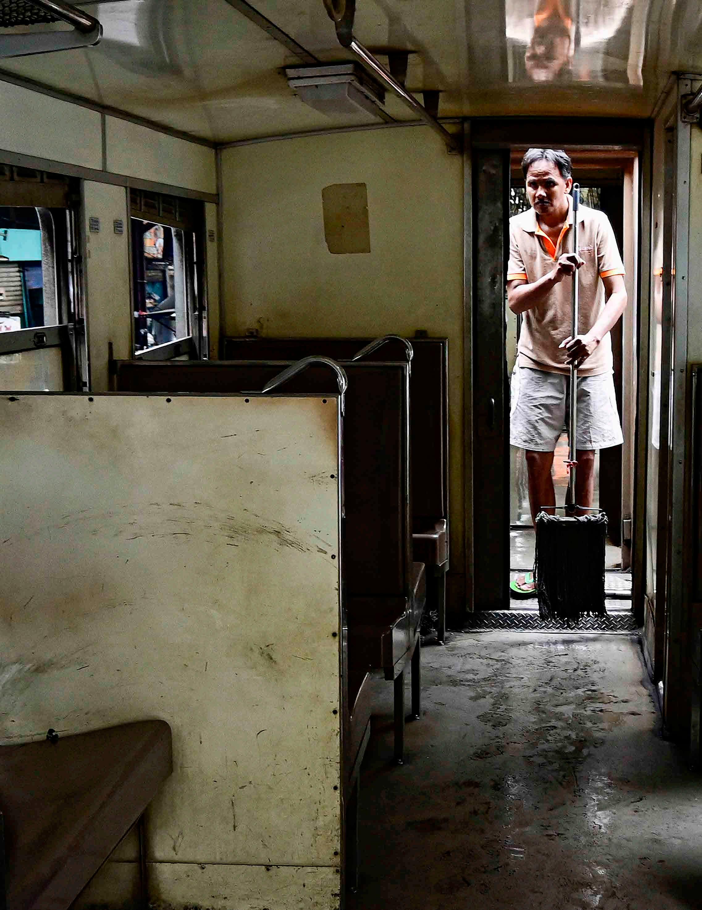 Antes da partida, homem executa a limpeza do interior do trem. É um trem bastante simples, com assento duro, paredes e chão encardidos. A ventilação vem da janela aberta. Não é um trem de luxo, e representa o transporte dos locais - um vislumbre da vida da Tailândia central.