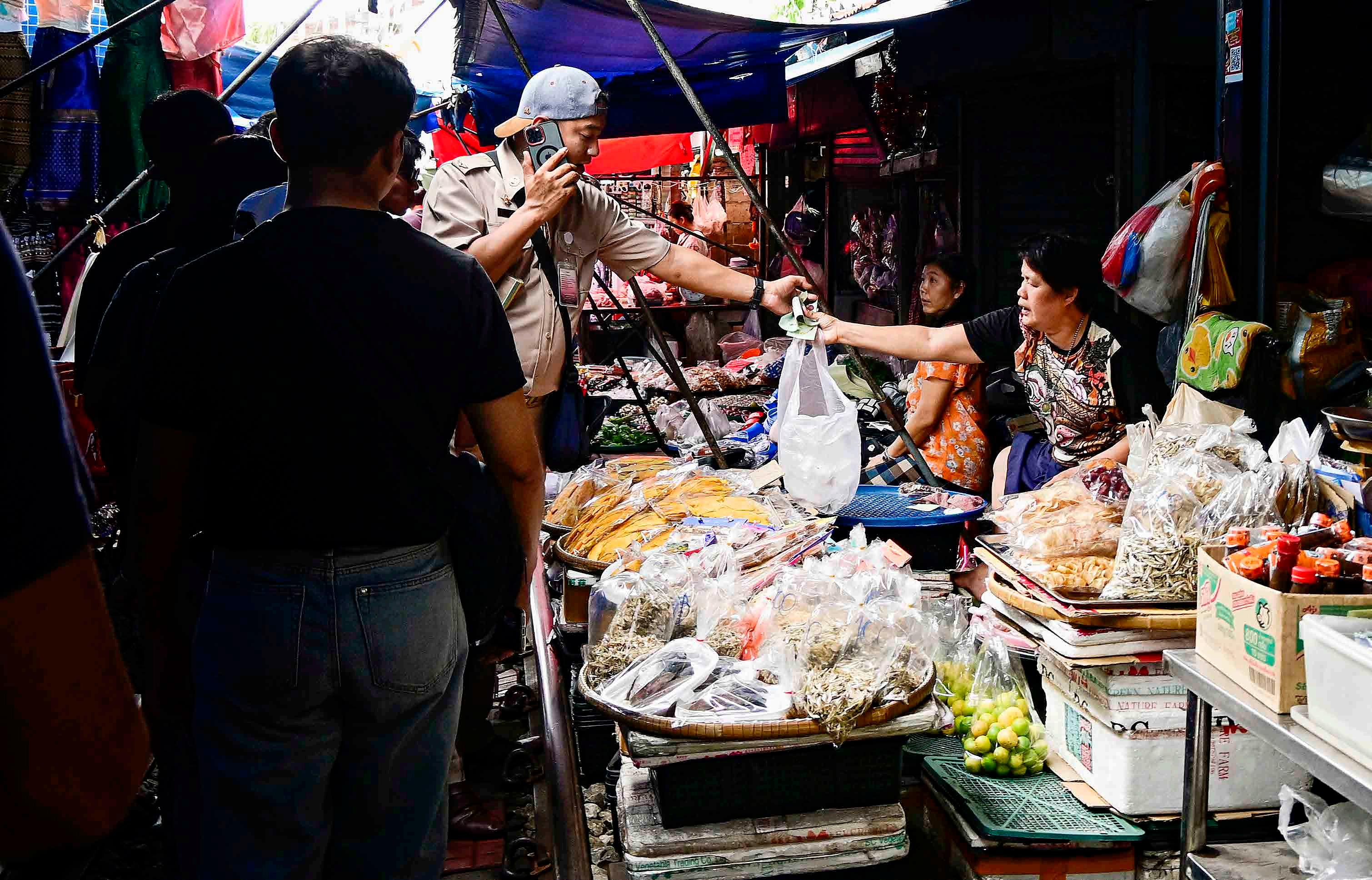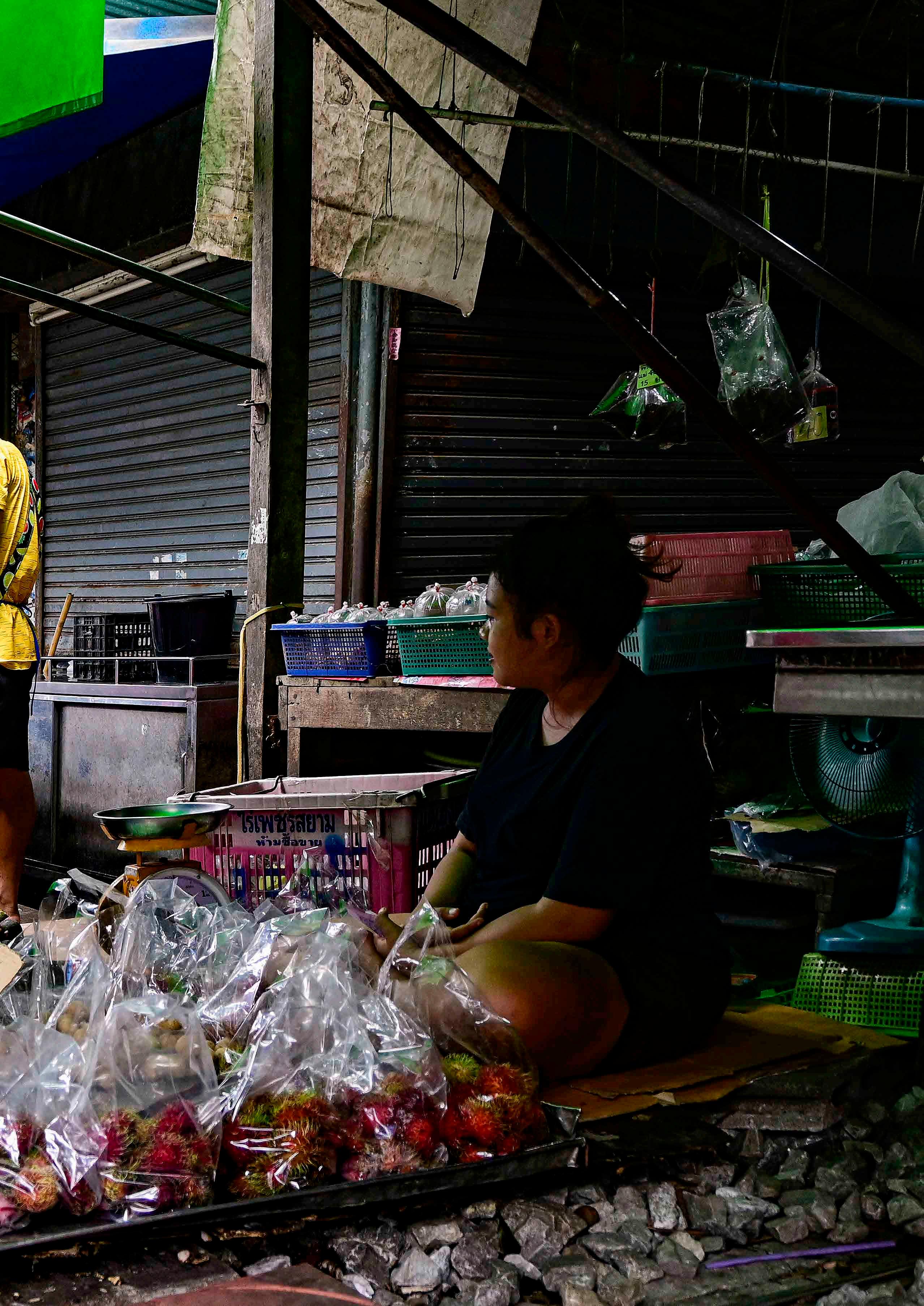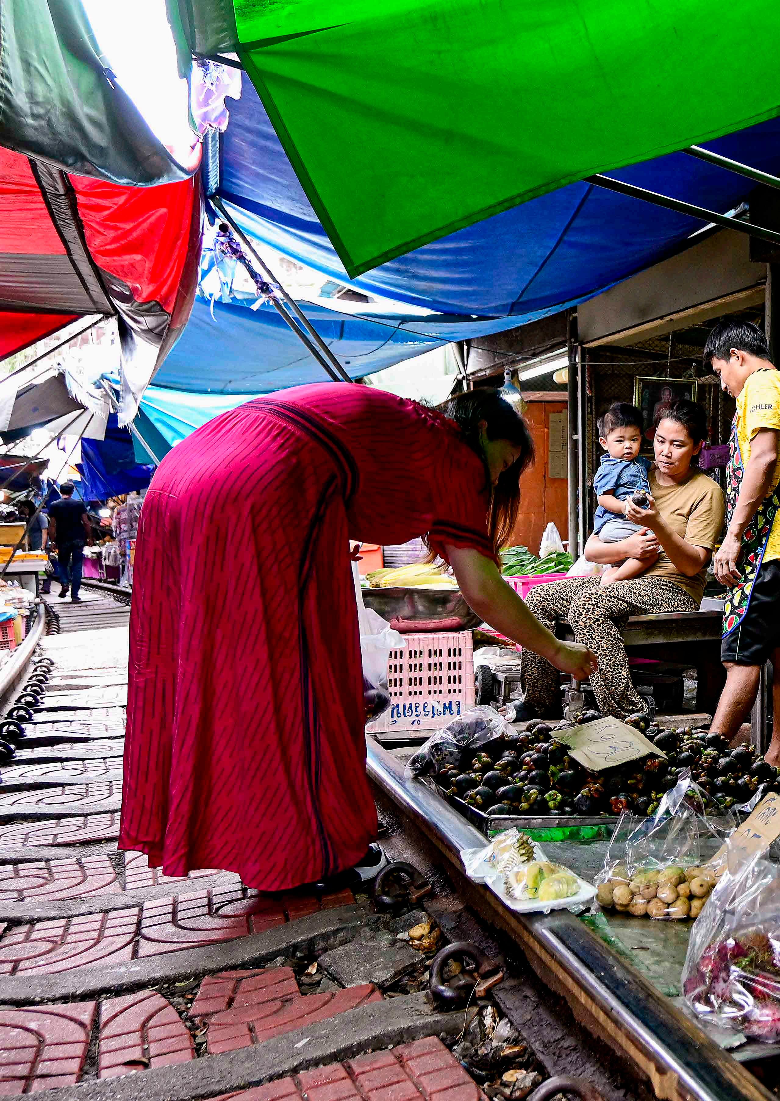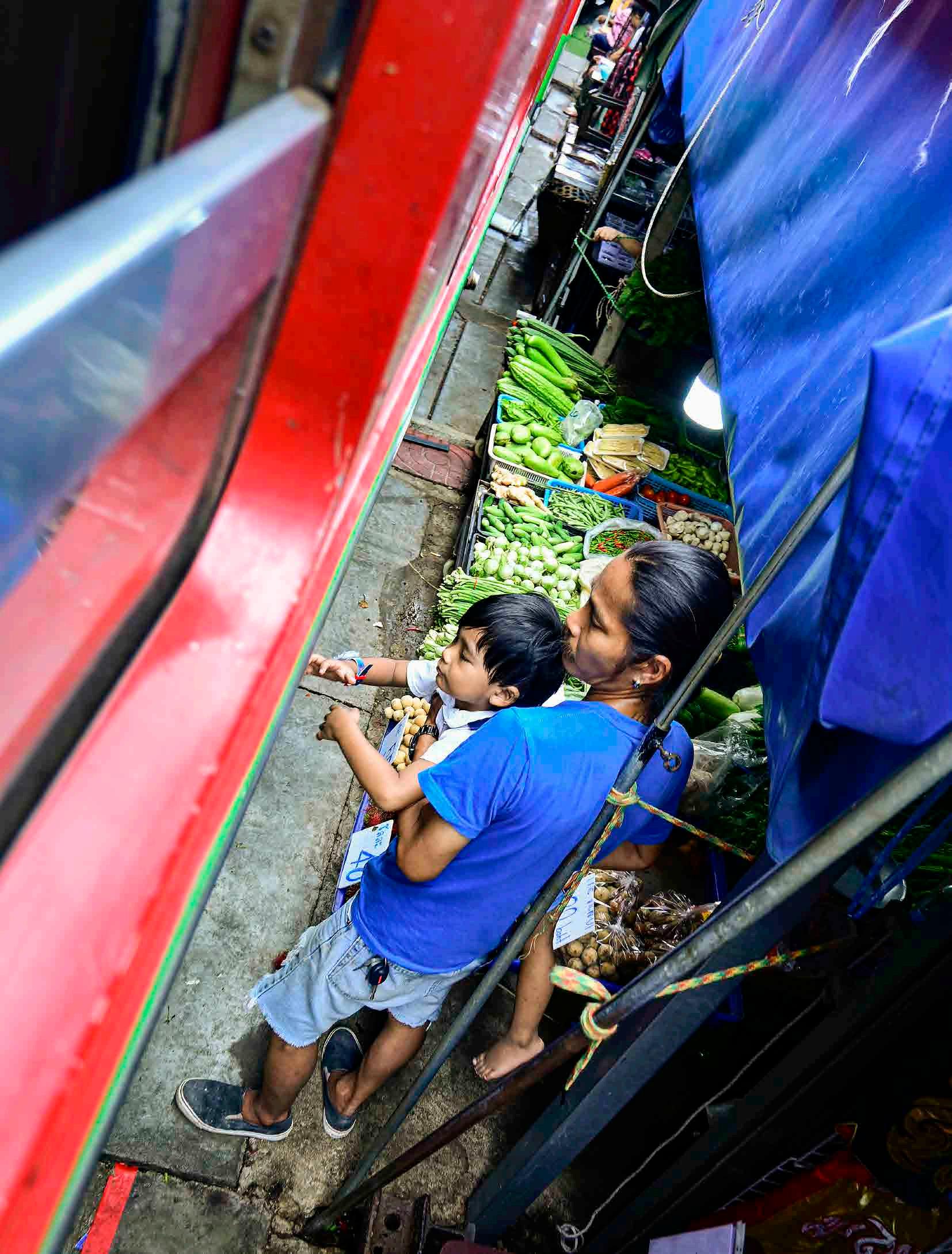Enquanto não passa o trem, o mercado é um típico mercado tailandês, o que inclui por vezes a presença de famílias de vendedores com crianças.