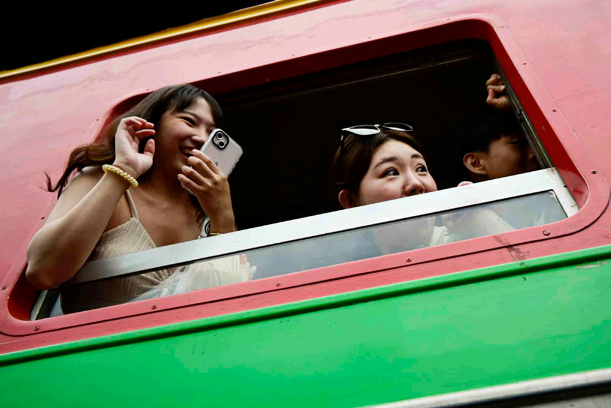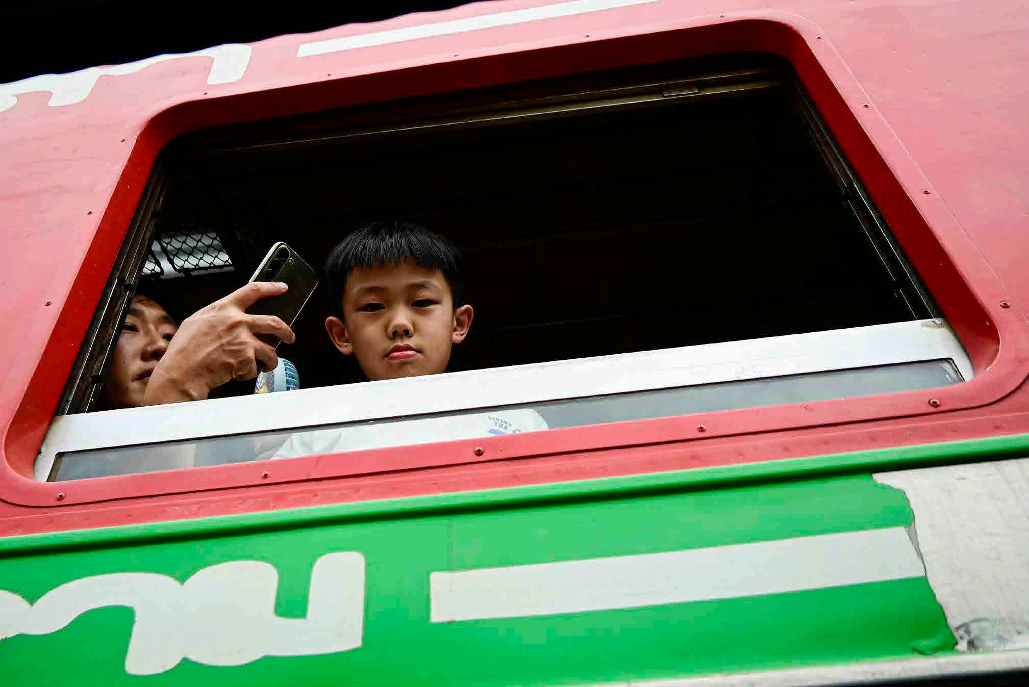 O trem passa tão perto - e também tão devagar - que é possível encostar nele, como faz o menino acima. Essa proximidade é um evento empolgante não só para centenas de turistas que se apinham junto aos trilhos e dentro do próprio trem (à direita), mas também para os locais que pausam suas vendas por alguns instantes.