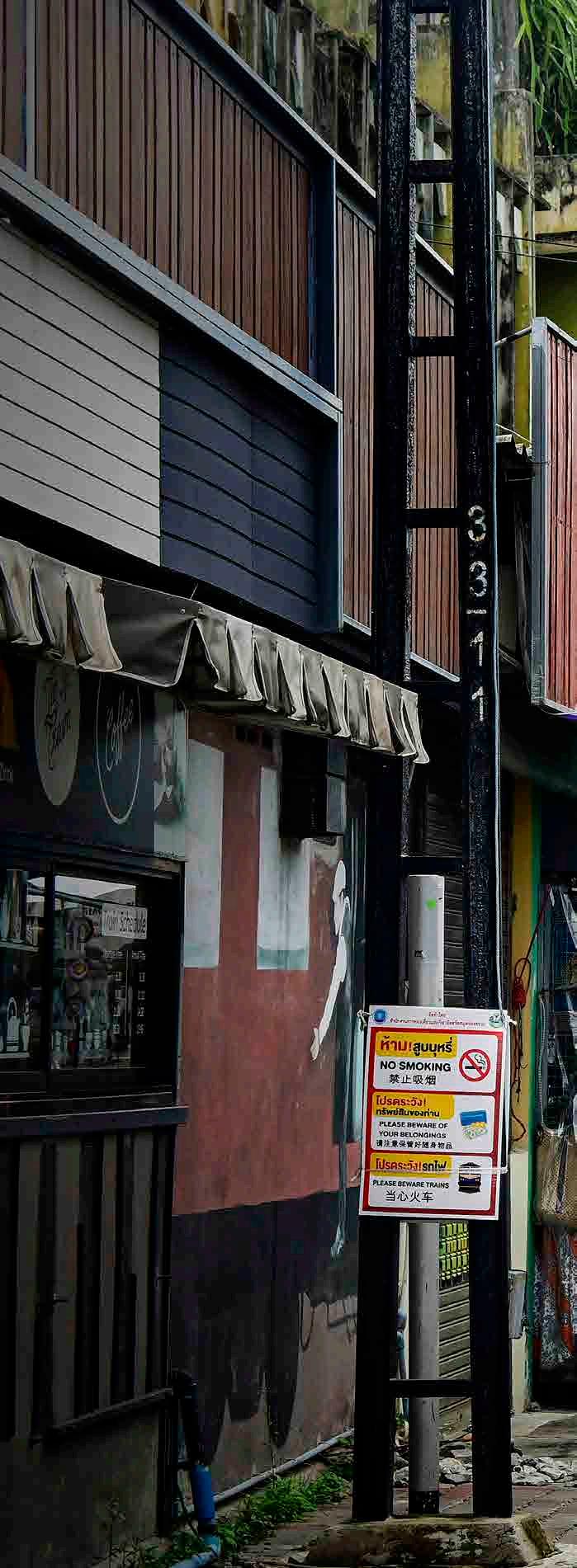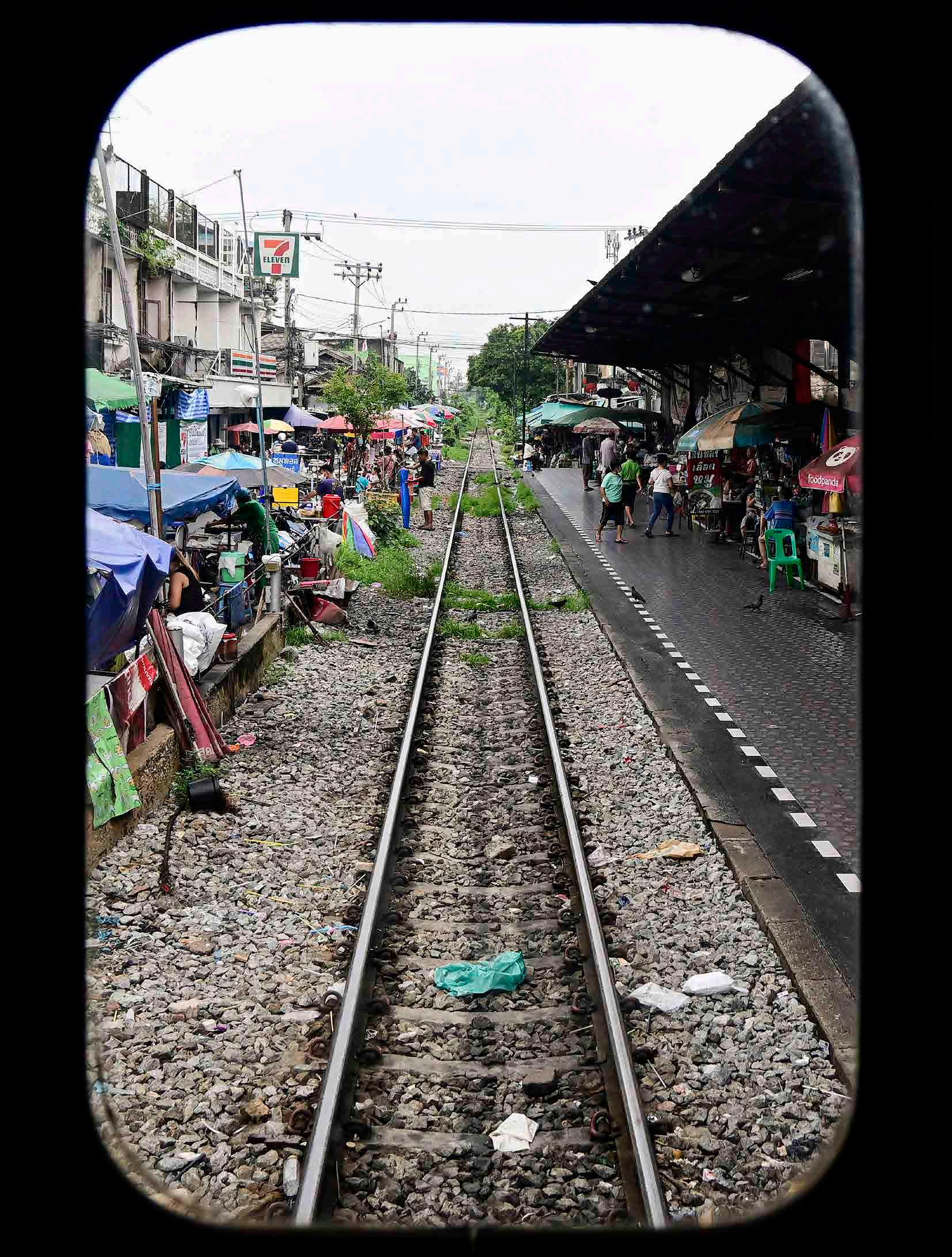 O trajeto entre Bangkok e Maklong percorre áreas de paisagens muito típicas da Tailândia central, incluindo a bagunça de barracas de rua ao redor dos trilhos (acima, pouco antes do tremp partir da estação inicial em Wongwian Yai, em Bangkok).