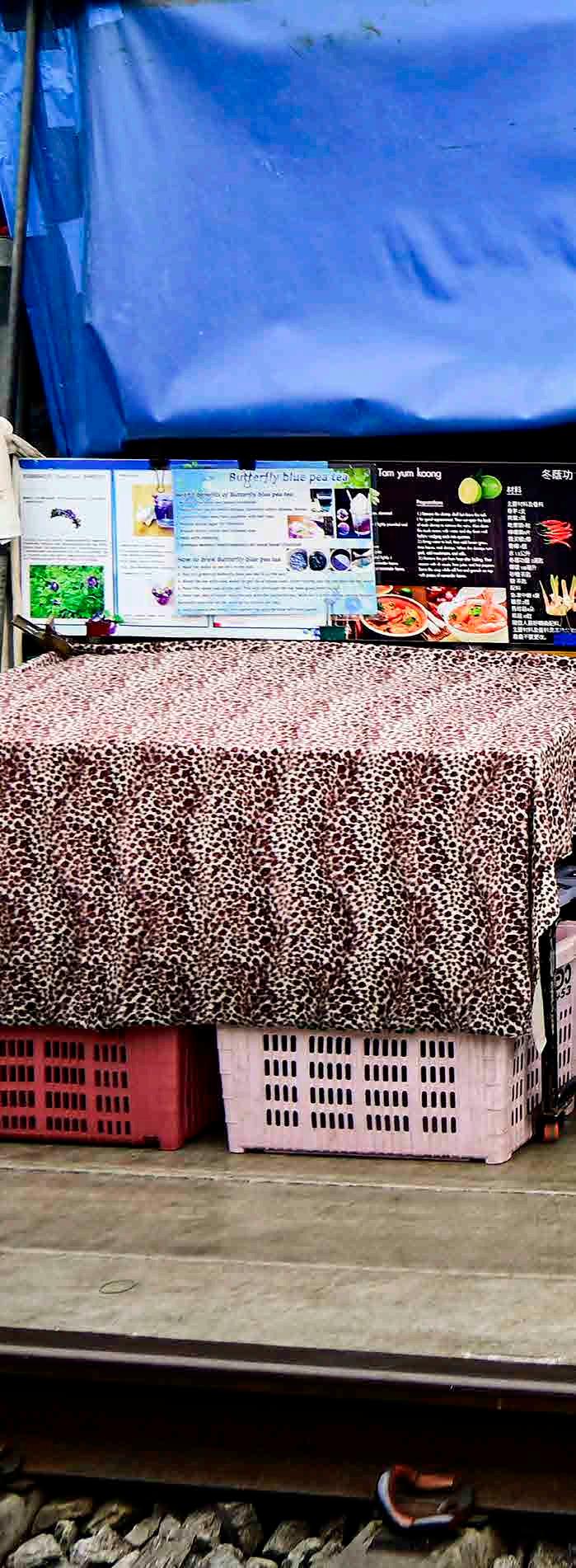 O mercado sobre os trilhos é conhecido pelos locais como Talad Rom Hub, que em Thai significa literalmente “o mercado dos guardachuvas puxados”. Bom, nesse caso os guardachuvas são as tendas de lona que recobrem a área dos trilhos. Quando o trem se aproxima, soa uma buzina e os mercadores rapidamente recolhem suas prateleiras com produtos e puxam as tendas, abrindo espaço para a passagem do gigante de ferro, que se aproxima bem devagar e vai passando a poucos centímetros das casas e também das pessoas que estão ali junto dos trilhos. Algumas cestas e bacias chegam a ser cobertas pelo assoalho do trem. Logo que atravessa o mercado, o trem para na estação final, logo adiante. E os mercadores voltam a fechar as tendas e colocam as prateleiras de volta, e o mercado volta a funcionar como se nada tivesse acontecido.