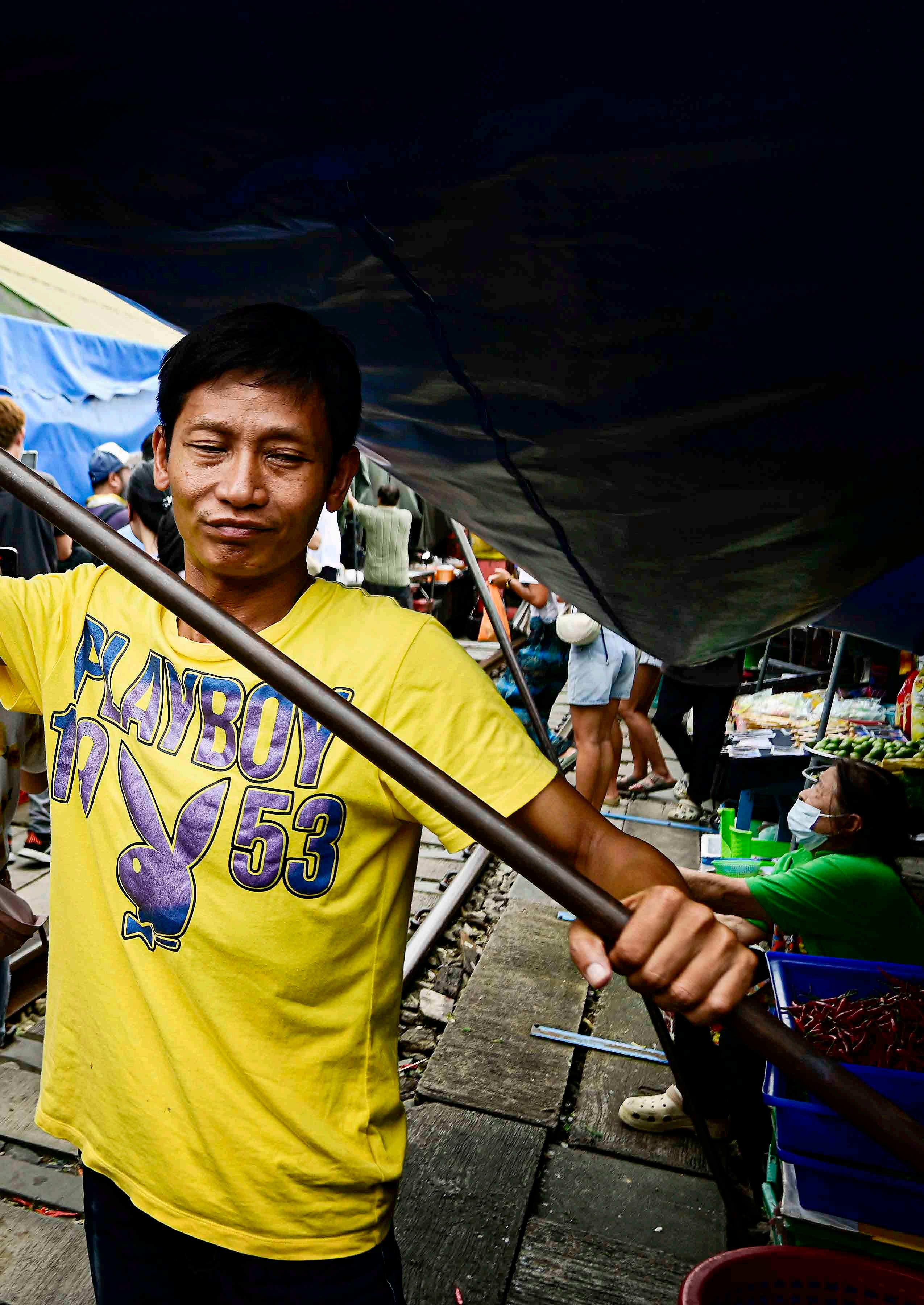 Um mercador puxa as hastes das tendas, abrindo passagem para o trem que se aproxima. Enquanto isso, dezenas de turistas circulam ao seu redor, encantados com esse processo tão comum e simples porém tão espetacular nesse contexto.