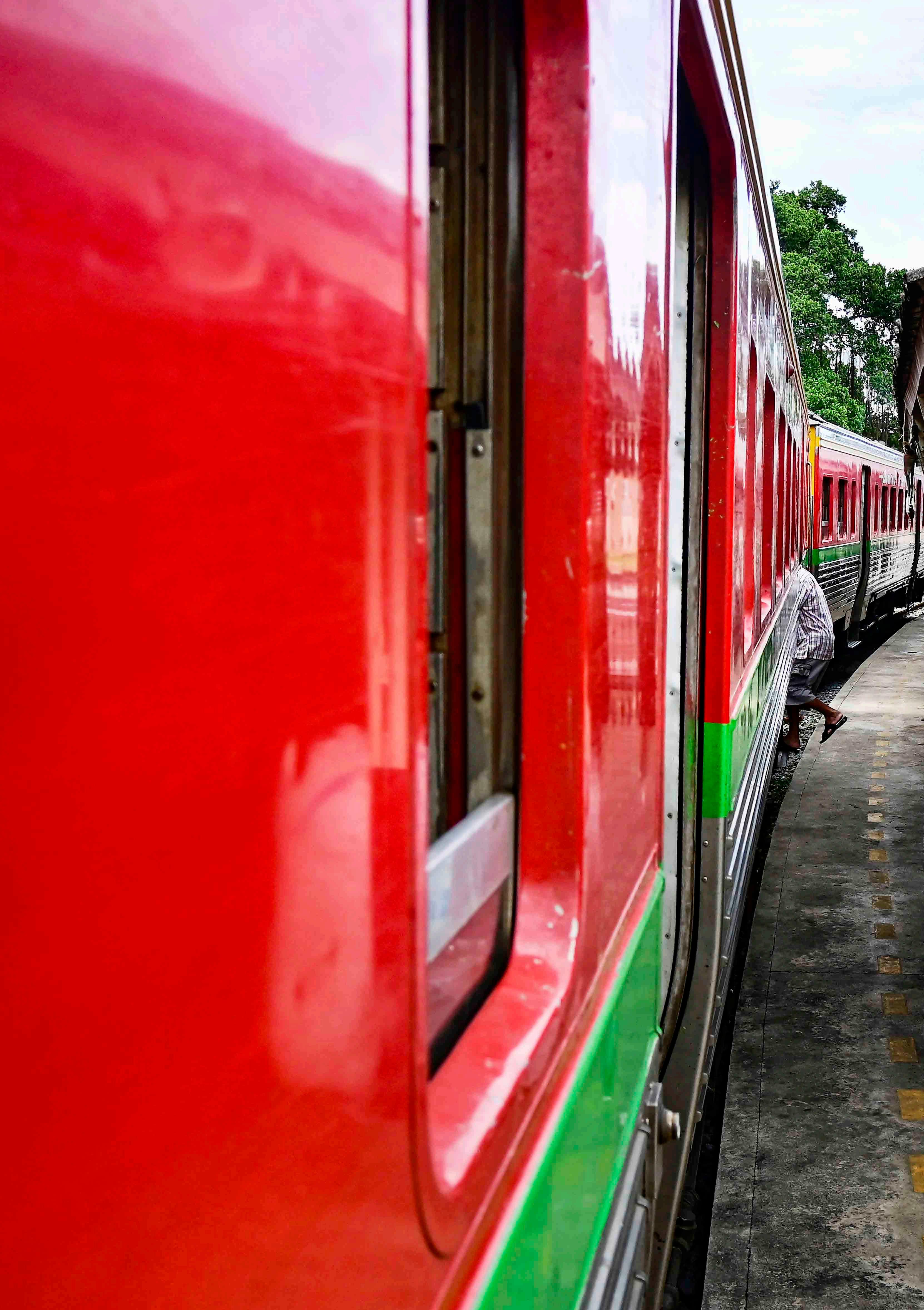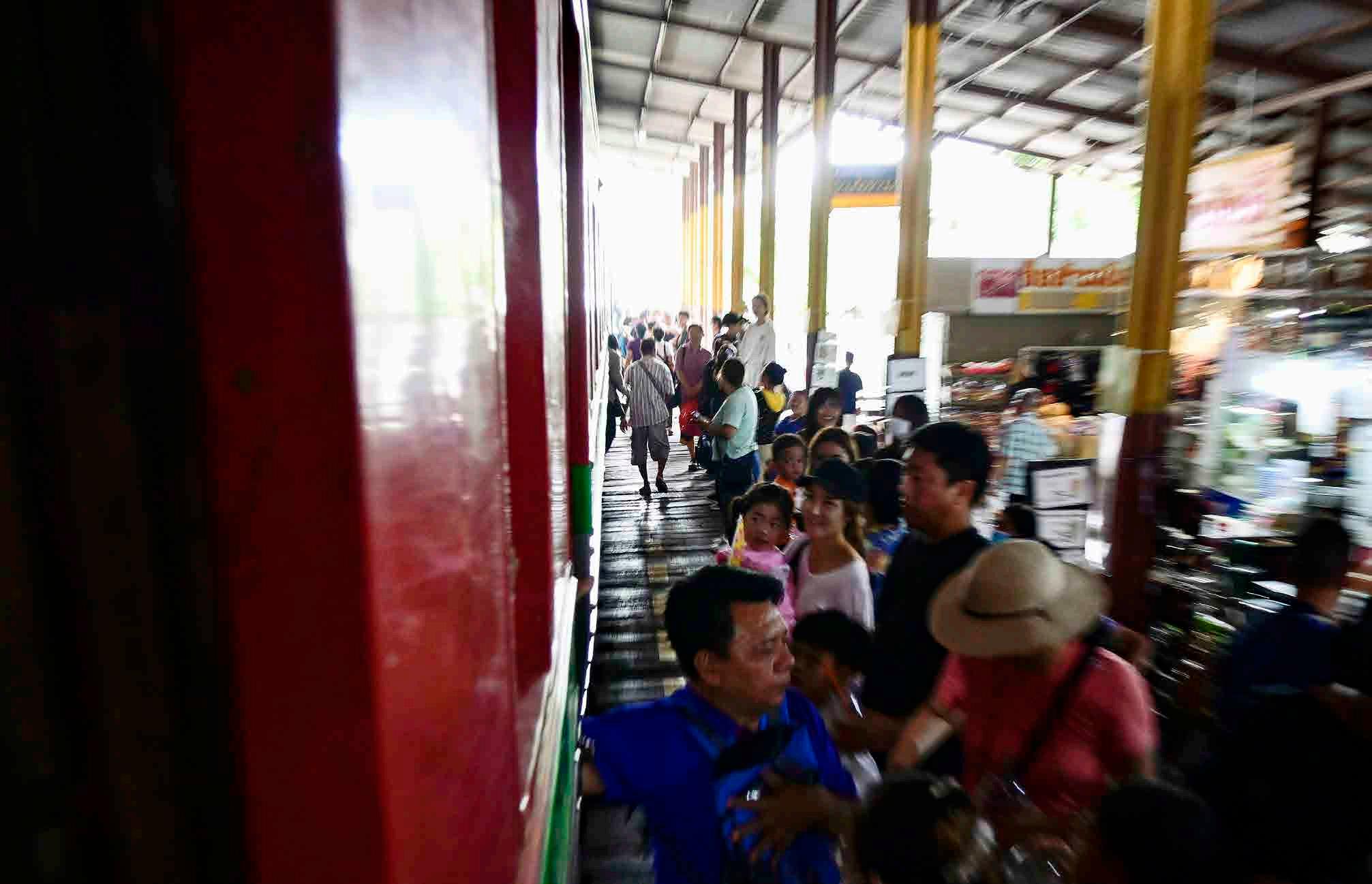 Os trens são trens convencionais da linha nacional tailandesa, e servem não só aos turistas, mas principalmente à população local como meio de transporte entre as vilas da região. À esquerda, homem embarcando em Ban Laem sentido Maeklomg.