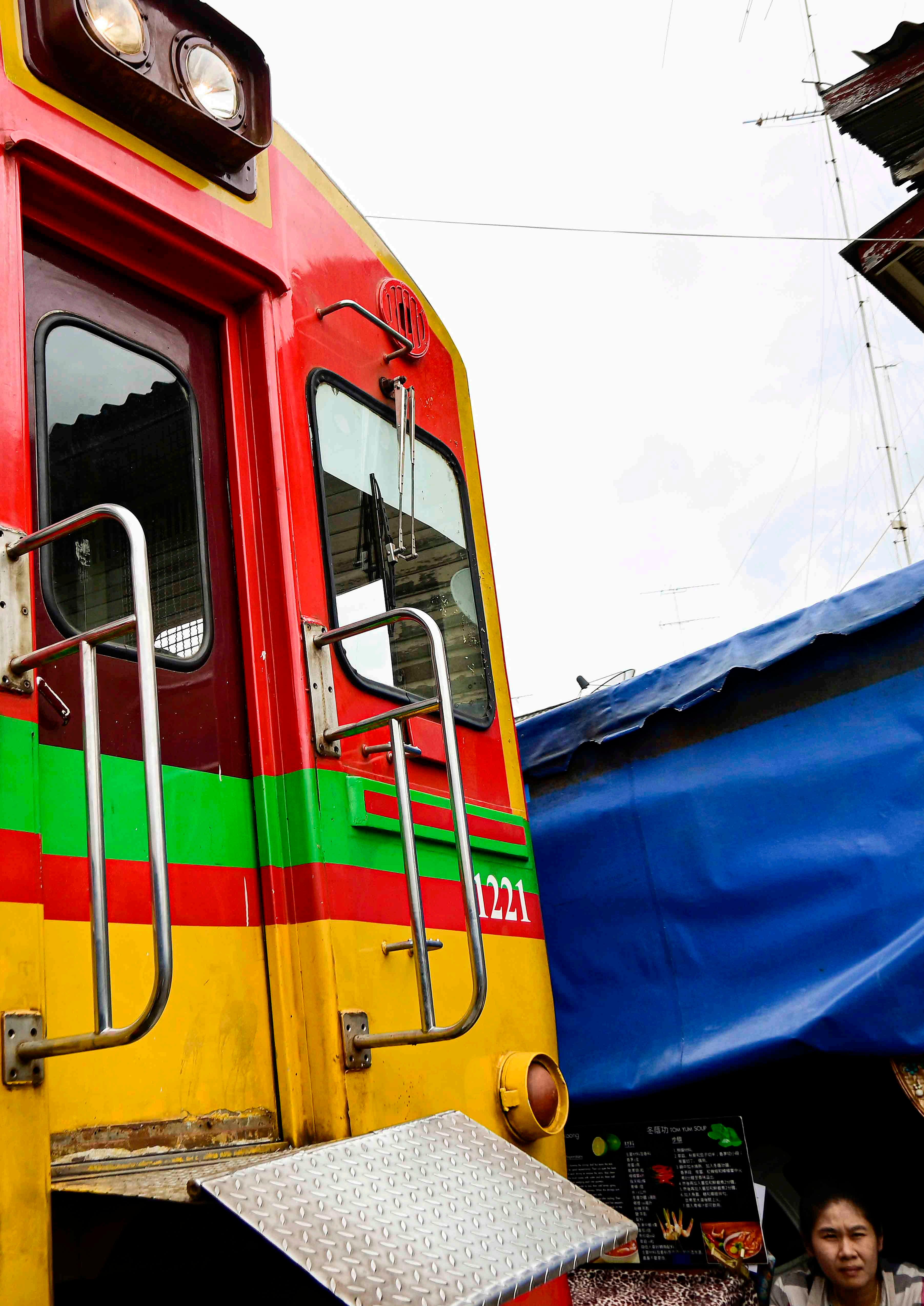 O momento icônico da passagem do trem em meio ao mercado de Maeklong, na província tailandesa de Samut Songkhram. O trem passa por cima de cestas de produtos e a centímetros de distância das estruturas e tendas.