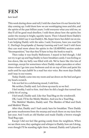 This week during show-and-tell, I told the class how it’s our favorite holiday coming up. I told them how we are worshipping trees and dirt, and the spirits of the past billion years. I told everyone what you told me, so they’ll all be good mud-dwellers. I told them about how the spirits live under the swamp in bright, squishy layers. Then I shared them Daddy’s book but I didn’t say it was Daddy’s. Ms. Soper knew but didn’t rat on me. I am helping Daddy with the sales. I said, Everyone, have you read Jim C. Darling’s Encyclopedia of Swamp Learning and Lore? And I told them they can read more about the spirits in the LEARNING section under “decomposition,” but that they’ll have to buy the book to read it. Then today it was finally Halloween. I stayed in bed though. I did not try to get up and beg Daddy to have breakfast candy. I was feeling so low-down, like my belly was filled with silt. We’ve been like this lots of mornings, except for sometimes when Daddy makes pancakes or other times when I go into your bedroom and sit on top of him and paint his nails until he says Judith! In a mad but nice voice. But most days Daddy and I stay in our rooms. Today Daddy came into my room and sat down on the bed and gave my head a scratch. I do not feel in a celebrating mood, I told him. Me neither, Daddy said. Let’s dress up exactly as we feel. I feel moldy, I said to him. And then he did a laugh that turned into a little bit of crying. I feel small, Daddy said. Like that Toad Bug on the windowsill. OK, I said. I’ll be the Moldy Maiden. And you be a Toad Bug. The Moldrin’ Maiden, Daddy said. The Maiden of Mud and Dark and Moldrin’ Places. After that, Daddy and I had candy bars for breakfast. Then Daddy got some mushrooms from the swamp and stuck them on my tiara from last year. And I took an old blanket and made Daddy a brown triangle Toad Bug cape. Except I did not feel like getting candy from the neighbors. When we see them now, they apologize and whisper to Daddy, how am I doing, even though I’ll be standing right there. Instead, Daddy and I played in 36