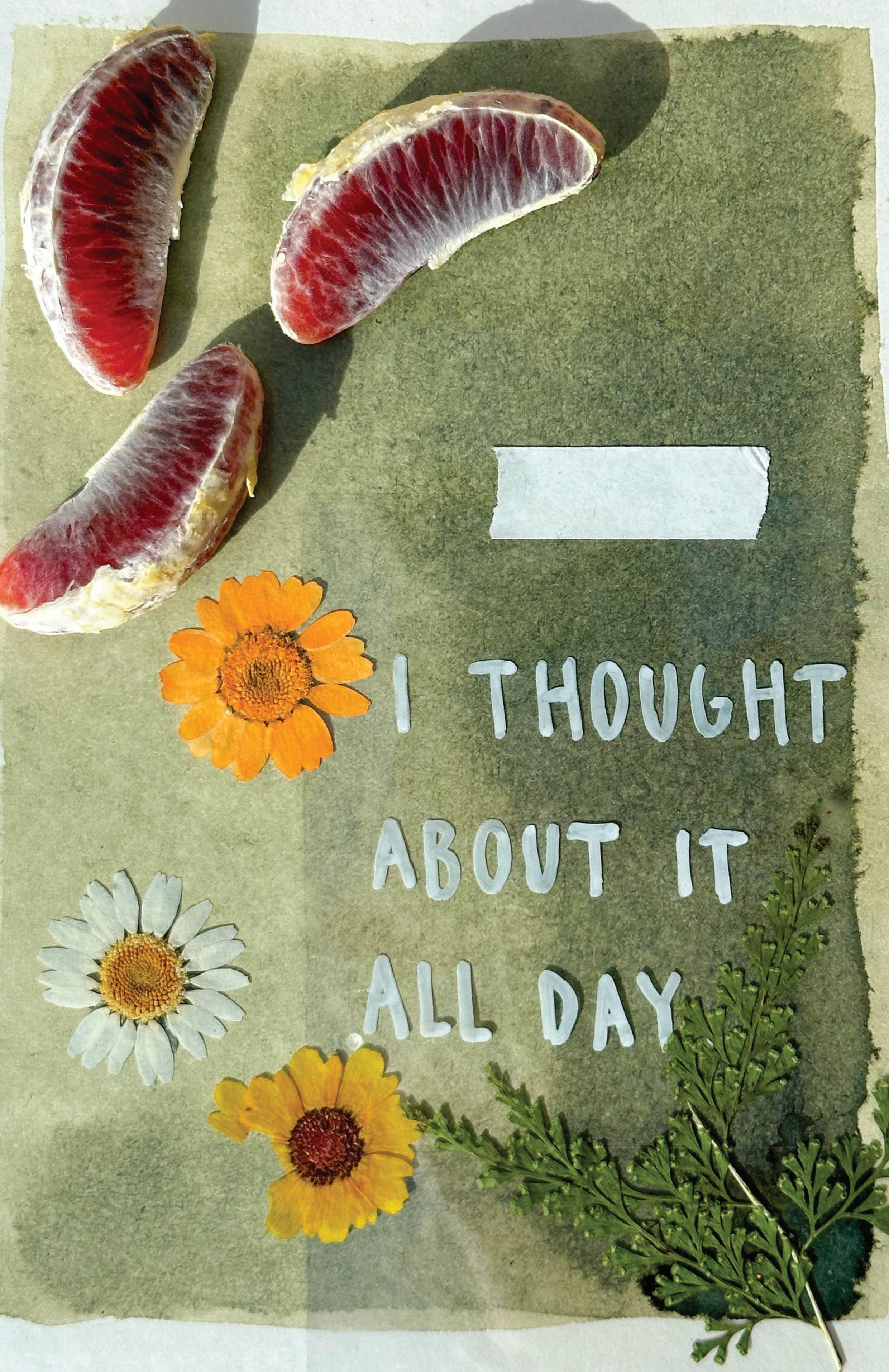 of jagged earth while pulling a California Poppy from the ground. Small moments strung together like the Christmas lights Dad left up year-round, said they were for New Years. Easter. The Fourth of July. I’m crying. It’s all supposed to add up to something. Why am I still crying?