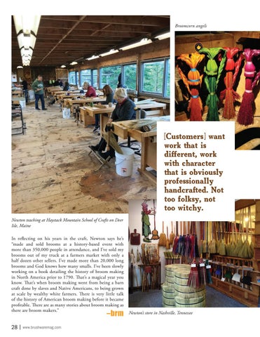 handcrafted. Not too folksy, not too witchy. Newton teaching at Haystack Mountain School of Crafts on Deer Isle, Maine In reflecting on his years in the craft, Newton says he’s “made and sold brooms at a history-based event with more than 350,000 people in attendance, and I’ve sold my brooms out of my truck at a farmers market with only a half dozen other sellers. I’ve made more than 20,000 long brooms and God knows how many smalls. I’ve been slowly working on a book detailing the history of broom making in North America prior to 1790. That’s a magical year you know. That’s when broom making went from being a barn craft done by slaves and Native Americans, to being grown at scale by wealthy white farmers. There is very little talk of the history of American broom making before it became profitable. There are as many stories about broom making as there are broom makers.”
