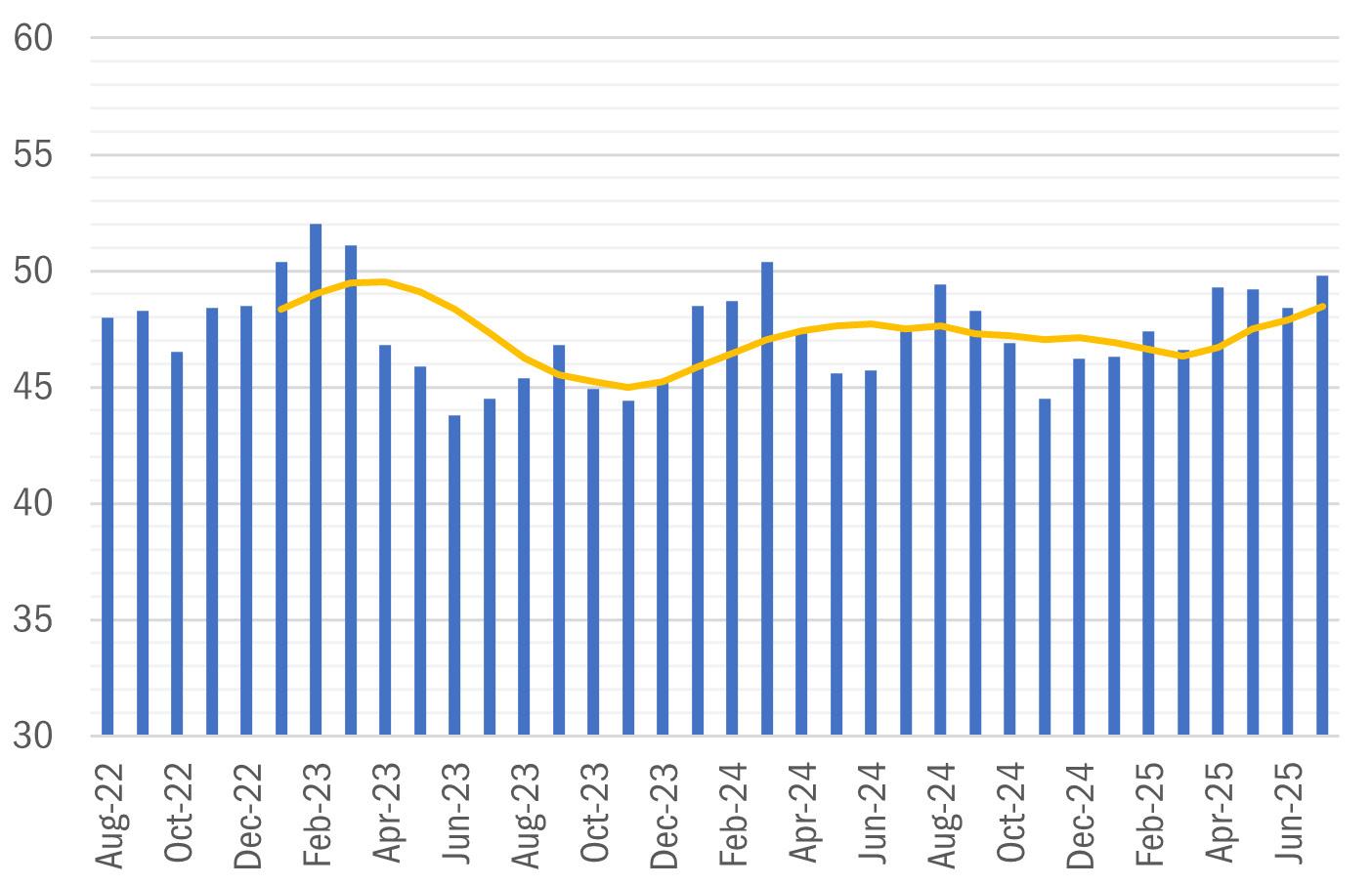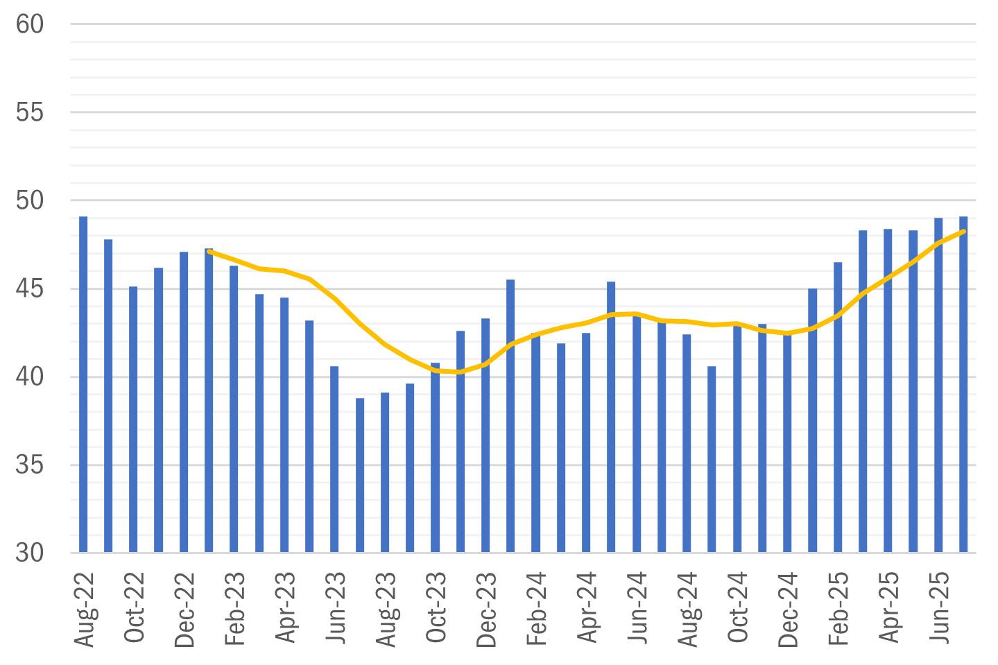 CANADA: Canada’s manufacturing sector remained under pressure in July, as the PMI rose slightly to 46.1 percent but continued to reflect persistent weakness driven by tariffs from the U.S. and domestic countermeasures. New orders and output contracted again, staffing cuts deepened, and firms remained cautious amid ongoing policy volatility despite easing input inflation.