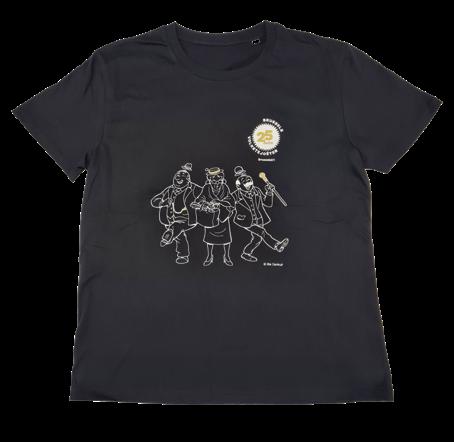 €25.00 incl. verzendkosten, €20.00 in et Oeis van’t Brussels Ter ere van het 25-jarig jubileum van het Brussels Volkstejoêter hebben we een nieuwe T-shirt laten maken. Op de voorkant staan de 3 bekendste personages uit het Brussels theater: Bossemans, Coppenolle en Madame Chapeau. Op de achterkant staan alle door het BVT gespeelde toneelstukken in chronologische volgorde opgelijst. tekening: Rik De Wulf