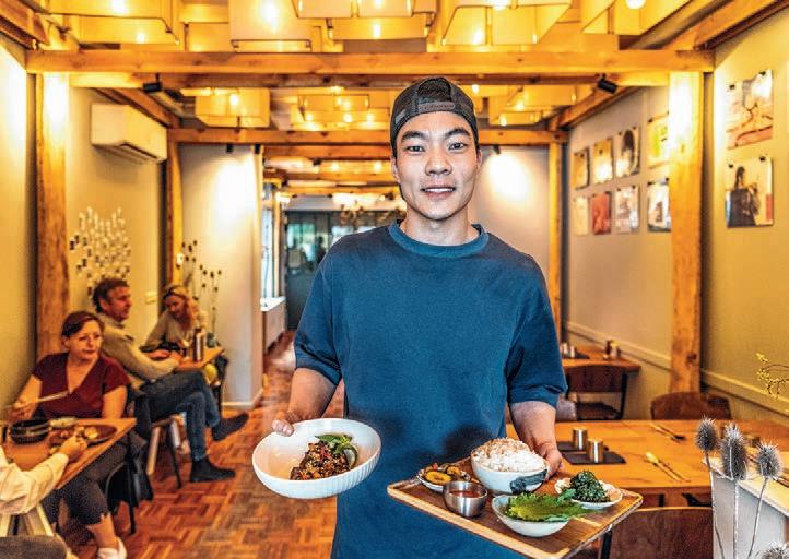 bij de gefrituurde kip (14 euro), de heerlijke pajeon-pannenkoeken (12 euro) en de werkelijk verslavende samgyetang (22 euro), een bouillon van kip met ginseng. De details die het verschil maken? Er zijn de heerlijke kruiden (bergamotkruid, citroenverbena …) die rechtstreeks uit de tuin van Sang Hoon Degeimbre komen – de chef die de hand had in de kaart, de uitvoerende chef-kok is Victor des Roseaux.