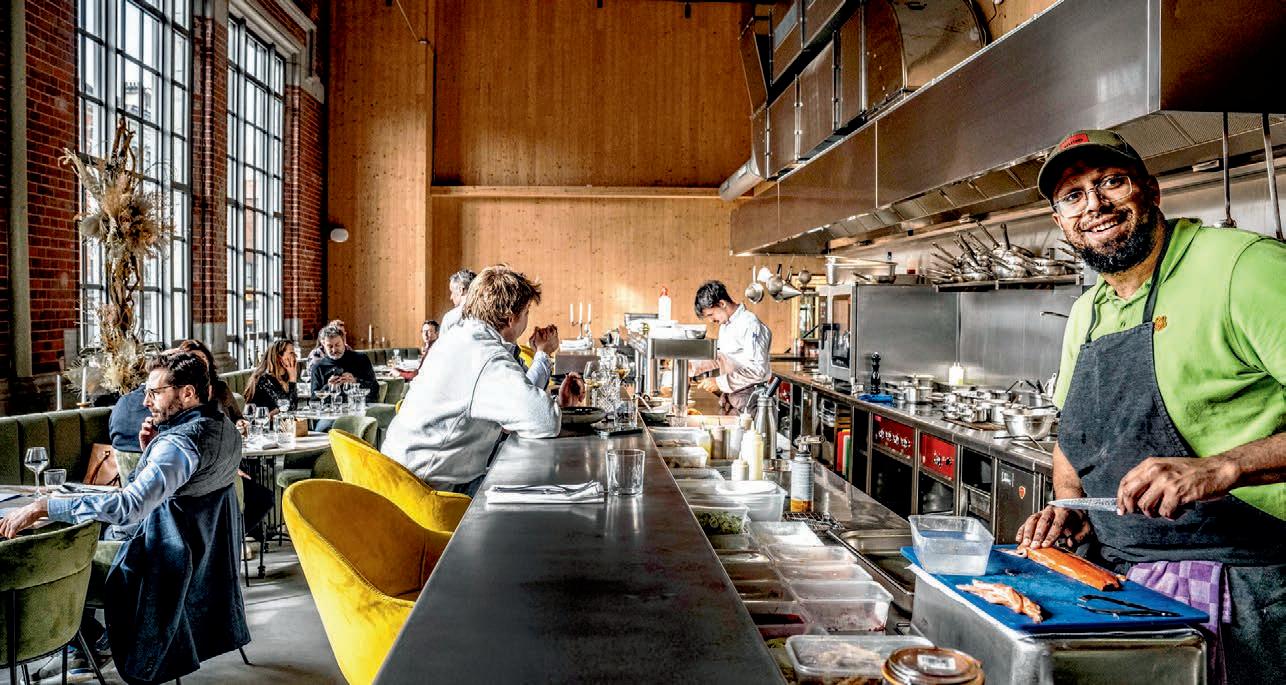 ken design. Gepolijst beton, zichtbare leidingen, koel licht: de esthetiek doet resoluut modern aan. Enkele planten verzachten het geheel, maar de sfeer blijft functioneel. Verderop bevindt zich een grotere, warmere ruimte die uitkijkt op de keuken. Jammer genoeg was die op de dag van ons bezoek gesloten tijdens de lunch.