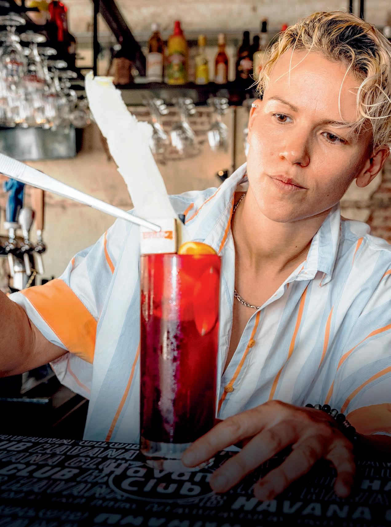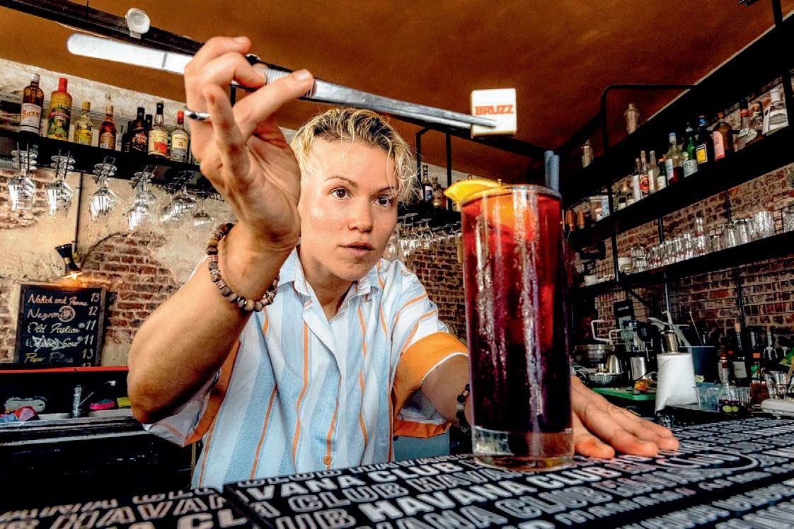 Britt Jent Mosselmans creëerde op vraag van BRUZZ een eigen cocktail. “Eenvoudig om te maken, verfrissend om te drinken: de BRUZZ cocktail is hét drankje voor de zomer in Brussel. Als basisingrediënt koos ik voor bissap: een dorstlesser gemaakt op basis van de hibiscusbloem en afkomstig uit West-Afrika. Mooi vurig rood qua steunkleur. De grapefruitlimonade zorgt voor de bubbels, de sprankeling en voor een subtiele citrustoets. De rode vermout creëert diepgang en een langere afdronk, de witte tequila verrast met een extra kick. De versiering van witte chocolade – optioneel – kunnen de kids maken. Kortom, heerlijk verrassend, helemaal BRUZZ.”