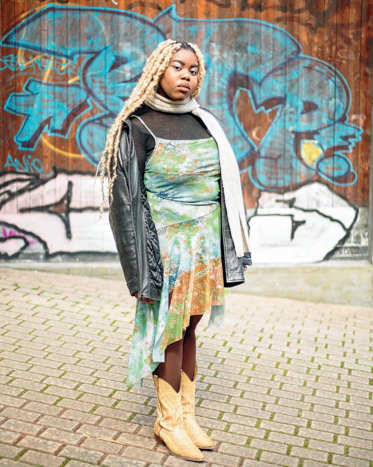 Ik zou mijn stijl omschrijven als een mix van kleurrijke, op de jaren 1970 en ’90 geïnspireerde looks, met een vleugje ‘sprookjesachtige’ vibes. Ik hou van patronen, zachte stoffen en klaprozen. Mijn inspiratie haal ik ook uit de clubscene en de Congolese Sapologie-beweging. 85% van mijn garderobe is zuinig! Voor mij is het belangrijkste aan mode dat ik me op mijn gemak voel. Jij draagt de kleren, laat de kleren jou niet dragen. Met deze mentaliteit kan je alles aan!