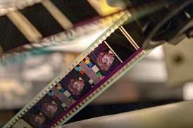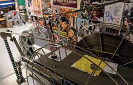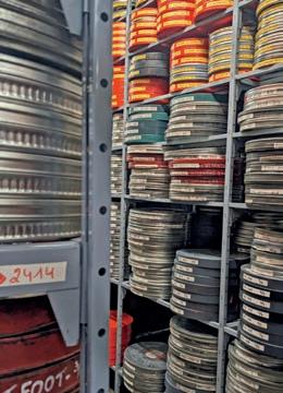 Kasten met bobijnen uit de collectie, peliculestrook in projectieruimte van CINEMATEK, peliculespoelen in projectieruimte CINEMATEK.